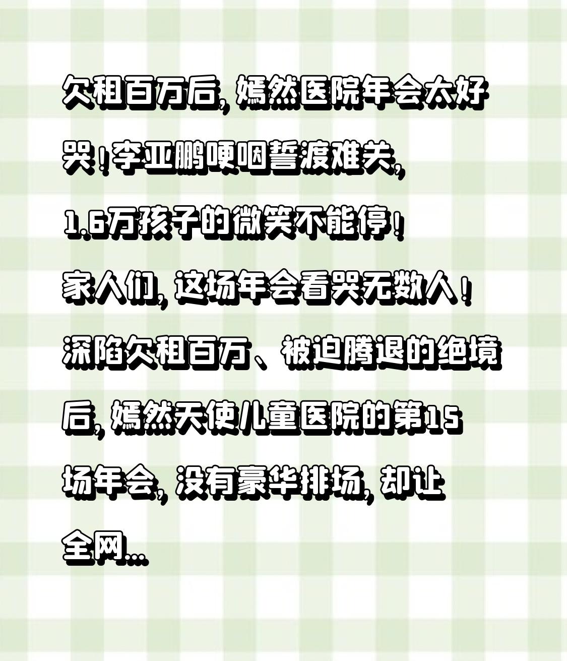 欠租百万后,嫣然医院年会太好哭!李亚鹏哽咽誓渡难关,1.6万孩子的微笑不能停! 家人们,这场年会看哭无数人!深陷欠租百万、被迫腾退的绝境后,嫣然天使儿童医院的第15场年会,没有豪华排场,却让全网破防——李亚鹏站在熟悉的大厅里几度哽咽,一句“我想我们应该是可以渡过这个难关”,戳中了无数人的心! 谁能想到,这家帮1.6万唇腭裂孩子找回笑容的公益医院,如今正面临“可能是最后一次在这个大厅办年会”的困境。此前法院公告责令医院腾退场地,李亚鹏作为担保人要承担270万租金连带责任,门诊量直接腰斩,连正常运营都难以为继。可年会现场没有卖惨,反而处处是温暖的坚守:内蒙古的捐赠人开车千里赶来,广州的朋友连夜送来防寒服,医护人员穿着白大褂合唱《明天会更好》,台下坐着的还有曾被救助的患儿和家长。 最让人泪目的转折点来了!就在大家以为医院要停摆时,好消息接连传来:朝阳区政府全力协调,不仅帮忙对接新院址,还在协商房租减免;核心候选新址是超1万平米的现成医院,九成新设备齐全,房东更是愿意免费提供部分场地;短短20多天,18万名网友捐款900万,足够支持1000台免费手术!李亚鹏更是把直播带货的29万收入全捐出来,直言“承担了太多厚爱,一定要把这事干下去”。 这不是一场普通的年会,而是一场公益接力的誓师大会。从2006年嫣然基金成立,到2012年医院落地,20年来他们的脚步从未停过:医疗队跋涉2万公里,深入西藏、甘肃等偏远地区,2025年就完成800台手术和1379节语音康复课,7000名孩子免费重获微笑。那些曾经因唇腭裂自卑的孩子,如今能自信说话、正常上学,这就是医院拼尽全力也要坚持的意义。 更难得的是他们的透明与真诚:医院明确表示,新址确定后会全面公开募款细节,每一笔善款都将依法公示,确保用在孩子的手术和康复上。没有含糊其辞,没有借机炒作,只有实打实的公益初心。 其实我们之所以被打动,是因为看到了困境中的微光:1.6万张重绽的笑脸,18万份陌生人的善意,还有一群人20年不放弃的坚守。公益从来不是一个人的全力以赴,而是无数人的力所能及。医院可以换地址,但守护微笑的初心不能变;资金可以凑,但1.6万孩子背后更多等待救助的家庭,不能没有希望。 评论区说说,你被这场年会的哪个瞬间打动了?你愿意为这些孩子的微笑转发助力吗?点赞关注,一起期待嫣然医院的新址落地,让这份跨越20年的公益接力,继续温暖更多孩子!