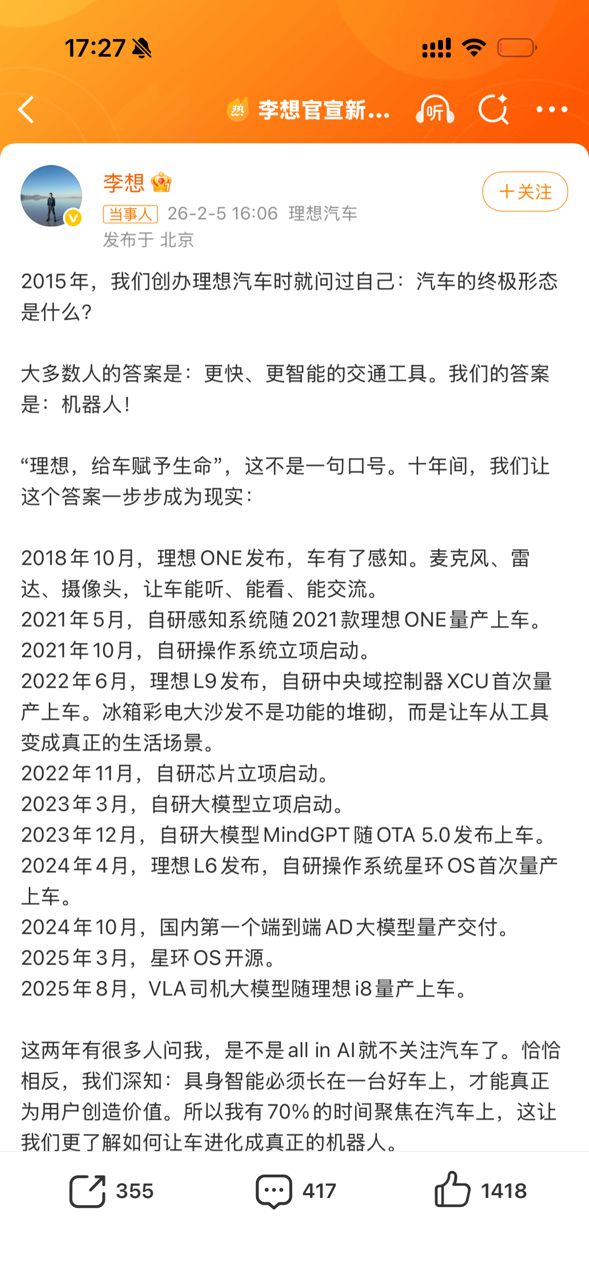 李想发的十年复盘,思路很清晰:先把车的基本功做扎实,再让车一步步活过来