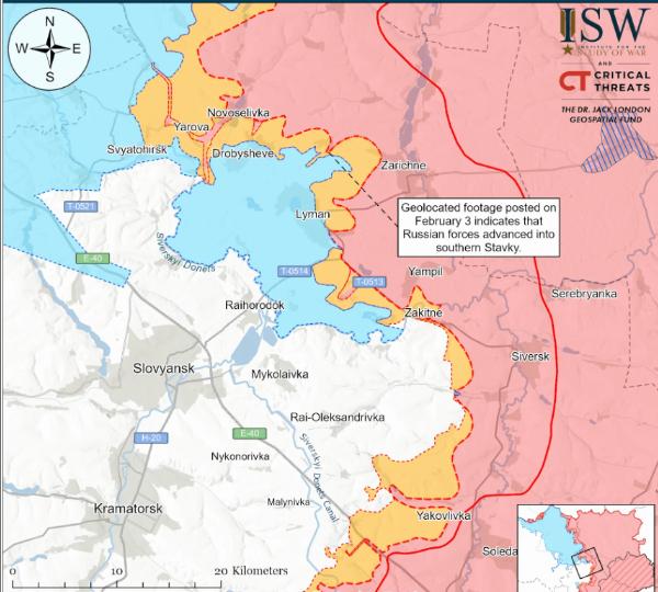 决战双子城之外围争夺:俄军装备无人机航母 根据2月3日发布的地理定位视频证实,俄军近期已成功向斯塔夫基南部(见图)推进,这一进展为俄军进一步向斯拉维扬斯克方向施压奠定了基础。与此同时,俄罗斯军事博主于2月3日披露,俄军已向索斯诺韦东北部(利曼西北部)和尼基福里夫卡南部推进,但该消息目前尚未得到权威渠道证实。 针对俄第85摩托化步兵旅已于2月2日占领尼基福里夫卡的说法,另一名俄罗斯军事博主于2月3日予以驳斥,明确指出俄军目前仍在对该定居点进行清剿作业,部分乌克兰部队仍在当地保持有限驻守,双方在该区域的控制权争夺尚未结束。 在斯拉维扬斯克方向,2月2日至3日期间,俄军在靠近圣波克罗夫斯克、里兹尼基夫卡和普拉托尼夫卡的区域活动频繁,并向卡列尼基方向推进,形成了向东渗透的态势;在东南部,俄军则依托尼基福里夫卡周边区域,向迪布罗瓦和赖-奥列克桑德里夫卡方向发起进攻,逐步缩小对斯拉维扬斯克的包围圈。 在康斯坦丁诺夫卡方向,有未经证实的报道称,俄军已向奥列克桑德罗-卡利诺韦(康斯坦丁诺夫卡以南)西北方向及亚布卢尼夫卡(康斯坦丁诺夫卡西南)以北推进,进一步压缩乌军防御空间。 目前,俄军的无人机战术应用出现重大突破——首次将“非洲菊”无人机作为“母船”,搭载FPV打击或侦察无人机深入乌克兰后方区域,标志着俄军在无人机作战领域的战略升级,对战场态势产生深远影响。 乌克兰国防部国防技术顾问、无人机与电子战专家谢尔盖·“弗拉什”·贝斯克雷斯特诺夫于2月3日证实,俄军首次使用“非洲菊”无人机作为母船搭载FPV无人机执行任务,由于乌军未能找到该FPV无人机本体,目前尚无法确定其具体用途为打击还是侦察。据俄罗斯军事博主披露,“非洲菊”无人机作为俄罗斯“天竺葵”无人机的低成本诱饵版本,最大航程可达300至600公里,显著优于俄军此前使用的“闪电”固定翼FPV无人机等母船平台(后者航程远短于“非洲菊”)。 事实上,俄军此前已尝试使用其他无人机作为母船执行任务,例如2025年10月初曾使用该战术对扎波罗热市发动袭击,但此次启用“非洲菊”无人机作为母船,凭借其超长航程优势,能够将小型FPV无人机投送至更远的乌克兰后方区域,大幅拓展了俄军的侦察与打击半径。 当前,俄军正逐步加大母船无人机的应用频次,核心目标是通过纵深侦察,为针对乌军训练场、防空系统、火箭炮阵地、人员集结点及移动目标的精准打击提供支撑,而“非洲菊”母船无人机的投入使用,将使俄军能够深入乌克兰更深远的后方区域,锁定更多高价值、高难度打击目标。 从战场影响来看,“非洲菊”母船无人机的应用对乌军防御体系构成严峻挑战。由于乌军难以在深远后方动用防空系统拦截小型FPV无人机,且电子战系统难以应对这种地理上广泛分布的威胁,乌军对拦截无人机和点防御防空系统的需求急剧上升。此外,“非洲菊”无人机本身具有低成本、可大规模生产的特点(单架成本仅500至2000美元),俄军可通过饱和式投放形成经济不对称优势,持续消耗乌军的防空导弹库存与防御精力。 (本文部分参考战争研究所报告)