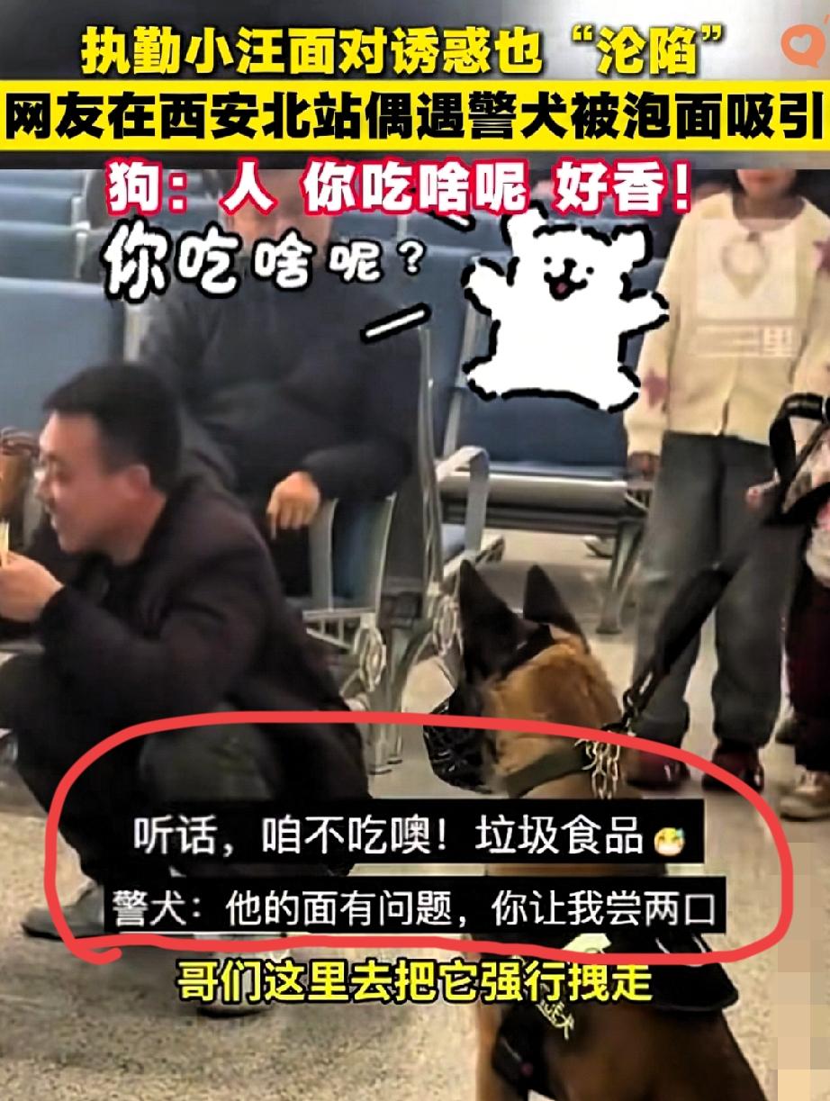 太有趣了! 谁能想到,威风凛凛的警犬,居然被一桶泡面拿捏得死死的! 2月1日西安火车站,一男子候车时泡了桶面,香味一飘,正在执勤的警犬直接“叛变”,蹲在跟前不肯走,眼睛直勾勾盯着泡面,训导员拉都拉不动,只能尴尬解释:它没吃过这玩意儿! 平时看警犬都是勇猛帅气,执行任务一丝不苟,没想到在美食面前,也和普通小狗没啥两样,瞬间卸下“高冷”,露出馋嘴模样,这反差感真的太戳人了。 其实再厉害的小家伙,也抵不过人间烟火气,这份真实的可爱,反倒让警犬更接地气了。 你家毛孩子有没有为了吃的,干过这种丢人的事?评论区聊聊~