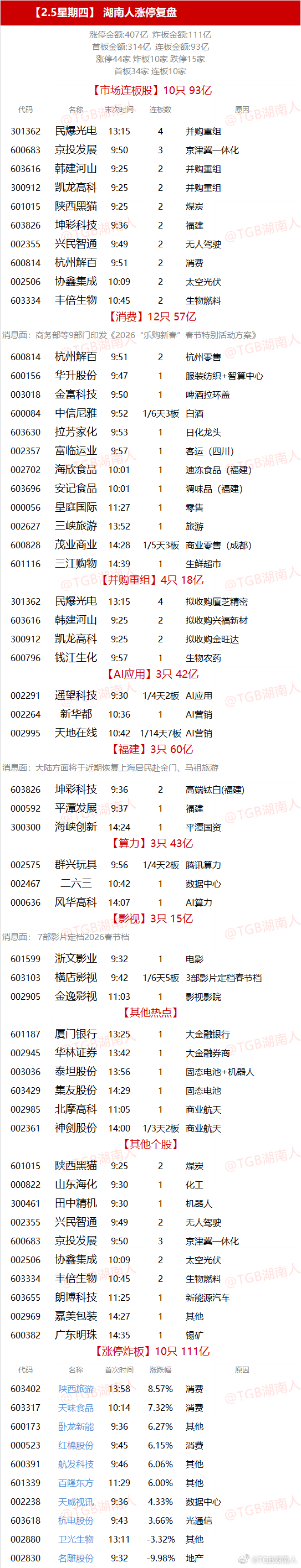 【2.5星期四】 湖南人涨停复盘 "涨停金额:407亿 炸板金额:111亿首板金额:314亿 连板金额:93亿涨停44家 炸板10家 跌停15家首板34家 连板10家" 【市场连板股】10只 93亿 代码 名称 末次时间 连板数 原因301362 民爆光电 13:15 4 并购重组600683 京投发展 9:50 3 京津冀一体化603616 韩建河山 9:25 2 并购重组300912 凯龙高科 9:25 2 并购重组601015 陕西黑猫 9:25 2 煤炭603826 坤彩科技 9:36 2 福建002355 兴民智通 9:49 2 无人驾驶600814 杭州解百 9:51 2 消费002506 协鑫集成 10:09 2 太空光伏603334 丰倍生物 10:45 2 生物燃料【消费】12只 57亿 消息面:商务部等9部门印发《2026“乐购新春”春节特别活动方案》 600814 杭州解百 9:51 2 杭州零售600156 华升股份 9:47 1 服装纺织+智算中心003018 金富科技 9:50 1 啤酒拉环盖600084 中信尼雅 9:52 1/6天3板 白酒603630 拉芳家化 9:53 1 日化龙头002357 富临运业 9:57 1 客运(四川)002702 海欣食品 10:01 1 速冻食品(福建)603696 安记食品 10:01 1 调味品(福建)000056 皇庭国际 11:27 1 零售002627 三峡旅游 13:52 1 旅游600828 茂业商业 14:28 1/5天3板 商业零售(成都)601116 三江购物 14:39 1 生鲜超市【并购重组】4只 18亿 301362 民爆光电 13:15 4 拟收购厦芝精密603616 韩建河山 9:25 2 拟收购兴福新材300912 凯龙高科 9:25 2 拟收购金旺达600796 钱江生化 9:57 1 生物农药【AI应用】3只 42亿 002291 遥望科技 9:30 1/4天2板 AI应用002264 新华都 10:36 1 AI营销002995 天地在线 10:42 1/14天7板 AI营销【福建】3只 60亿 消息面:大陆方面将于近期恢复上海居民赴金门、马祖旅游 603826 坤彩科技 9:36 2 高端钛白(福建)000592 平潭发展 9:37 1 福建300300 海峡创新 14:24 1 平潭国资【算力】3只 43亿 002575 群兴玩具 9:56 1/4天2板 腾讯算力002467 二六三 10:42 1 数据中心000636 风华高科 14:07 1 AI算力【影视】3只 15亿 消息面: 7部影片定档2026春节档 601599 浙文影业 9:32 1 电影603103 横店影视 9:42 1/6天5板 3部影片定档春节档002905 金逸影视 11:03 1 影视影院【其他热点】 601187 厦门银行 13:25 1 大金融银行002945 华林证券 13:42 1 大金融券商003036 泰坦股份 13:56 1 固态电池+机器人603429 集友股份 14:29 1 固态电池002985 北摩高科 11:05 1 商业航天002361 神剑股份 14:00 1/3天2板 商业航天【其他个股】 601015 陕西黑猫 9:25 2 煤炭000822 山东海化 9:30 1 化工300461 田中精机 9:30 1 机器人002355 兴民智通 9:49 2 无人驾驶600683 京投发展 9:50 3 京津冀一体化002506 协鑫集成 10:09 2 太空光伏603334 丰倍生物 10:45 2 生物燃料603655 朗博科技 11:25 1 新能源汽车002969 嘉美包装 14:27 1 其他600382 广东明珠 14:35 1 锡矿【涨停炸板】10只 111亿 代码 名称 首次时间 涨跌幅 原因603402 陕西旅游 13:58 8.57% 消费603317 天味食品 10:14 7.32% 消费600173 卧龙新能 9:36 6.27% 其他000523 红棉股份 9:45 6.15% 消费600391 航发科技 9:46 6.06% 其他601339 百隆东方 11:29 6.00% 其他002238 天威视讯 9:36 4.33% 数据中心603618 杭电股份 9:43 3.66% 光通信002880 卫光生物 13:11 -3.32% 其他002830 名雕股份 9:32 -9.98% 地产