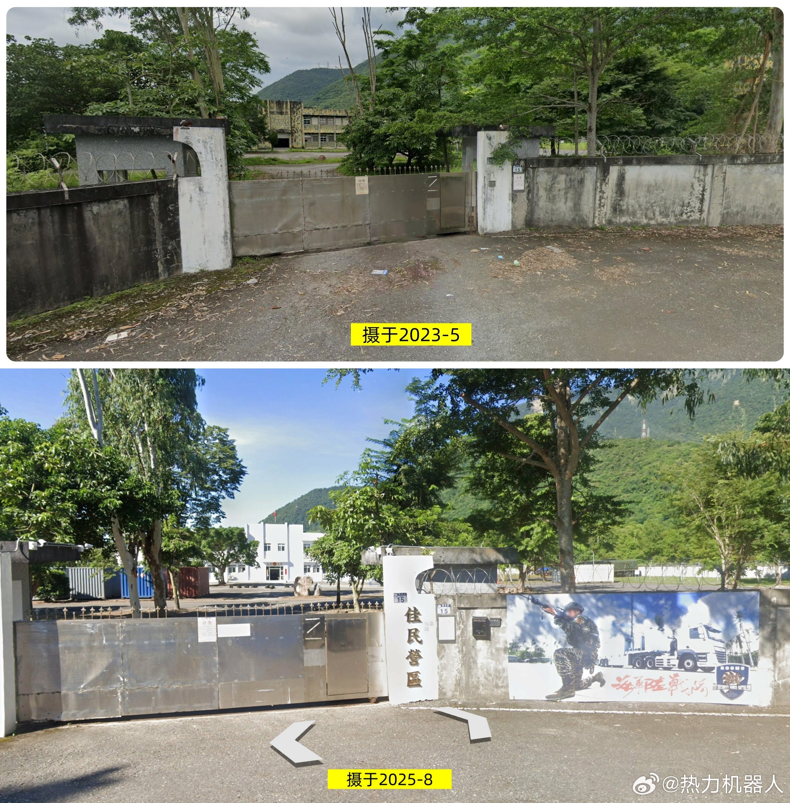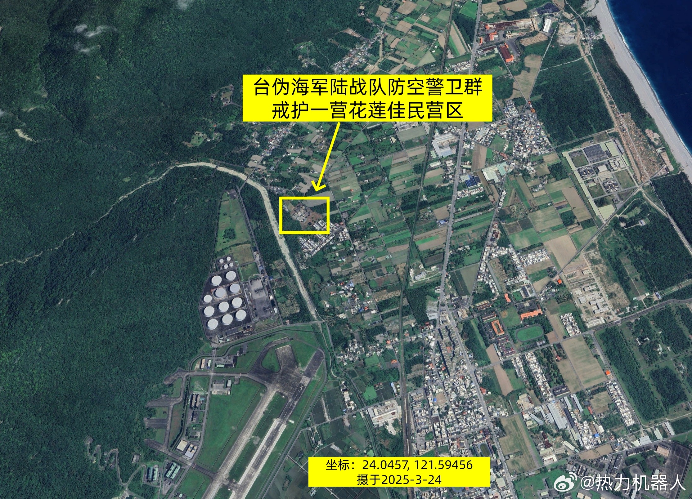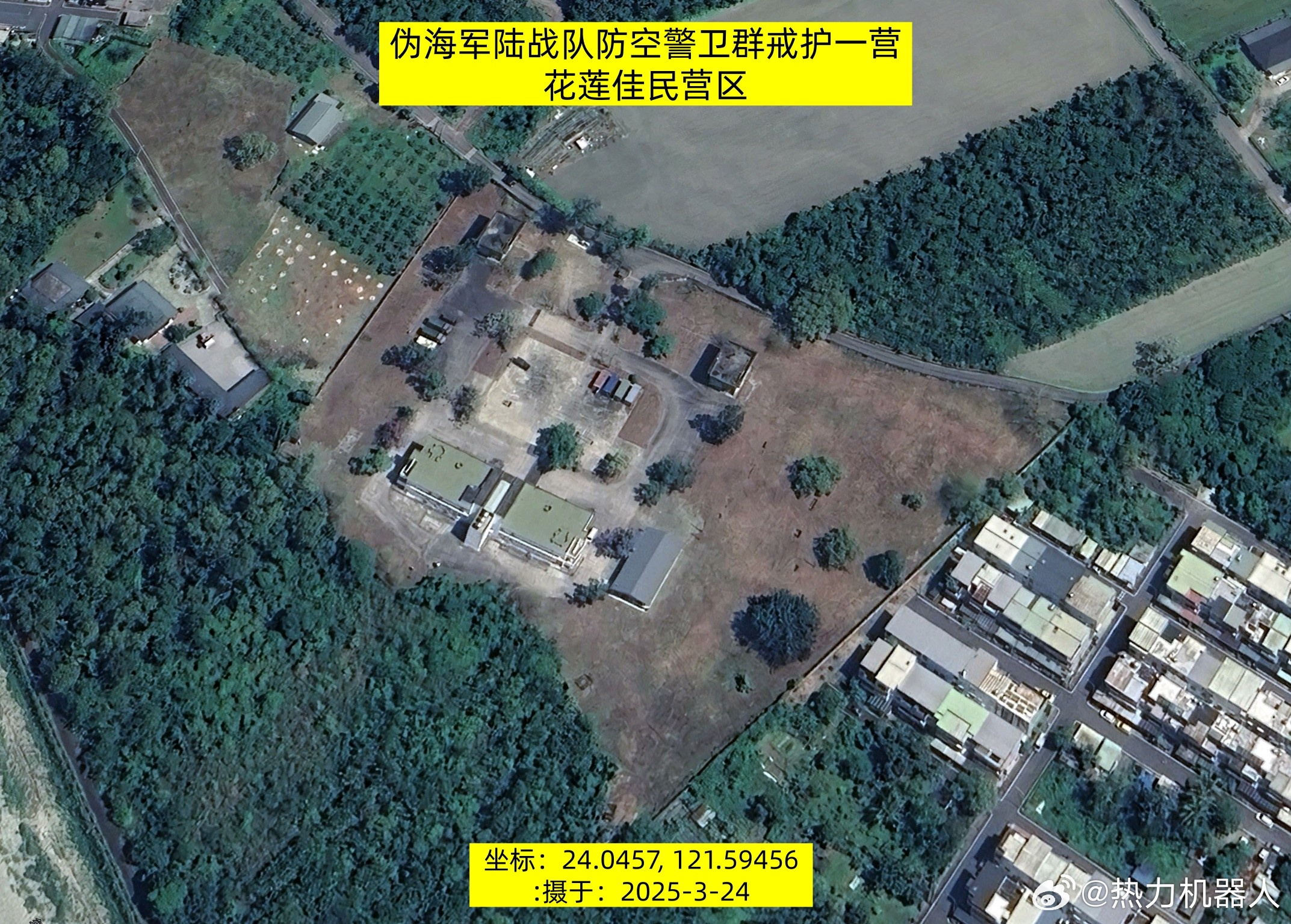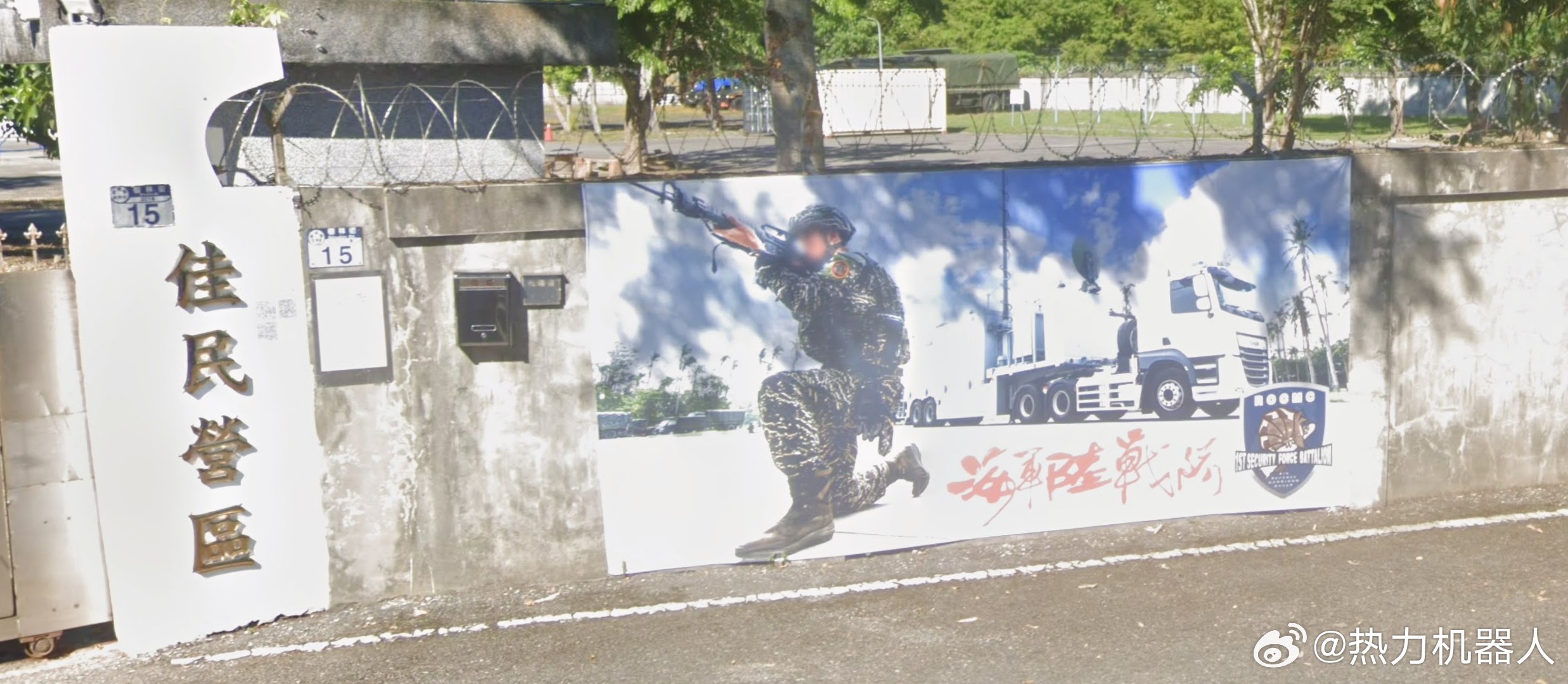 台湾军事信息 台伪海军戒护一营在花莲的部署位置。去年,台伪在海军陆战队防空警卫群下成立了“戒护一营”(图1),用于掩护海锋大队的机动导弹车组,之前有过介绍:网页链接根据卫星图和谷歌街景图可判断,伪海军戒护一营已进驻花莲地区,其营区位于佳山机场跑道北侧约800米处,见(图2、图3)。原营区曾荒废多年,2024年进行了翻新(图4),可容纳一个连的兵力。(图5)为佳民营区的新旧街景图。最新的街景图可见墙上的宣传画(图6),宣传画的右下角可见戒护一营的部队图标:犰狳抱着一枚白色导弹(图7)。