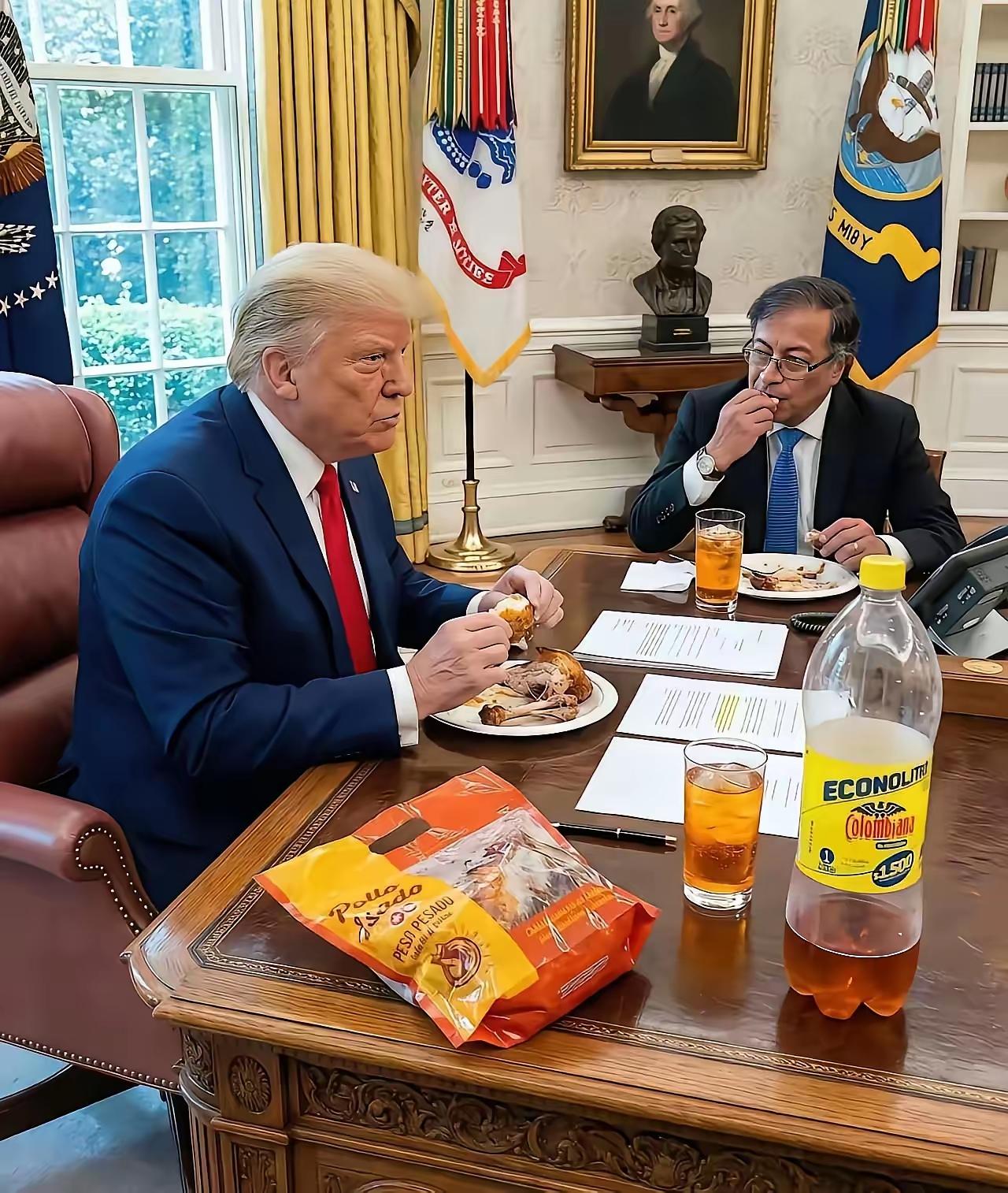 哥伦比亚的总统在美国和特朗普一起吃快餐。炸鸡和汽水,这可真的很带劲。网友解释说,那炸鸡品牌是哥伦比亚本土的,汽水也是哥伦比亚本地汽水,不过由百事公司生产。闻着这一桌子的商业化味道,还真是让人觉得有点儿嘴馋! 人们不禁问一个问题,反美的哥伦比亚总统为什么要访问美国?这还用问吗,害怕特朗普把他像马杜罗一样给收拾了。毕竟从睡梦中被人逮了去,形象实在是不太好。