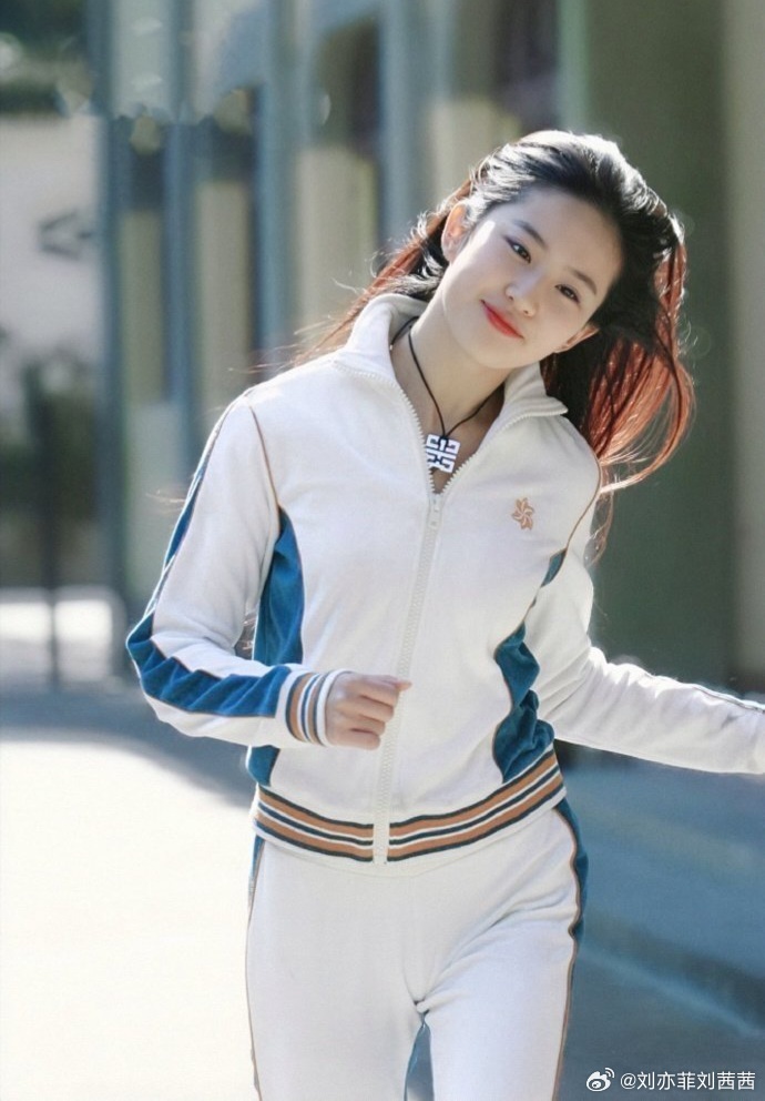 阳光穿过老巷的檐角,温柔地落在刘亦菲身上,她身着一身复古运动套装,以纯净的白色为基底,利落的立领和拉链设计,透露出清爽的少年感。