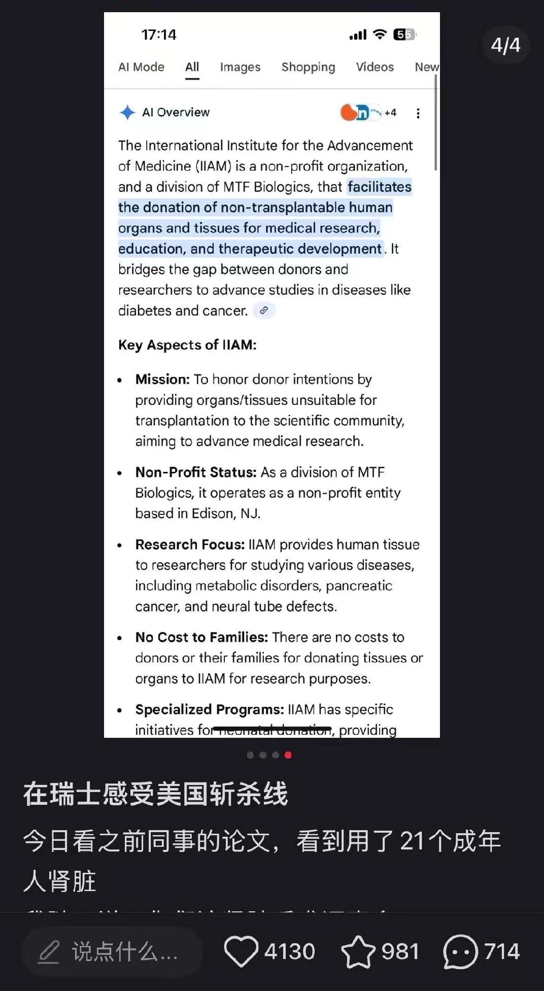 在瑞士感受美国的“斩杀线”画面感具体化 瑞士实验室里国医学生随手一掀,冰柜里放着34颗肾脏1个大人,13个新生儿,全是美国“非营利”标价货。 讽刺的是非盈利机构要赚的最多。 3000-5000瑞郎一颗,穷人活着看不起病,死了被“拆分售卖”,死亡也要给医疗做贡献。 帖子刚火,女主酒被“开盒”了。姓名、住址、护照号全被曝光,实验室马上辞退该女生。 这里的器官体现了美国完整“斩杀线”闭环,底层就是耗材,爆料那就是违约,追问的眼睛必须第一时间消失,生意才能继续无声运转。 警惕牢A的前车之鉴,被开盒那就赶紧跑,希望小姐姐连夜买机票,细软该丢的丢。保命要紧。 小编结语:瑞士实验室34颗“穷人肾”明码标价,再次坐实“斩杀线”。底层活着治不起,死了被拆卖,揭发者一秒被开盒。生意链条完整,连追问都不允许存在。快跑,是爆料者唯一的后路。