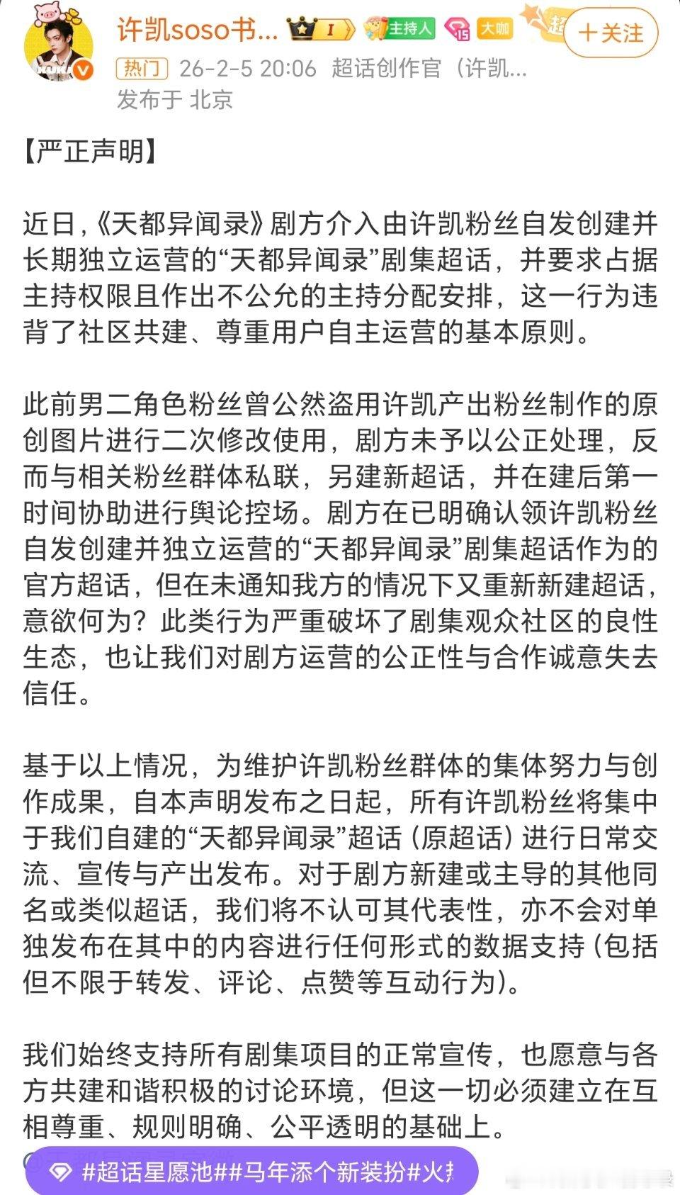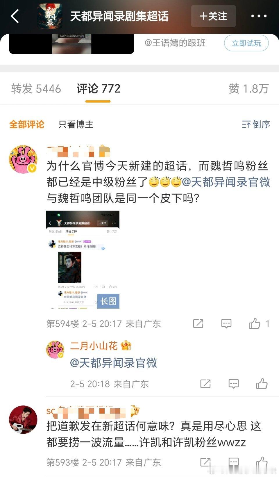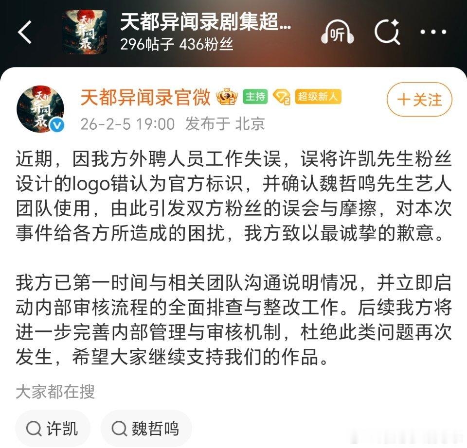 天都异闻录官微好离谱啊...身为官微,居然将许凯粉丝设计的logo给了魏哲鸣团队使用 而且道歉还发在了一个今天新建的超话里,只有几百人。明明天都异闻录这个超话几千人,他却不用。支持一番大男主soso家维权!