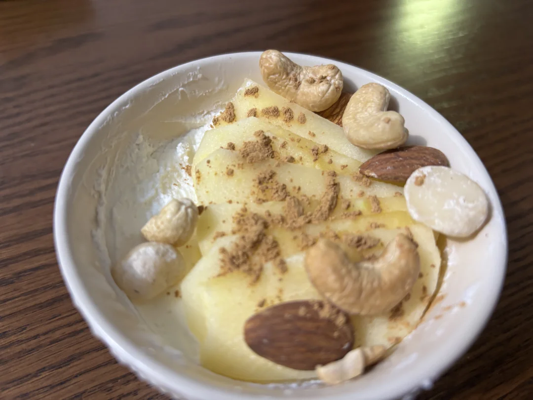 苹果片夹干噎酸奶蘸肉桂粉 好吃[点赞R] 糖前人大部分零食都吃不了,每天醉心于发明这些东西