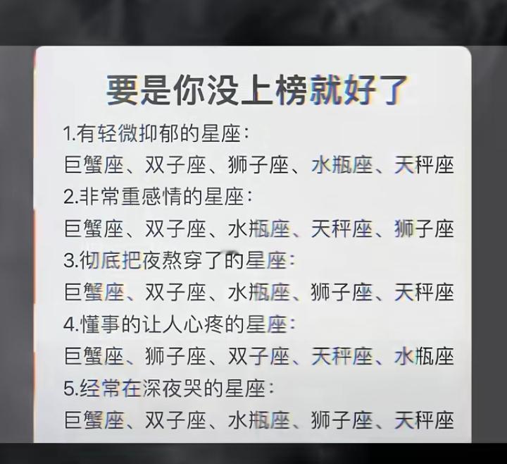 看了个视频, 要是你没上榜就好了, 发现果然没有我[大笑][大笑]。 我是理智的 摩羯座[得意][得意]。 仔细看, 上边其实完全都是一样的, 全部是那五个星座[偷笑][偷笑]
