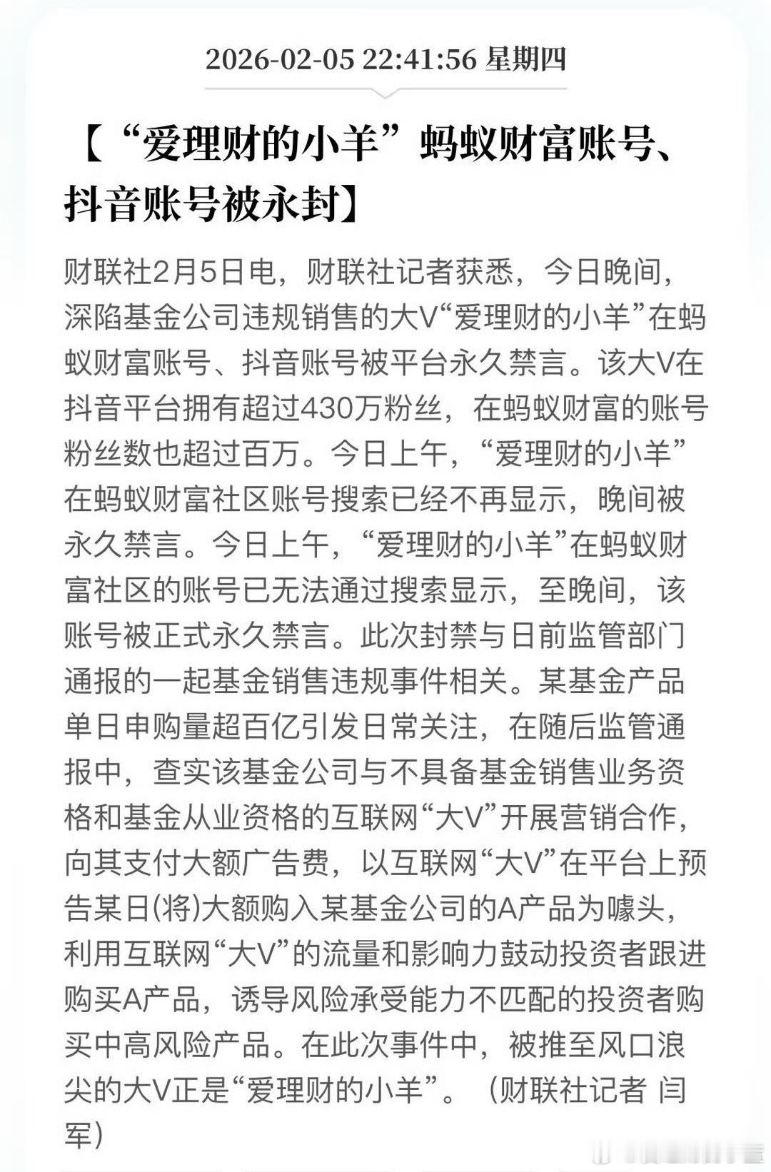 爱理财的小羊蚂蚁抖音账号被永封不是禁言是永久封禁说明事情很大。说不定这次他真要进