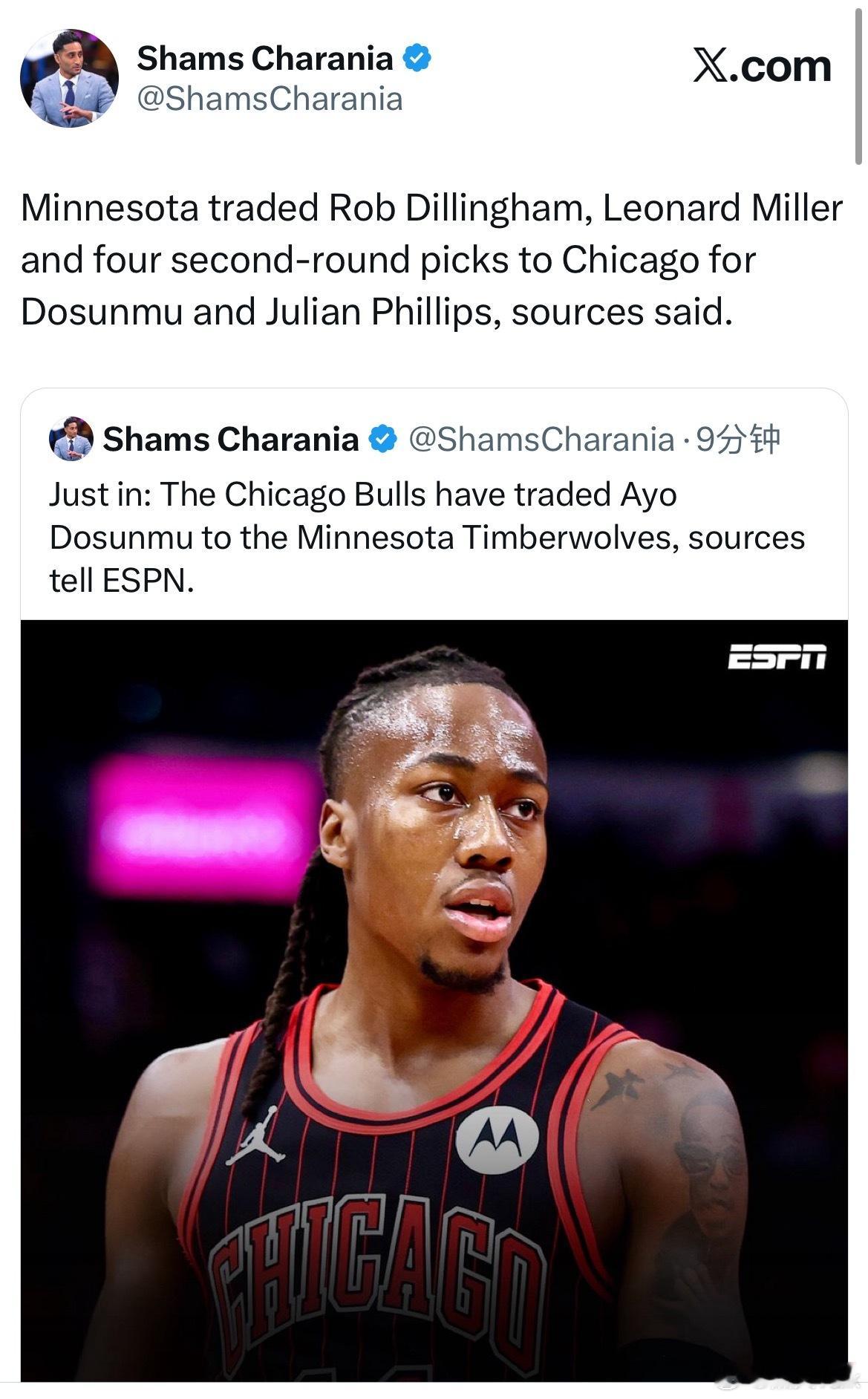 Shams:据 ESPN 消息人士透露,芝加哥公牛队已将阿约·多桑姆交易至明尼苏
