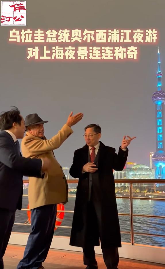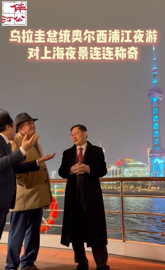 2月5日晚乌拉圭总统逛外滩,隔着黄浦江看东方明珠,外滩夜景太美了吧!只见他穿着咖色外滩头戴黑色礼帽,一身保暖穿搭站在江边儿,吹着黄浦江的风,和陪同人员边赏景边聊天。 大家都知道上海外滩的景色很迷人,白天有白天的美,晚上的黄浦江畔更是灯光璀璨,总统先生站在江边儿欣赏上海夜景,尽管天气有点儿冷,但景色确实让人着迷,难怪黄浦江被誉为“十里洋场烟花地”。 据悉,有两个中方人员陪同,看他们相谈甚欢的样子,肯定是讲述着黄浦江的独特魅力,他们对面的东方明珠亮灯后更美了,这么美的夜景英国首相可没有看到,因为英国首相是白天逛的外滩。