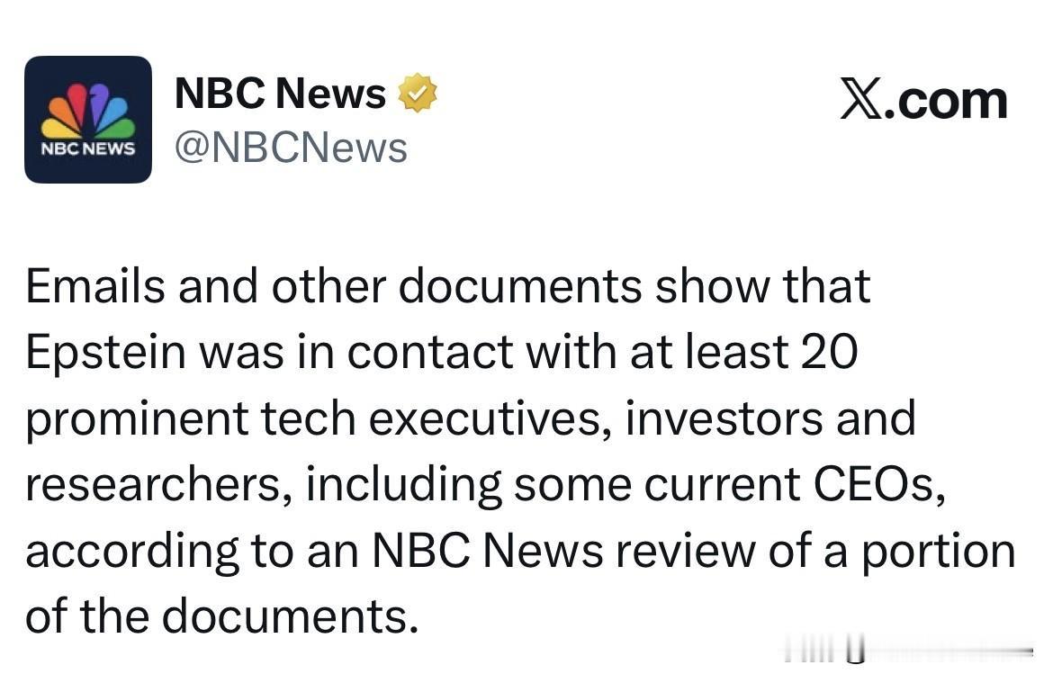 据 美国国家新闻网“NBC 新闻”对爱波斯坦案件的部分文件的审查显示,其中多份电子邮件和其他相关文件表明,杰弗里·爱泼斯坦至少与 20 位当今世界知名科技高管、投资者和研究人员有过联系,其中包括一些现任首席执行官,例如比尔·盖茨,埃隆·马斯克等。