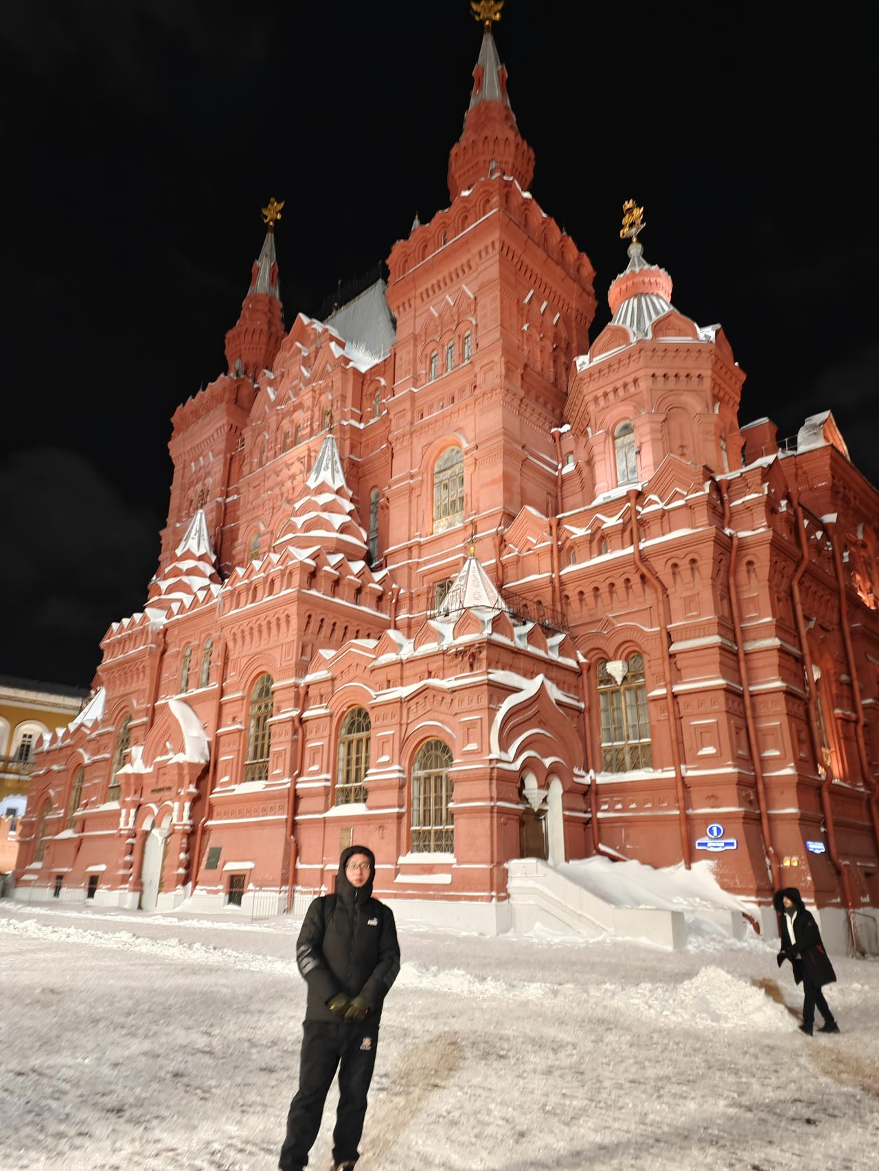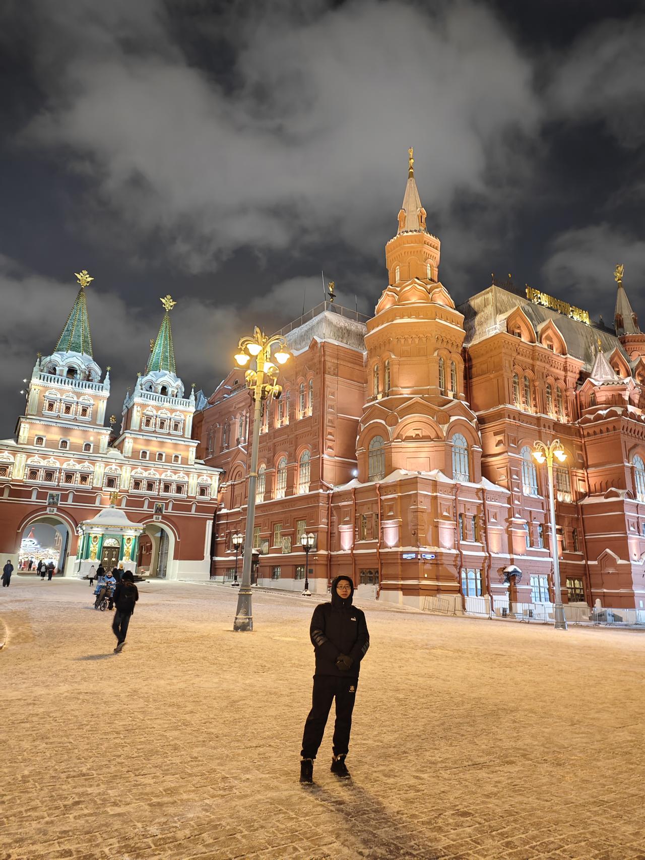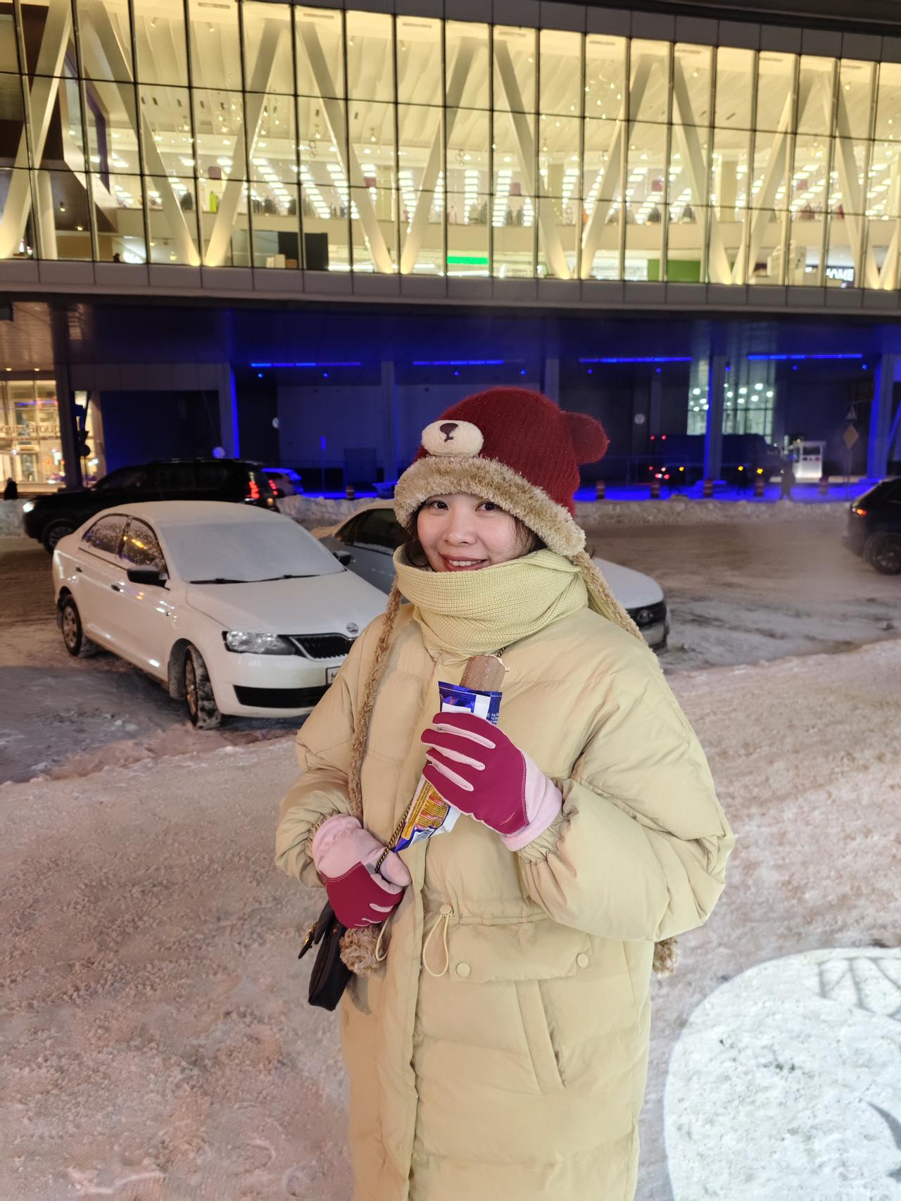 感觉我的适应能力还是很强的,从出生到现在第一次体验零下10-20℃,感觉就前两天有些不适应,后面就一切都正常了。 第一天刚出机场,等网约车的几分钟就冻得不知所措,第二天布展后带老婆去红场玩,晚上风很大,虽然里面穿着一条加绒的秋裤,外面再加上一条加绒的运动裤,但是感觉和没穿裤子一样,两条腿被风吹得瑟瑟发抖。鼻子和脸也被吹得受不了,一直用带着手套的手捂着嘴巴和鼻子。不过羽绒服还是很保暖,上半身没感觉到冷。 老婆更夸张,加长的羽绒服,毛线帽子,羽绒服的帽子也带上,还用围巾把整个脸都围起来,就留一双眼睛在外面。 但是还要拍照,我手就拿出来拍照的10来秒就感觉要冻僵了,带老婆去了该打卡的地方打了卡,老婆还在那里一直拍拍拍。虽然我穿着加厚的袜子和加绒的鞋子,但我的脚早已经失去知觉了,赶紧拉着老婆往商场跑……室内室外就是相差40多度 不过俄罗斯的年轻的美女穿得真是少,感觉就一条薄秋裤加一条牛仔裤,然后里面一个保暖衣加一个薄棉袄。 后面不知道是不是温度上升了几度,还是适应了这个温度,再也没有前两天这样冷的感觉了。参完展,晚上就到处逛去了……
