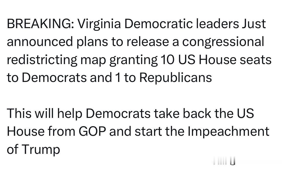 突发新闻:美国弗吉尼亚州民主党领导人刚刚宣布:他们计划公布一份国会选区重划地图,该地图将为民主党人分配10个美国联邦众议院席位,为共和党人分配1个席位。 如果这个计划得以实现,这将有助于民主党从共和党手中夺回美国众议院的控制权,并启动对特朗普的弹劾程序。