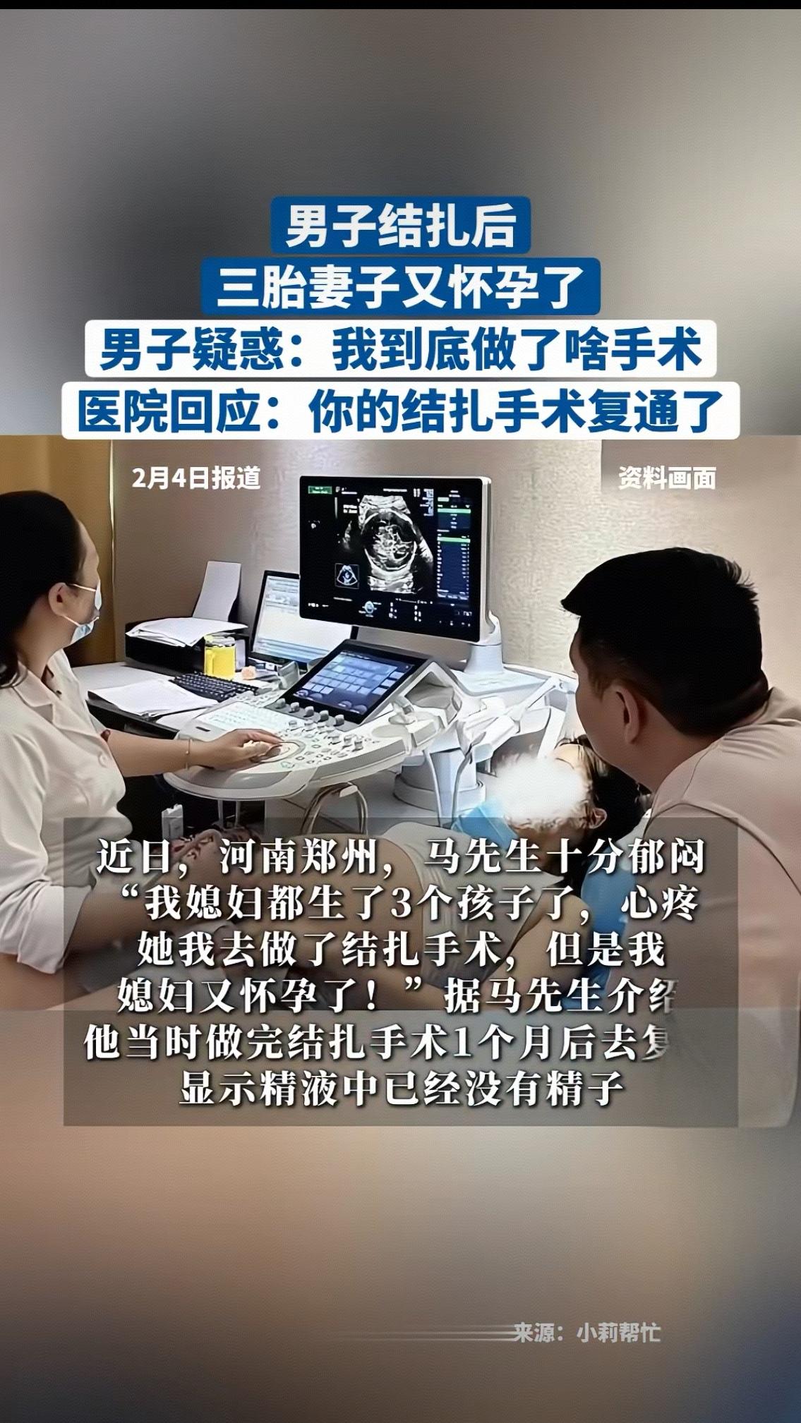 男子结扎后妻子再怀三胎?0.1%的复通概率,藏着婚姻与医疗的双重拷问 “我到底做了啥手术?”当郑州马先生拿着妻子的第四胎孕检单,对着医院病历本欲哭无泪时,这句话道出了无数人的震惊。为了让经历三次剖腹产的妻子免受避孕之苦,他主动站上手术台做结扎,术后复查被告知“无需避孕”,结果11个月后意外再次降临,医院轻飘飘一句“手术复通了”,让他的心疼与付出都成了笑话。 这看似电视剧都不敢拍的剧情,其实并非个例。山东大哥结扎后喜提龙凤胎,安徽夫妻因意外怀孕爆发家庭大战,河南周口李先生术后三月就当爹,这些真实案例背后,是0.1%-0.15%的自然复通概率在作祟。医学上解释,输精管断端可能因免疫反应形成肉芽肿,悄悄搭建起“生命通道”,且多发生在术后1-2年内。但比低概率事件更让人膈应的,是背后暴露的问题。 马先生的经历里,最戳心的是他对妻子的疼惜——三次剖腹产的疤痕,是女性生育的勋章也是枷锁,他选择用自己的手术承担避孕责任,这份担当本应被善待。可现实是,手术白做、罪白受不说,还得面对“是不是没真做手术”“妻子是不是出轨了”的恶意揣测。就像安徽大姐的婆婆私下嚼舌根,村里闲言碎语差点逼得夫妻离婚,这种对女性的污名化,比意外怀孕更伤人。 而医院的责任更难辞其咎。《医疗事故处理条例》明确要求,医疗机构需如实告知患者手术风险。但很多医生只强调结扎的“一劳永逸”,却对复通概率、术后需1、3、6月三次复查的规范避而不谈。马先生仅复查一次就被通知“安全”,河南周口医院甚至以“概率事件”搪塞患者,这种告知缺陷,让本可避免的意外成了必然。更讽刺的是,有些医院对男性结扎还要求“配偶签字”,却对女性手术无此限制,性别偏见下,连避孕都成了女性的“天职”。 网友的评论更是人间百态:有人心疼马先生“白遭罪”,有人吐槽医院“不负责任”,也有人后怕“不敢让老公结扎了”。但最该反思的是,当男性主动承担避孕责任时,我们是否给予了足够的医疗保障?当手术出现意外时,医院是否该主动担责而非推卸? 好在马先生夫妻最终选择留下孩子,一句“孩子是生命”化解了纷争。但不是所有人都能如此幸运,那些因医疗告知不足导致的家庭矛盾、身体伤害,不该被“概率问题”轻轻带过。希望这起事件能敲响警钟:医院需守住告知底线,让患者明明白白做手术;而我们也该正视,避孕从来不是某一方的事,男性的担当值得被尊重,女性的身体更值得被呵护。 最后想问大家:如果是你,会为伴侣选择结扎吗?你觉得医院该为复通事件负全责吗?欢迎在评论区聊聊你的看法!男性结扎 丈夫结扎 男子结扎后妻子怀孕 医院被判侵权