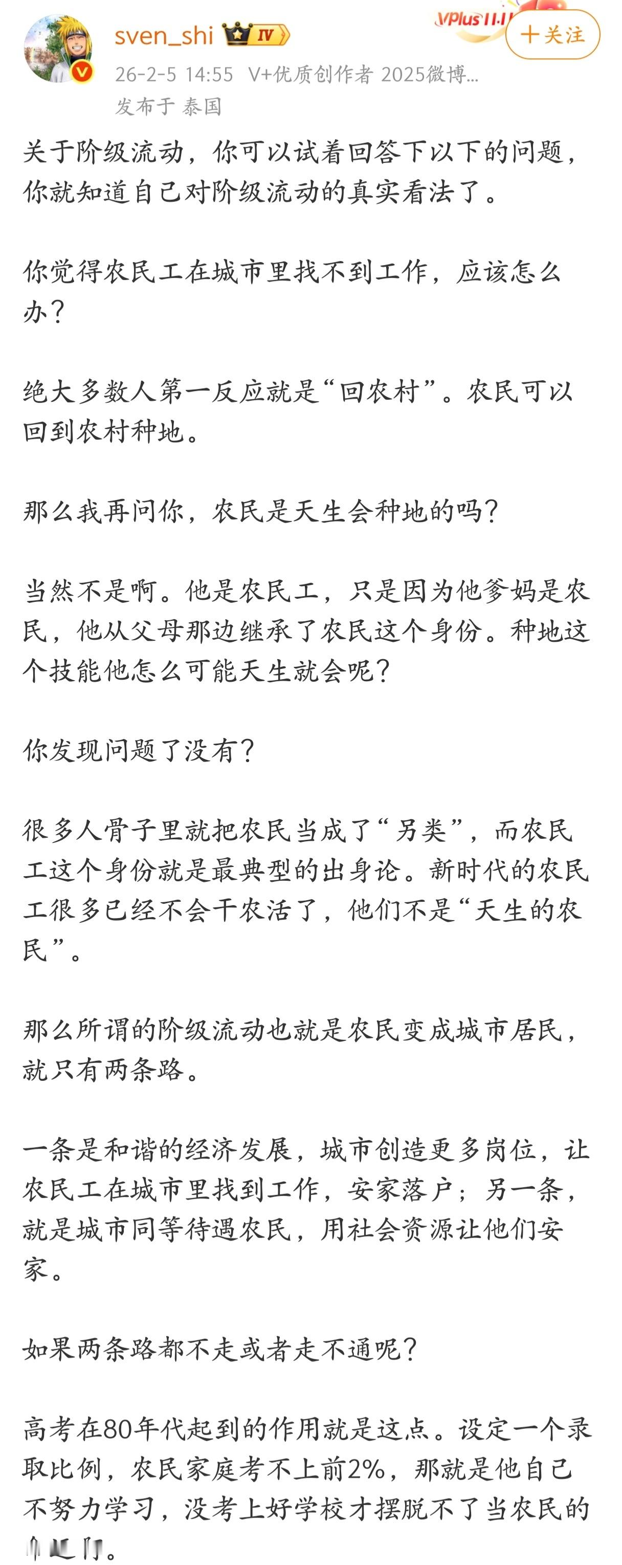 很多人骨子里就把农民当成了“另类”,而农民工这个身份就是最典型的出身论。新时代的农民工很多已经不会干农活了,他们不是“天生的农民”。