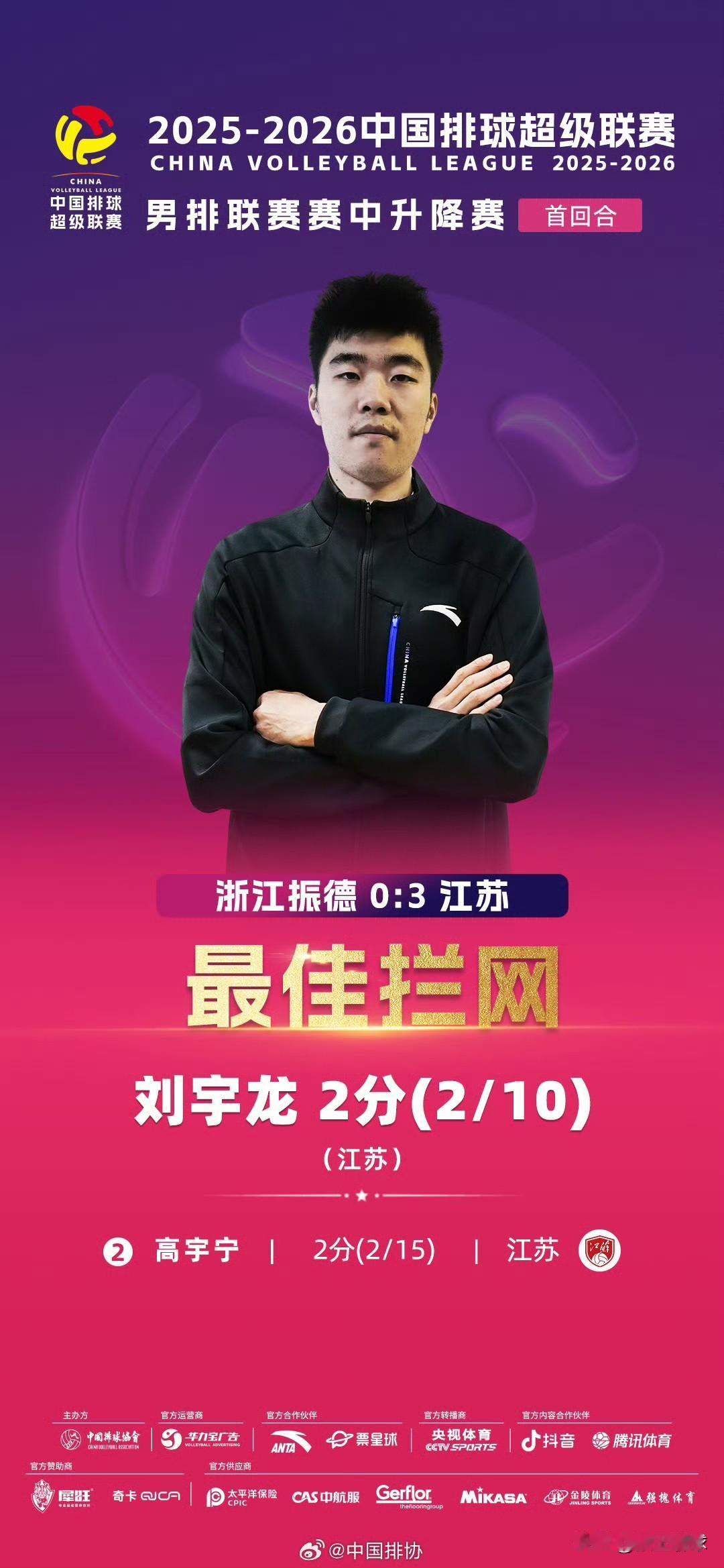 本场最佳: 最佳得分:张鸿鑫(江苏)20分 最佳扣球:张鸿鑫(江苏)19分 最佳拦网:刘宇龙(江苏)2分