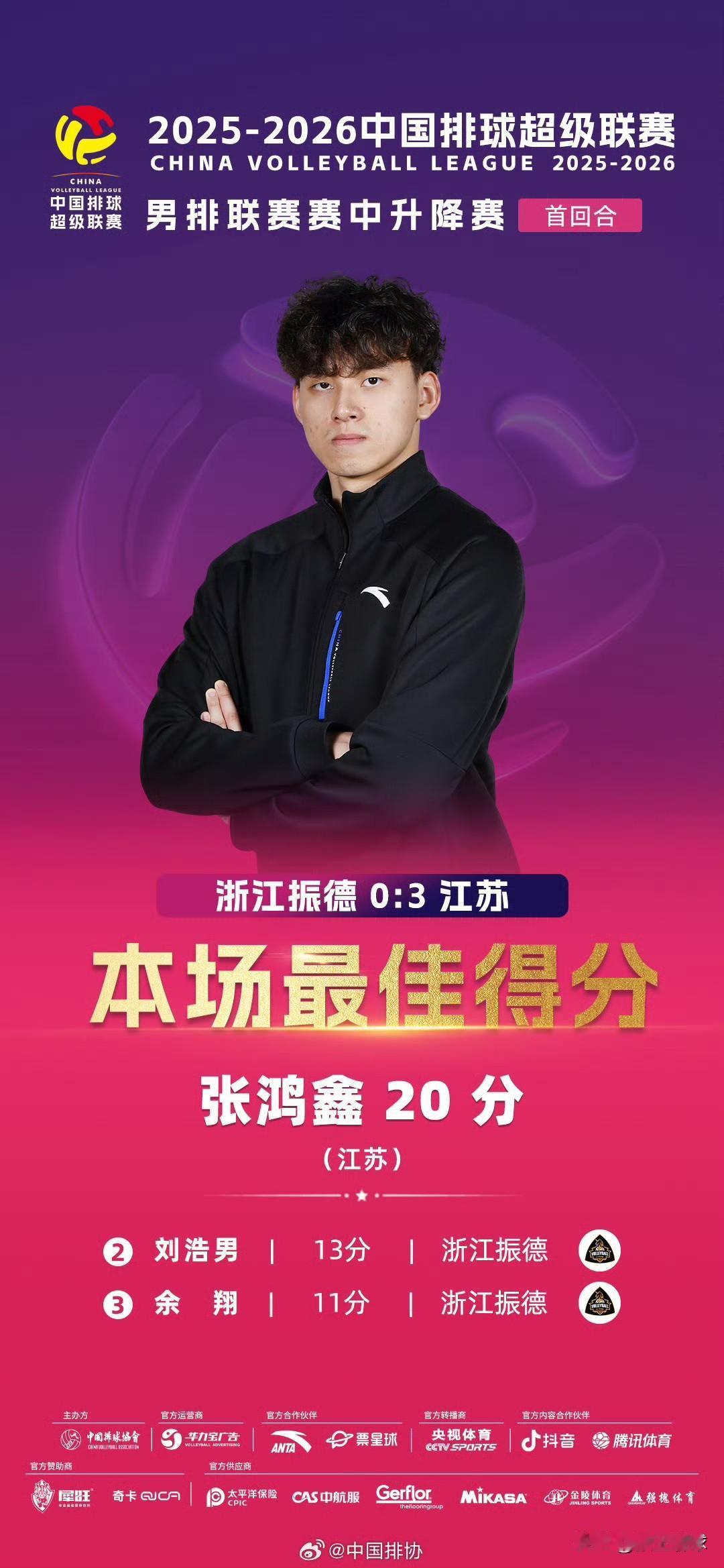 本场最佳: 最佳得分:张鸿鑫(江苏)20分 最佳扣球:张鸿鑫(江苏)19分 最
