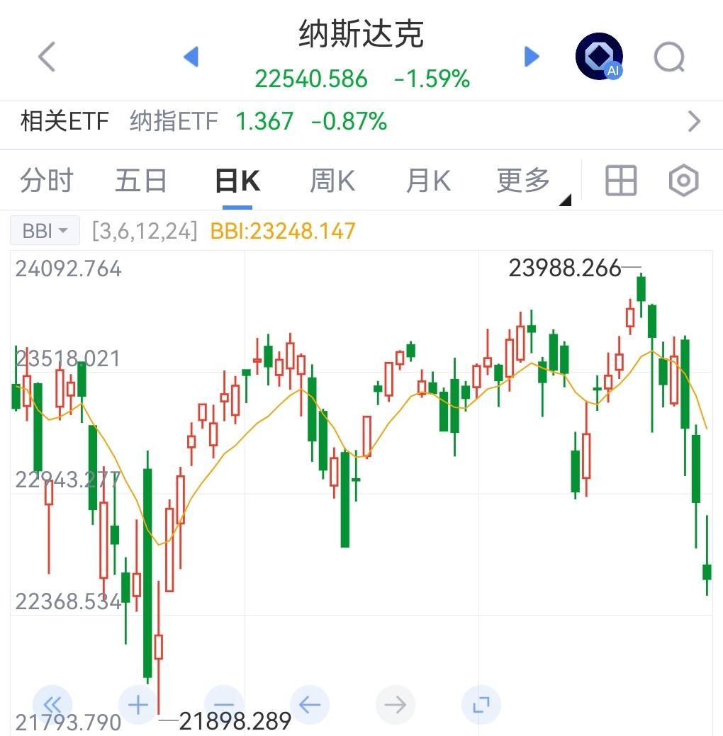 今晚美股纳斯达克指数可能又凉凉了!科技巨头轮流业绩暴雷,深度回调要来了么? 近几日科技股轮流业绩不及预期暴雷,AMD、谷歌、高通业绩报公布之后皆大幅下跌,无一幸免。 今天凌晨美股收盘后科技七巨头之一的亚马逊又公布业绩报,业绩报显示其资本支出约2000亿美元,超出预期; 美股盘后亚马逊股价大幅下跌,跌幅高达11%; 大概率连续三天跌超1%的美股纳斯达克指数今晚又是凶多吉少了! 最近两周一直向来比较稳定的老美投资市场也渗透出丝丝寒意,让这个冬天显得格外的好冷。 全球各金属期货与现货连连大幅跳水,老美那边的金属期货与现货也没能幸免,跌幅大得惊人。 老美币圈那边比特币与以太坊更是瀑布式下跌,截止目前币圈两大头牌双双跌破特朗普胜选时的涨幅,并且跌幅还具有连续性走弱趋势。 加之现在美股市场,科技巨头轮流业绩不及预期暴雷,以科技为主的纳斯达克指数也是连连下跌。 这不得不让人联想一直以来都稳定上涨的老美各投资市场是不是即将陷入深度回调了? 这种情况下,让许多投资纳斯达克100指数基金的朋友们犯了难,感觉美股纳斯达克指数可能要开启深度回调了,但又不能轻易操作。 由于该指数的基金被限购问题,一旦卖出后就再难大额买入,错失投资美股纳斯达克的机会。 这的确让人很犯难,大家觉得这应该如何应对呢?