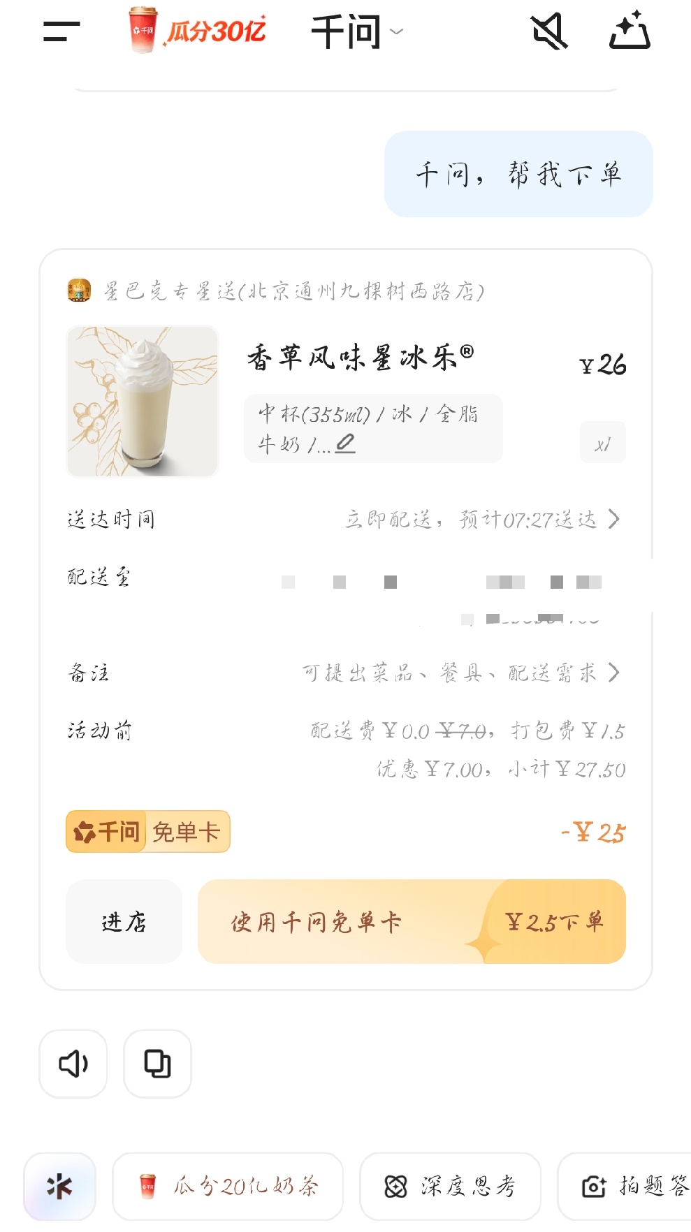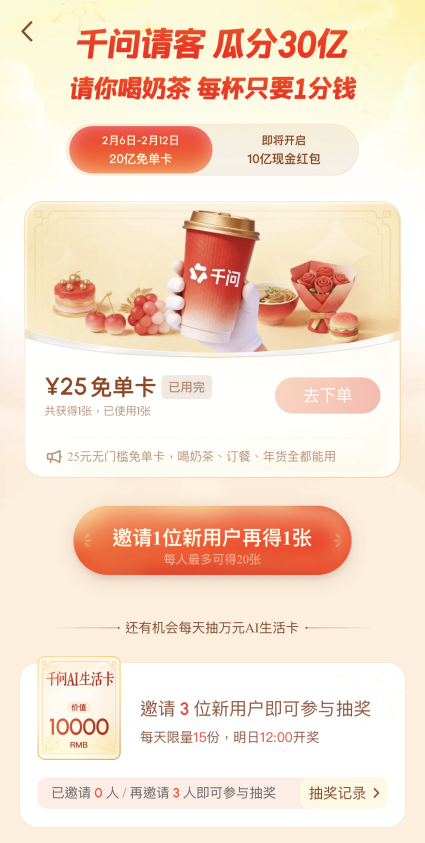 用AI点的第一杯奶茶 今早在上班路上朋友给我说,现在下载千问就可以拿到一张免单卡了!千问免单 千问一分钱奶茶这是千问直接请喝咖啡的节奏阿,简直是太便宜了,点上一杯星巴克居然这么划算!赶紧美美下单一波,感觉今天上班都更有动力了捏!😂