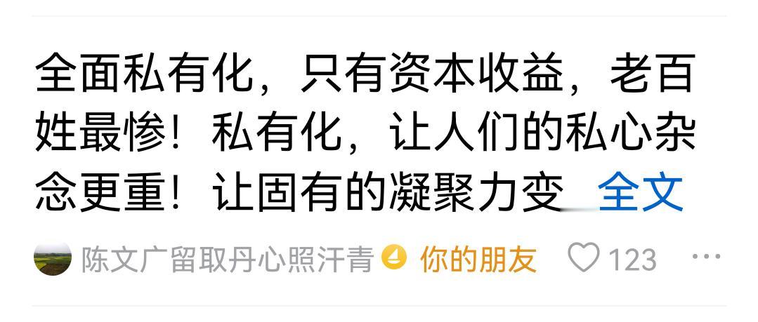 越来越多的有识之士清醒地认识到,全面私有化,对于普通百姓意味着什么! 全面私有化,必然导致社会资源资产向少数人手里集中,从而形成巨大的贫富差距;社会公权也会向掌控社会资源的少数人倾斜,完全没有公平正义。 所以,私有制社会不适合咱们,咱们追求的是共同富裕,是公平正义,大家一起把蛋糕做大,再合理分配,这才是正道。