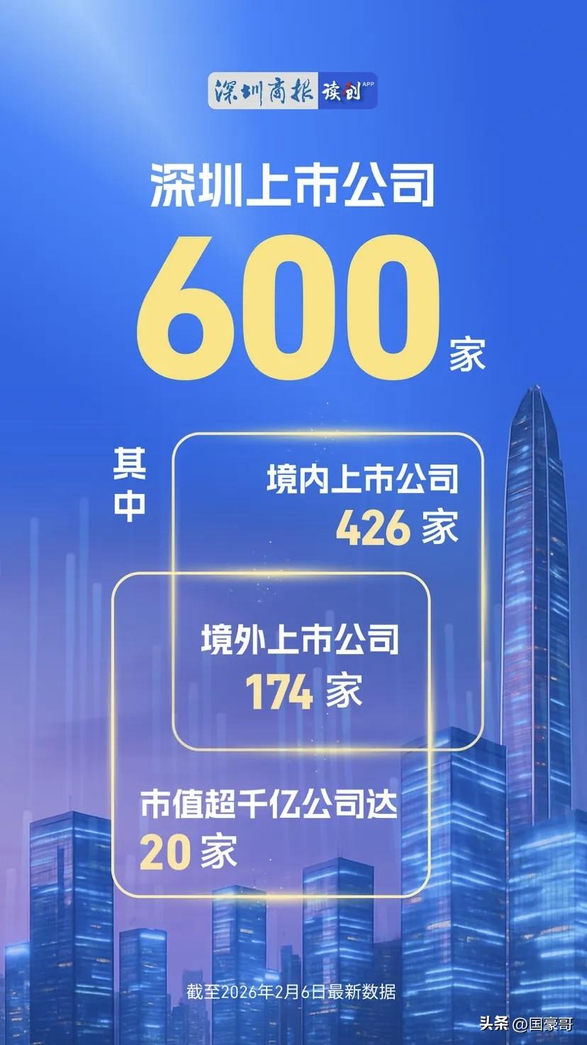 深圳的上市公司高达600家! 根据深圳本地媒体报道,截至2月6日,深圳地区的上市公司达到600家,其中,在境内上市的公司426家,在境外上市的公司174家,市值规模接近20万亿元。 近年来,深圳在人工智能、具身机器人、生物医药等新兴产业领域持续发力,高新技术企业如雨后春笋,不仅吸纳了大量的新增就业人口和高端人才,还给地方带来了可观的税收。 再加上深圳即将承办2026年亚太经合组织峰会,国际化水平进一步提升,深圳未来前景无限可能。