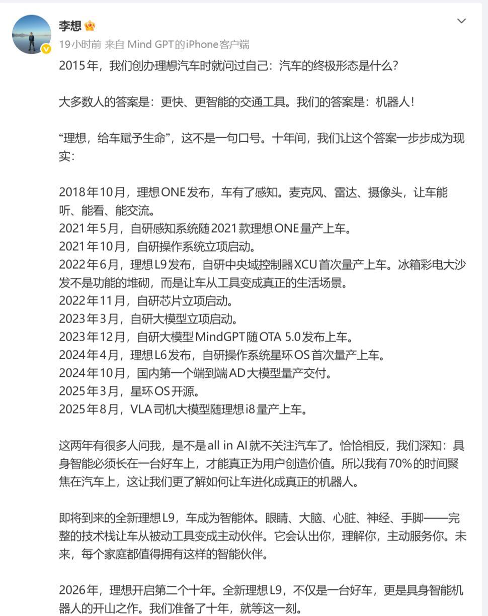 2026年,理想开启第二个十年。全新理想L9,不仅是一台好车,更是具身智能机器人的开山之作。我们准备了十年,就等这一刻。