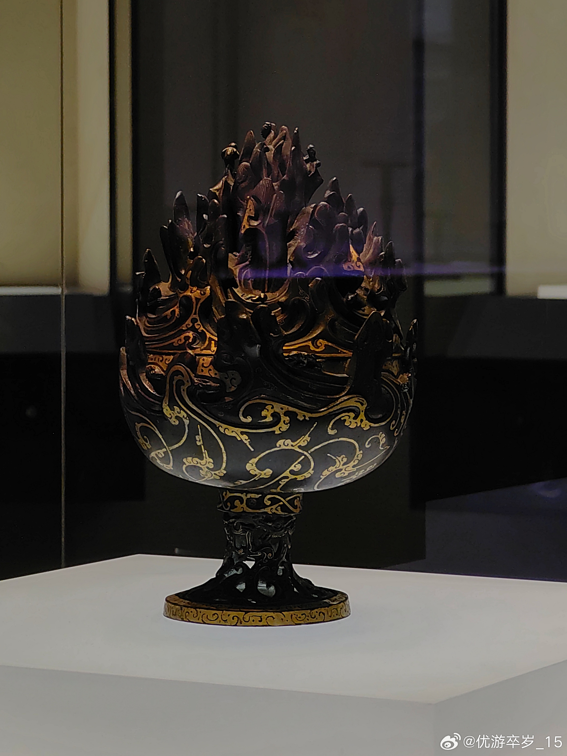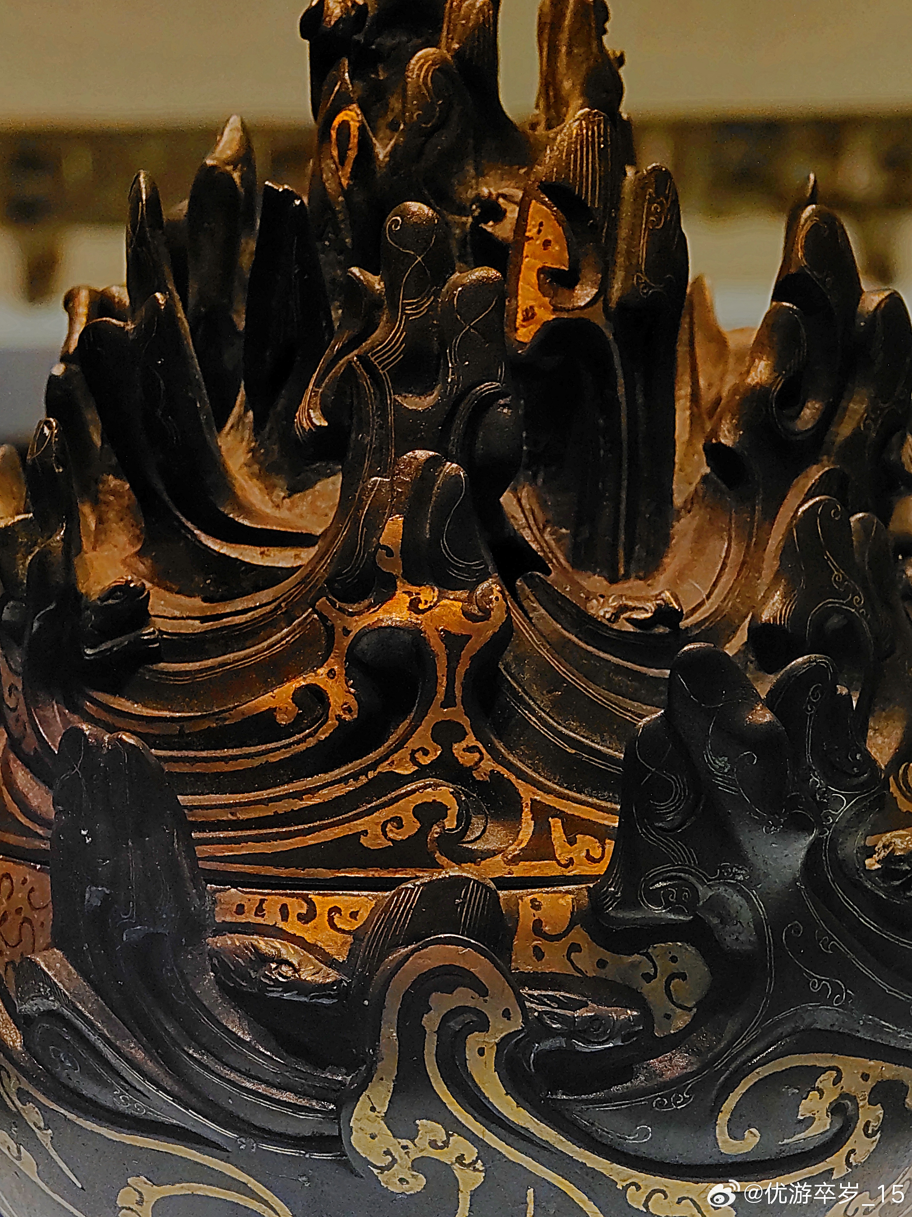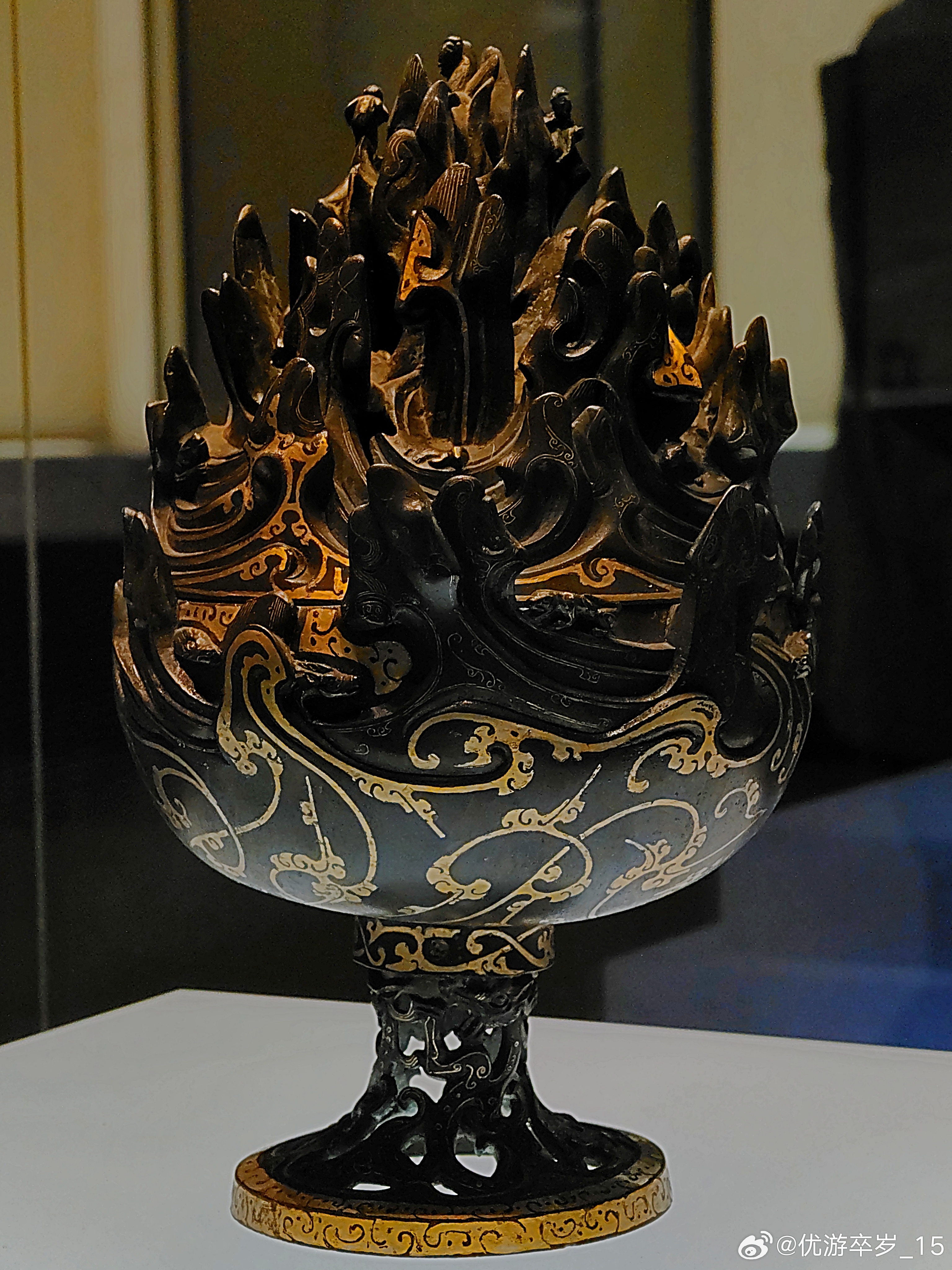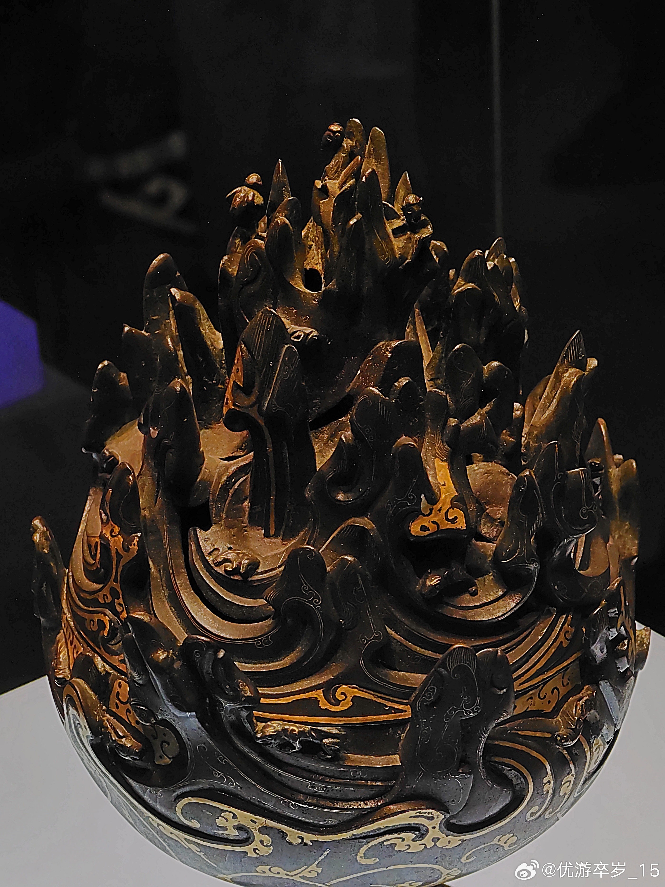 这件熏香用具正在天津博物馆出差中错金铜博山炉西汉(公元前202-公元8年)河北博物院藏1968年出土于河北省满城陵山中山靖王刘胜墓。这件香炉腹径15.5厘米 通高26厘米。炉身似豆形,通体错金,底座透雕出三条腾空出水的蛟龙,炉身铸成山峦重叠的模样,山中神兽出没,虎豹奔走,猎人持弩巡猎其间,二三小树点缀其间,刻画一副秀丽的自然山景和生动的狩猎场面。约会博物馆文物