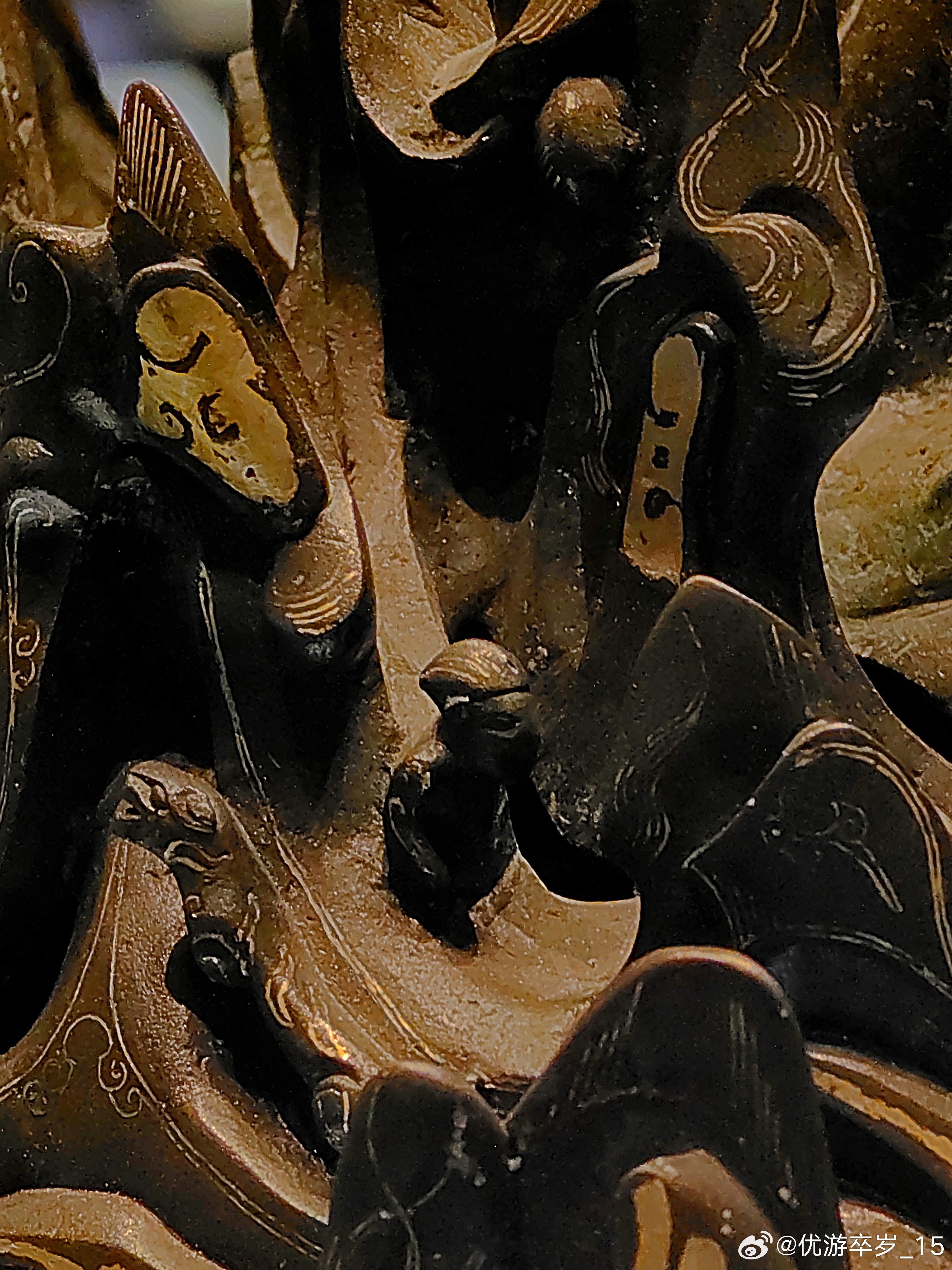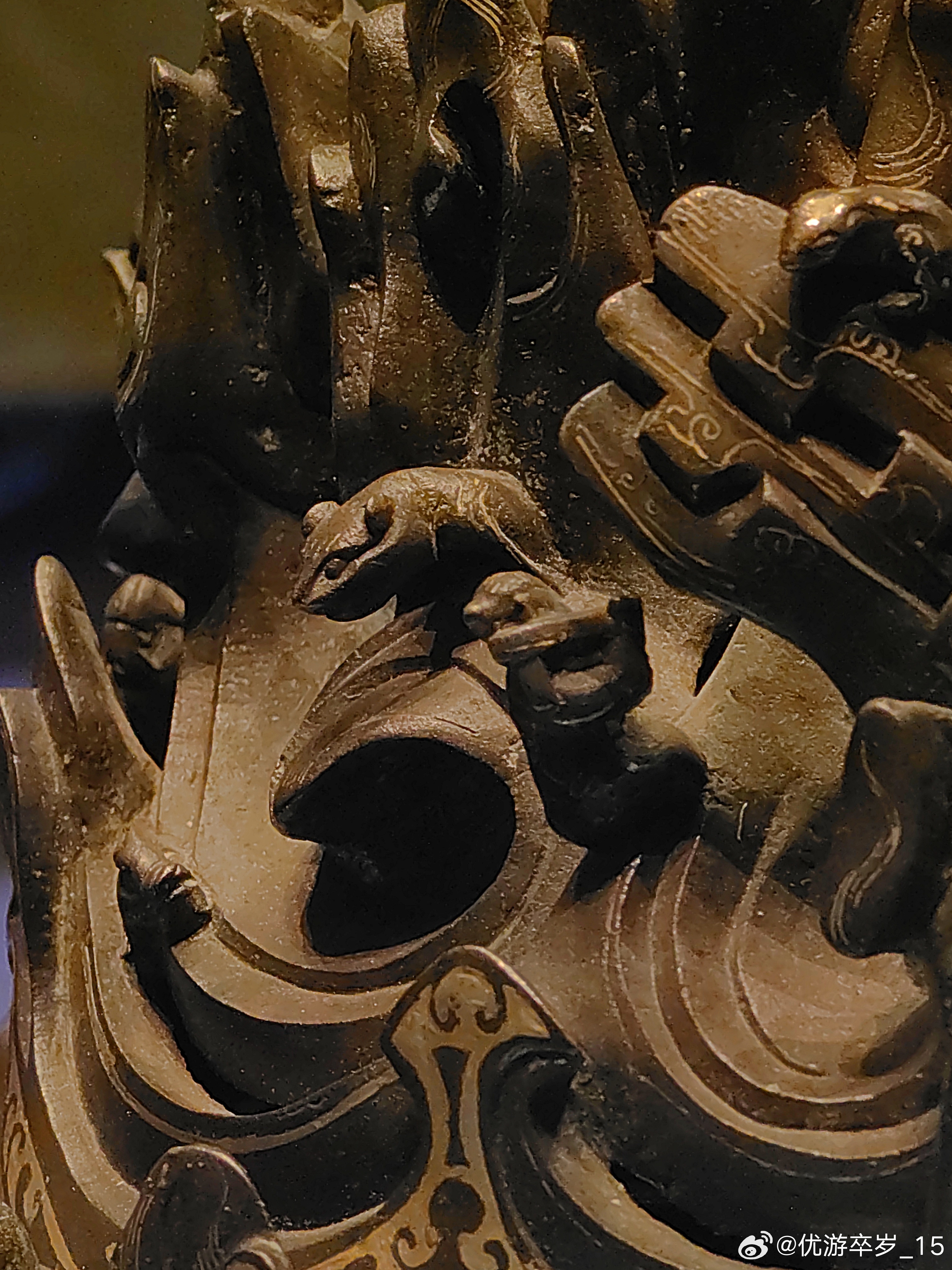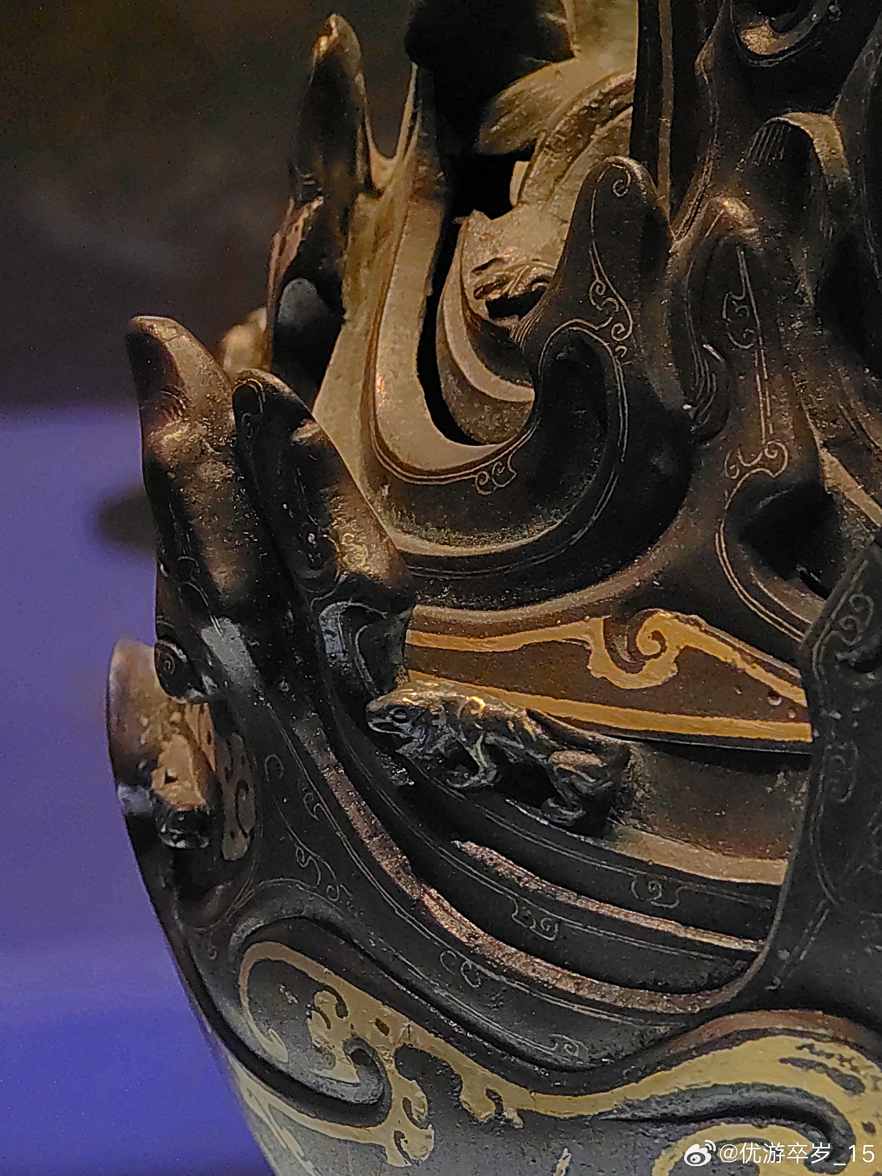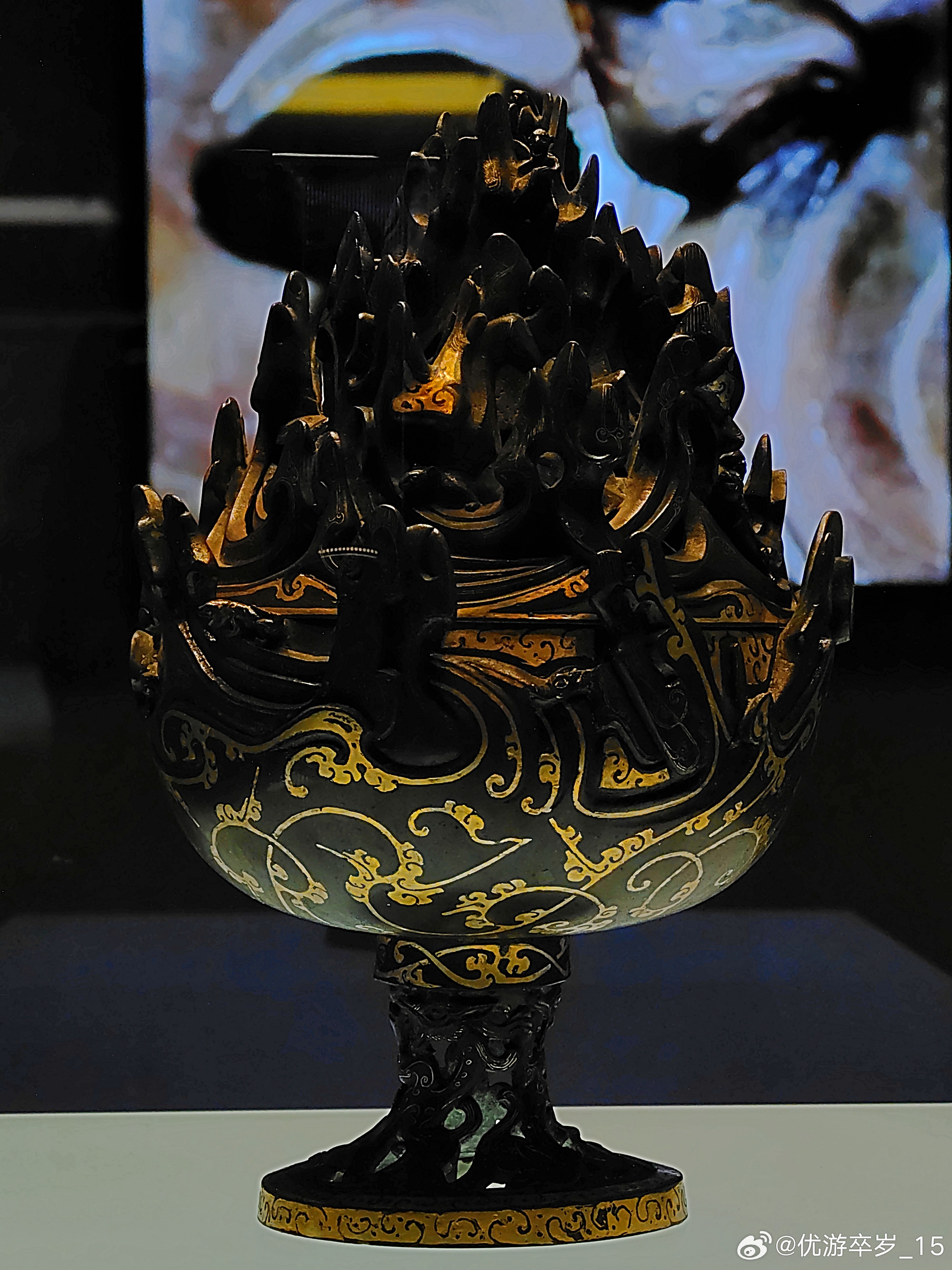 这件熏香用具正在天津博物馆出差中错金铜博山炉西汉(公元前202-公元8年)河北博物院藏1968年出土于河北省满城陵山中山靖王刘胜墓。这件香炉腹径15.5厘米 通高26厘米。炉身似豆形,通体错金,底座透雕出三条腾空出水的蛟龙,炉身铸成山峦重叠的模样,山中神兽出没,虎豹奔走,猎人持弩巡猎其间,二三小树点缀其间,刻画一副秀丽的自然山景和生动的狩猎场面。约会博物馆文物