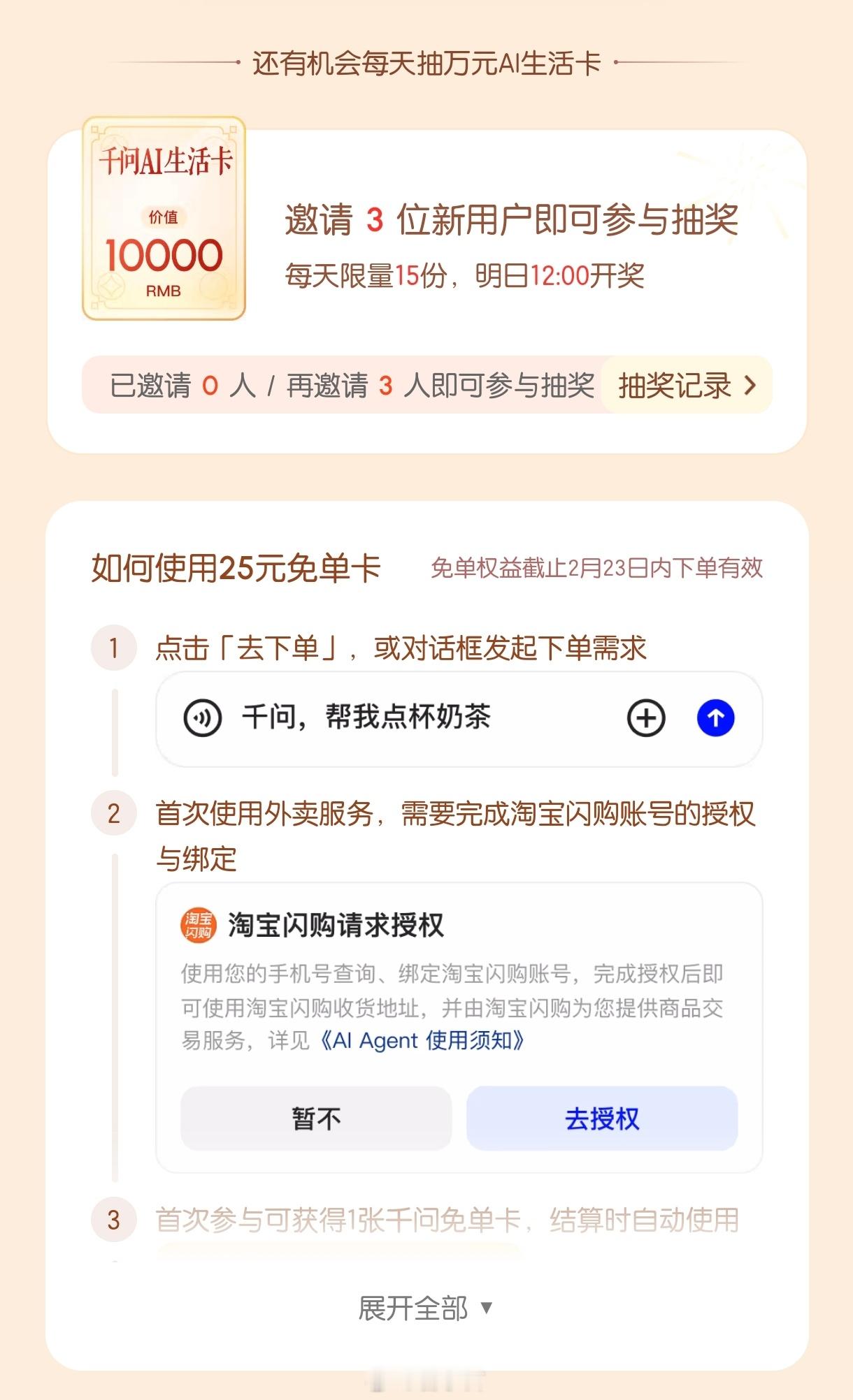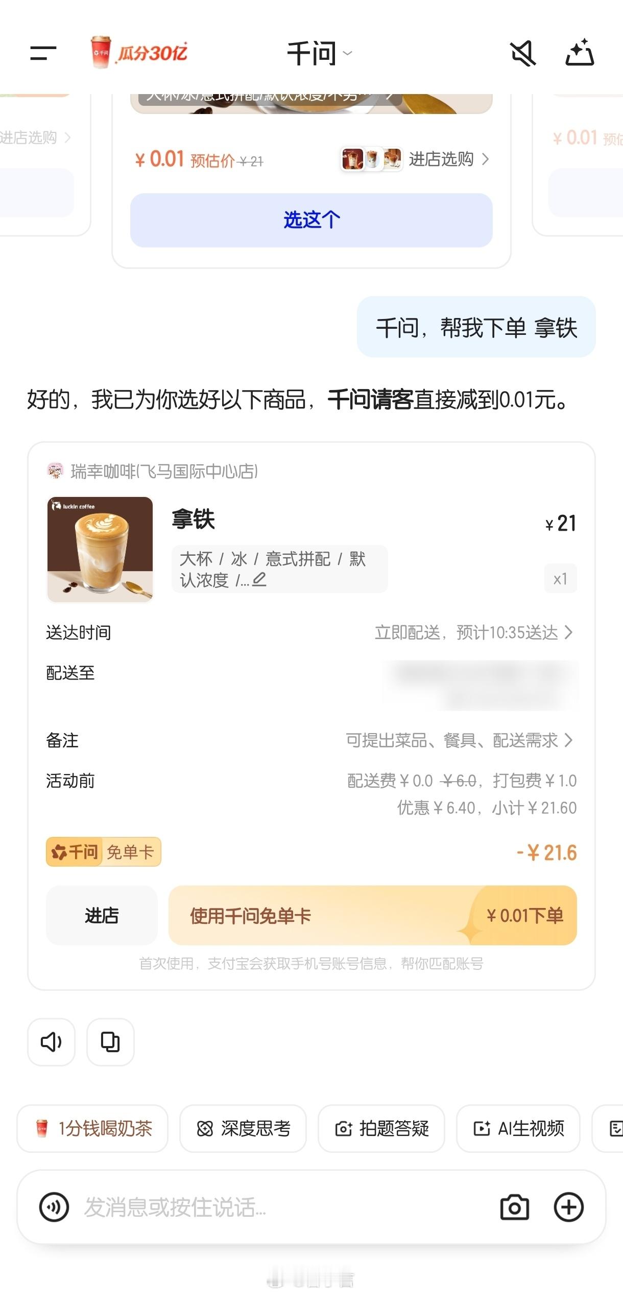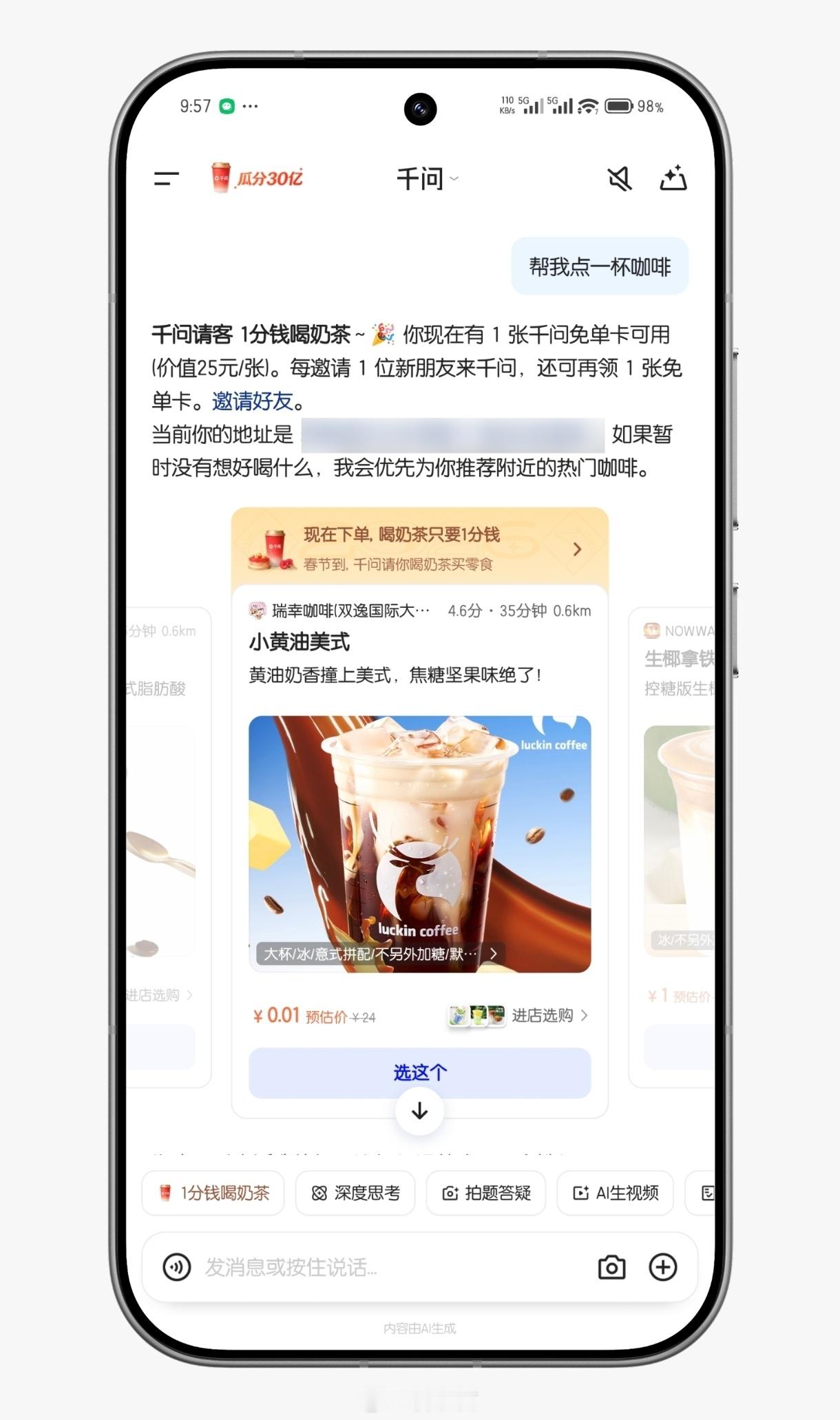 下载打开「千问」App,直接说:千问,帮我点奶茶(咖啡)。全程 AI 下单,坐等饮品上门。