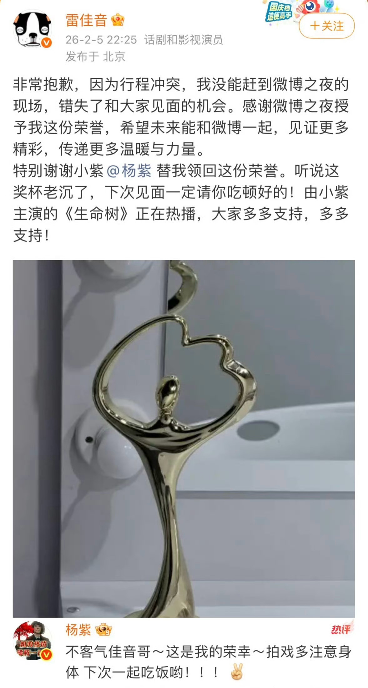 杨紫回应雷佳音两位都是很优秀的演员,小猴紫好暖心啊