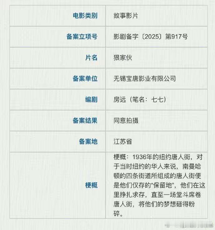 王宝强执导首部东方黑帮传奇 宝强导演新作终于蹲到了!光看片名就知道不简单,果然狠人办狠事。之前导演在活动上说自己会在剧组过年诚不欺我,谈到新作“想在最冷的时候拍出带哈气的感觉”,今天一看海报算是感受到了,果然够狠劲,够冷冽!海报一出一整个冷冽肃杀感扑面而来!故事更是高能:二十世纪初一个小人物,在黑帮争斗和排华压迫下,从底层挣扎成“狠家伙”!题材新颖、叙事带感,完全超越了我对传统黑帮片的传统印象!宝强自导自演buff叠满,必须列入我的年度期待片单!电影狠家伙