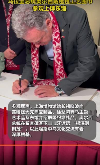 乌拉圭总统写下“根深则树茂”,以此比喻中乌文化;2月6日奥尔西总统参观上海博物馆,对于中国文物赞不绝口,还在留言簿上写下乌拉圭谚语。 他访华行程接近尾声,只是没想到总统先生对中国文化那么感兴趣,在北京的时候就登长城逛故宫,到了访华第二站依然是这样。 看来乌拉圭总统访华与英国首相不同,因为斯塔默主要是寻商机谈生意,人家奥尔西不但谈合作,而且还深入了解中国,加深中乌文化交流,这为两国友谊长存奠定了基础。 希望奥尔西总统回国后能成为中国的“导游”,也让乌拉圭人民了解中国的文化历史,有条件的也可以到中国旅游,看一看喝乌拉圭不一样的山和水。