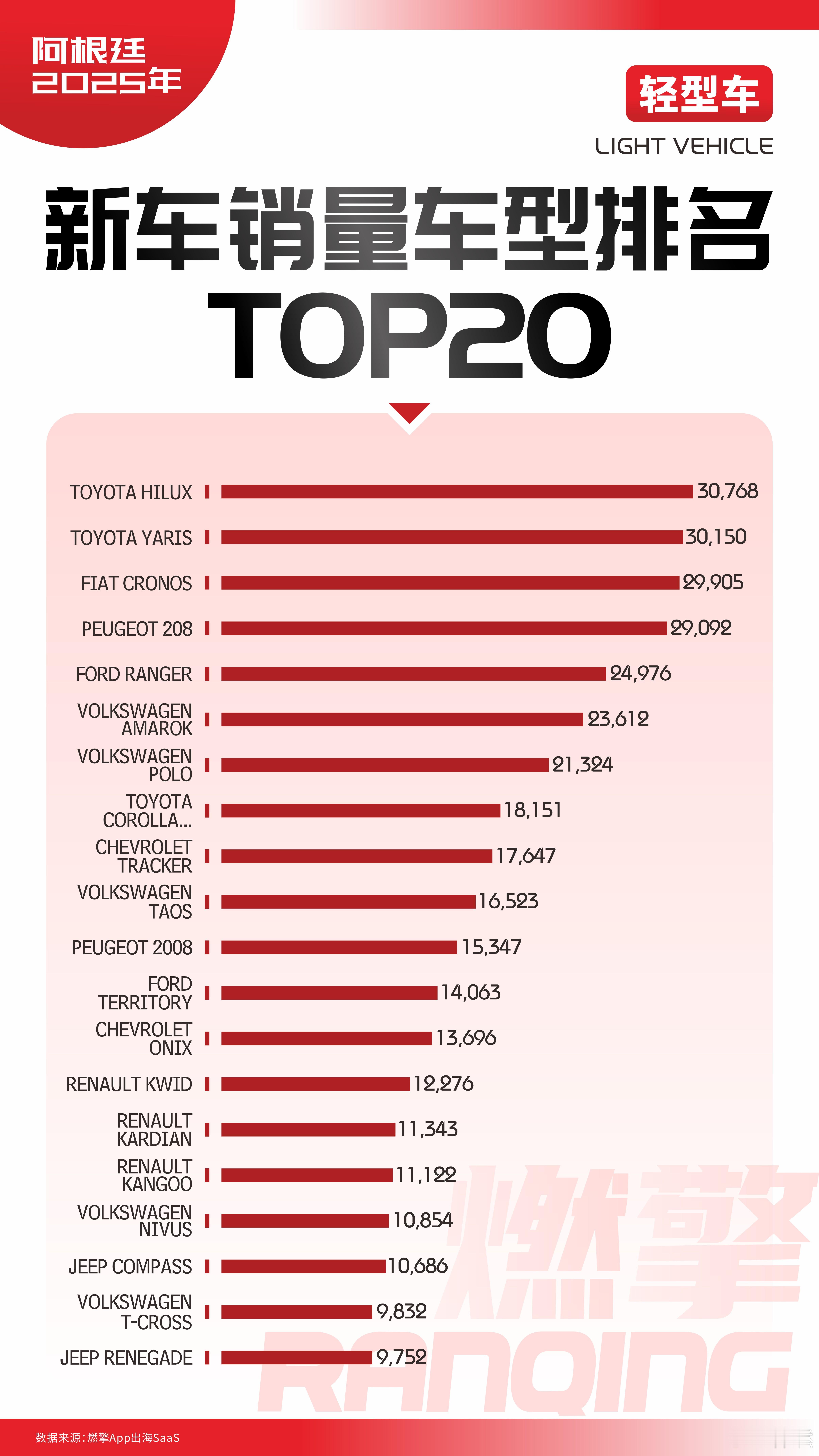 2025阿根廷轻型车车型TOP20榜单:中国品牌遗憾无一上榜2025年阿根廷轻型车销量车型TOP20榜单呈现出一个高度功能导向的市场:消费者的选择紧密围绕实际使用场景展开,皮卡用于工作与长途通行,小型轿车满足城市日常,硬派SUV则服务于特定户外需求。榜单中没有电动化先锋,只有经得起路况和账本双重考验的成熟产品。丰田Hilux以30768辆的成绩位居第一,仅以600余辆的优势领先Yaris。这一微弱差距恰恰说明,皮卡与家用轿车在阿根廷并非此消彼长,而是并行存在的两大刚需。Hilux的统治力源于其在非铺装路面、农场作业乃至长途运输中的可靠性,几十年来已形成“买了不后悔”的用户共识。而Yaris作为全球平台开发的小型三厢车,在本地提供1.3升和1.5升两种自然吸气动力,维修便利、油耗稳定,成为普通家庭首购或置换的稳妥选择。紧随其后的是菲亚特Cronos和标致208,销量分别接近3万辆和2.9万辆。Cronos基于Strada平台打造,是专为拉美市场开发的三厢轿车,后备厢空间大、悬挂调校偏硬,能兼顾载人与轻度载货;208则延续欧系掀背车的传统,操控灵活、内饰质感优于同级,主要吸引年轻家庭和城市个体经营者。两者共同反映出欧系品牌对本地家用车需求的精准把握。大众在榜单中占据两个席位:Amarok皮卡以23612辆排在第五,Polo以21324辆位列第六。Amarok虽定位略高于Hilux,但凭借更强的动力输出(2.0T柴油)和更精致的座舱,在中小企业主和高收入农户中拥有稳定客群;Polo则作为入门级三厢/掀背车,主打首次购车群体,本地化生产使其价格具备竞争力。雷诺通过Kwid和Kardian切入经济型市场。Kwid作为微型SUV,起售价低,适合预算有限的城市用户;Kardian则是2024年新推出的紧凑型SUV,基于全新模块化平台,空间表现优于Duster,迅速获得市场响应。两款车型合计贡献显著,显示雷诺正从低价策略向产品力驱动转型。美系品牌以福特Ranger为核心。其24976辆的销量仅次于Hilux,稳居皮卡第二。Ranger在越野性能和拖拽能力上略胜一筹,尤其在巴塔哥尼亚等南部地区更受青睐。雪佛兰则依靠Tracker(小型SUV)和Onix(三厢轿车)维持存在,两者均在本地组装,配置丰富,终端促销力度大,在中低收入家庭中保持一定份额。Jeep Compass和Renegade分别以10686辆和9752辆进入榜单后段。尽管销量无法与主流轿车或皮卡相比,但在硬派SUV细分中几乎无直接对手。四驱系统、较高的离地间隙以及品牌越野基因,使其在露营、牧场探访等场景中成为小众但坚定的选择。值得注意的是,TOP20中未见任何中国品牌车型。尽管北汽、奇瑞、哈弗等已在阿根廷建立销售网络,但尚未推出针对本地路况和消费习惯深度优化的产品。现有车型多以进口方式引入,价格缺乏优势,渠道覆盖有限,导致销量难以突破千辆门槛。阿根廷消费者对车辆的核心诉求集中在三点:能否应对复杂路况、长期使用成本是否可控、维修是否方便快捷。榜单前五名全部为燃油车型,其中三款为三厢轿车或皮卡,无一款纯电或插混产品。这种结构短期内不会改变——除非基础设施、能源政策或宏观经济出现重大调整,否则市场仍将由皮卡与经济型轿车主导,日系与欧系凭借本土化深度继续领跑。大v聊车