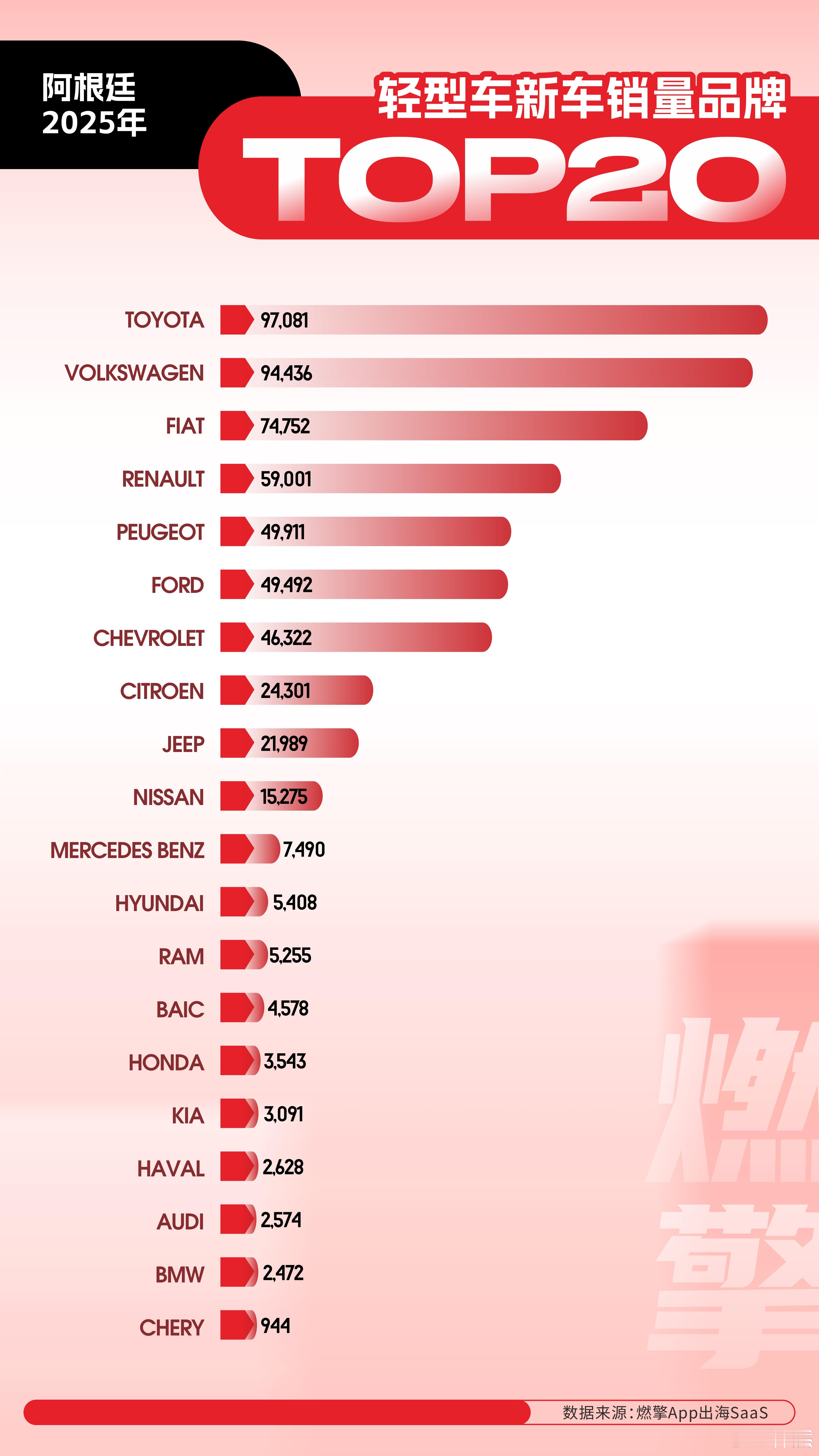 2025年阿根廷轻型车市:中国品牌,北汽领跑2025年阿根廷轻型车市场延续了以实用为导向的基本格局:消费者对价格敏感、重视耐用性,并高度依赖本地化生产的成熟燃油车型。新能源和豪华产品仍处于边缘位置,尚未形成实质性影响。丰田以97081辆的销量位居榜首。其成功并非依赖单一爆款,而是依靠覆盖皮卡、SUV和紧凑型轿车的完整产品组合。Hilux和SW4在城乡及非铺装路面上长期服役,Yaris则满足城市家庭日常通勤需求。品牌在渠道覆盖、零部件供应和维修便利性方面已建立深厚基础。大众以94436辆紧随其后,与丰田构成明显的双强格局。作为在阿根廷拥有本土工厂的核心外资品牌,大众本地投产的Amarok皮卡、T-Cross SUV以及Virtus三厢轿车构成了主力销售阵容。这些车型在保持德系底盘特性的同时,通过本地采购有效控制成本,维持了较高的性价比。菲亚特和雷诺分别位列第三和第四。两者均深度扎根南美市场多年。菲亚特的Strada小型皮卡常年位居细分市场前列,而专为拉美开发的Argo掀背车凭借1.3升Firefly发动机,在动力输出与油耗之间取得平衡。雷诺则依靠Kwid和Duster两款SUV支撑销量,两者均在阿根廷本地组装,终端售价具备竞争力。中国品牌首次实现多品牌进入TOP20,标志着阶段性突破。北汽以4578辆排在第14位,主销X55和X35两款紧凑型SUV,配置水平明显高于同价位欧系或韩系竞品,如标配双联屏、全景天窗和倒车影像系统。哈弗以2628辆聚焦H6和Jolion,强调外观设计与1.5T动力表现。奇瑞销量虽不足千辆,但通过Arrizo 5切入经济型轿车市场,填补了低价位自动挡家用车的空白。美系品牌依靠皮卡守住基本盘。福特Ranger和雪佛兰S10在农业、建筑和物流等商用场景中仍有稳定需求,其非承载式车身结构和四驱系统适配阿根廷内陆复杂路况,短期内难以被承载式SUV替代。现代和起亚在中端家用车市场保持存在。Creta、HB20和Sportage等全球化车型主要吸引5至10年车龄的置换用户。韩系品牌凭借较长质保周期、较低故障率和相对均衡的驾乘体验,在预算有限但追求可靠性的群体中维持份额。豪华品牌整体表现微弱。奔驰、奥迪全年销量均未超过1000辆,宝马甚至未能进入前20。三者均以进口方式销售,售价高、零配件贵、维修周期长,在当前经济环境下难以扩大受众基础。值得注意的是,榜单前20中无任何纯电动车或插电混动车型。当地充电基础设施覆盖率低,电价波动大,加之消费者对续航和使用成本高度敏感,使得电动化转型仍停留在政策讨论层面,尚未转化为真实市场需求。总体而言,阿根廷轻型车市场仍由日系与欧系主导,依托本土化生产、成熟平台和精准定位牢牢把控主流消费群体。中国品牌开始从边缘切入,但尚处早期阶段;而高端化与电动化路径,在可预见的未来仍将受限于经济与基建条件。大v聊车