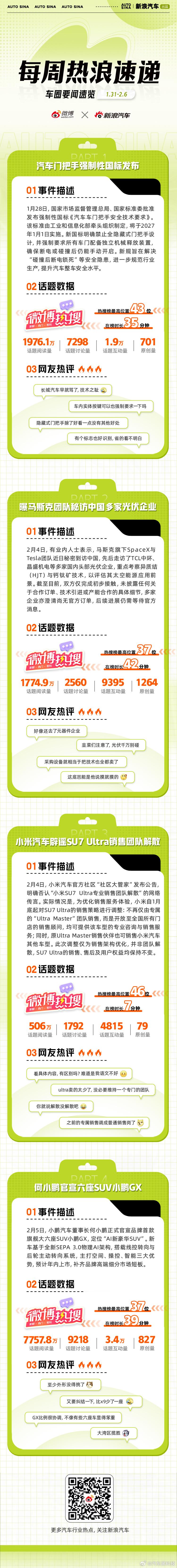 本周车圈热点不断:汽车门把手强制性国标发布,将于2027年1月1日实施;曝马斯克团队秘访中国多家光伏企业,以评估太空能源应用前景;小米汽车辟谣SU7 Ultra销售团队解散,仅为销售架构优化;何小鹏官宣六座SUV小鹏GX,定位为"AI新豪华SUV"。