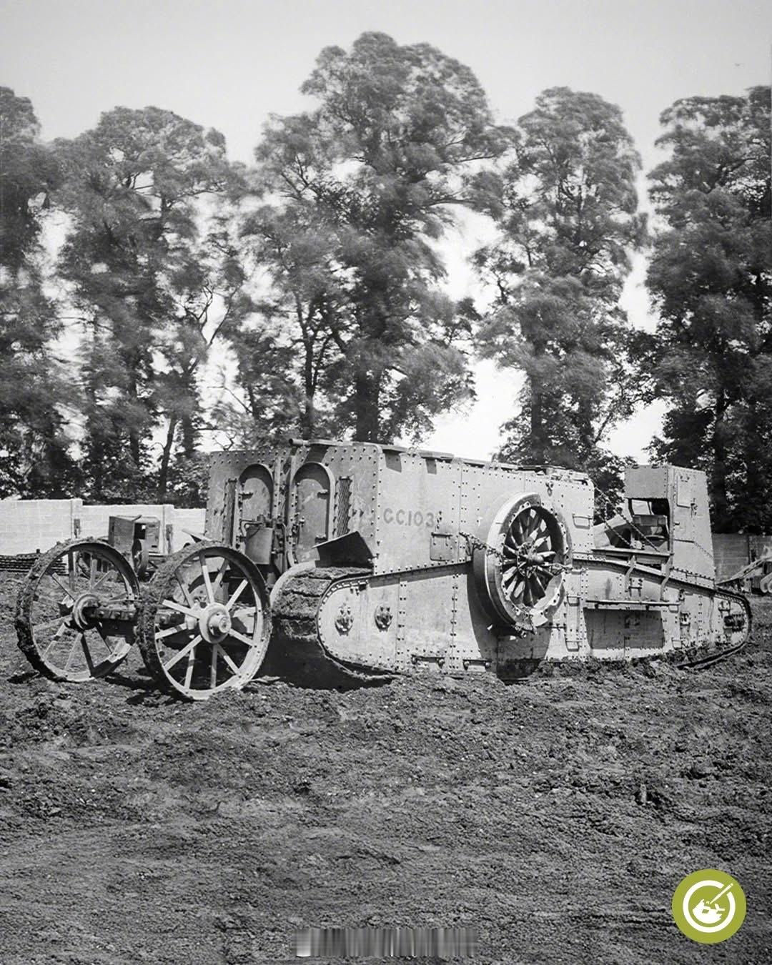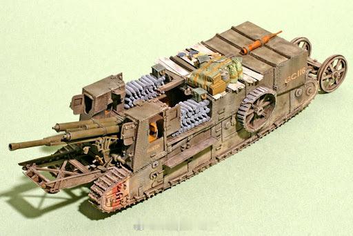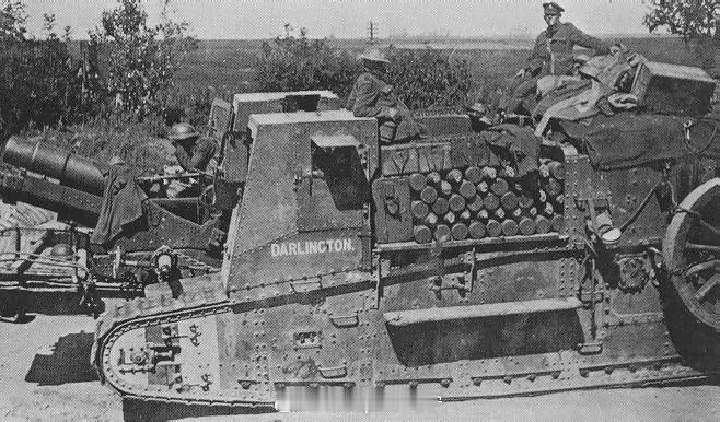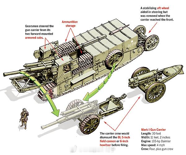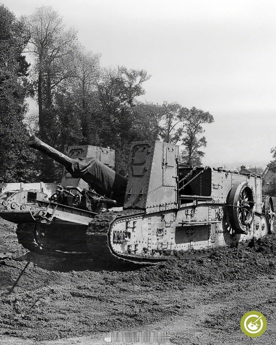 烽火问鼎计划每天认识一件兵器 自行火炮的研发早在第一次世界大战时期就已开始,英国研制出了Mk I型自行火炮运输车,图中所示即为配备6英寸榴弹炮的型号。该车辆体型庞大,能够为自身及其盟军运送数吨补给,同时还能提供炮火机动支援。Mk I型自行火炮运输车是英国在一战期间研制的一种机动车辆。其设计目的是在进攻后迅速将一门6英寸榴弹炮或60磅炮向前推进,以支援前沿阵地的步兵。炮车最早在皮尔克姆岭战役(1917年7月31日至8月2日)和第三次伊普尔战役(1917年7月31日至11月10日)期间投入使用。炮车可以运输火炮和装备,但在战争的其余时间里,其主要用途是在炮火密集的区域运送装备和补给,因为在开阔地带搬运物资的搬运工伤亡会非常惨重。6英寸榴弹炮可以在车上直接开火,这使得一型炮车成为第一种现代自行火炮,一种能够独立作战并在战场上具备战术机动性的武器。1916年初,西线的战术环境使得占领阵地的步兵疲惫不堪、组织混乱、补给短缺、与后方失去联系,无力击退反击。盟军的炮兵只能依靠拖拉机运输,而履带式装甲车则能让炮兵在德军炮火下也能行动自如。就职于大都会运输、车辆、货车和金融公司的工程师约翰·格雷格少校提议利用I型坦克的部件制造一种特殊的机械化炮兵。 3月7日,格雷格与曾参与I型坦克研发的发明家沃尔特·威尔逊少校开始着手设计。 最初,他们设想用这种装甲车运输BL 6英寸榴弹炮、8英寸榴弹炮或60磅炮(5英寸),但后来放弃了运输8英寸榴弹炮的想法。 1917 年 3 月 3 日,原型车在奥尔德伯里与其他实验车辆一起参加了坦克试验日的测试。原型炮架车Mark I(陆军部序列号GC 100)长9.1米,配备坦克Mark I的尾部转向机构;加上尾部和火炮,全长13米。车辆宽3.4米,高2.84米。炮架车履带宽520毫米,高约1.5米。空重27吨,由一台105马力(78千瓦)的戴姆勒发动机驱动(每吨3.9马力)。车辆采用坦克Mark I的变速箱,包括一个有两个前进挡和一个倒挡的主变速箱;每条履带配有两个速度的副变速箱。炮架车由一名车长、一名驾驶员和两名换挡员操作。装甲箱包裹着车辆的后半部分,并悬垂在穿过缺口的履带上方。车辆的前半部分有一个火炮平台,履带前方两侧各有一个装甲驾驶室,一个供驾驶员使用,一个供车长使用。该车辆续航时间约为11小时,在平坦路面上的最高速度为6公里/小时,可跨越宽度3.51米的战壕。由于空间有限,无法安装履带板,测试发现泥浆和碎屑会堵塞履带,刺穿上部结构,并损坏上方的散热器。一门6英寸榴弹炮或一门60磅炮可以通过绞车向后吊装到前方的炮台上并固定,卸下车轮后悬挂在炮架两侧。每门火炮携带60发炮弹,因此6英寸榴弹炮的重量为31吨,60磅炮的重量为35吨。后部的装甲箱可容纳8名炮组成员,每辆车都配备一挺机枪。格雷格和威尔逊的工作始于1916年3月7日,但必须获得总司令部的批准,该批准于1916年5月17日获得。军械委员会于1916年6月15日拒绝批准该设计,陆地战舰委员会秘书阿尔伯特·斯特恩向军需大臣大卫·劳合·乔治提出上诉。劳合·乔治否决了军械委员会的决定,并在第二天单方面订购了50辆战舰。1917年5月29日,陆军部下令:“……一种机动炮车,可以比马拉野战炮更靠近步兵……这种武器的目的是摧毁建筑物和工事。”原型车由大都会马车、货车及金融公司制造,于1917年1月1日完工。随后,利兹的基特森公司订购了49辆火炮运输车(1917年10月16日改为47辆火炮运输车和2辆救援车)。原型车的试验大约在1917年2月2日开始,并在绍伯里尼斯靶场进行了60磅炮的试射。1917年第二季度,6辆火炮运输车和2辆救援车交付给军队;第三季度交付14辆;第四季度交付29辆;最后5辆于1918年第一季度交付。火炮运输车的总价为16.8万英镑,2辆救援车的总价为1万英镑。变型车抢修车两个前置驾驶室被拆除,承载平台被覆盖,并配备了一台手摇起重机,可通过吊臂吊起3.0吨的货物,或通过剪切腿吊起10吨的货物。箱体前方有一个驾驶室,其后方是一个与发动机相连的卷筒,用于通过钢丝绳牵引;这两辆车的价格为10,000英镑。12月,第三辆车配备了一台普里斯特曼兄弟公司生产 的蛤壳式蒸汽抓斗。大卫·弗莱彻认为这是原型炮架运输车的履带底盘。炮架车 Mark II改进型炮架车Mark II的设计方案出炉,但仅制造了模型。车体占据了车辆长度的三分之二,载车平台移至车尾。车头部分的设计与坦克Mark IV和Mark V类似,履带前端抬高以便越过障碍物。该车计划采用一台150马力(110千瓦)的里卡多发动机,通过行星齿轮传动。火炮将安装在车尾,保留轮子,但不能从车上开火。GC 100型炮车在第三次伊普尔战役(1917年7月31日至11月10日)前抵达法国,并被编入第十八军进行实地测试。该炮车首次投入使用是在皮尔克姆岭战役(1917年7月31日至8月2日)中,其转向尾轮很快被拆除。在佛兰德斯战役期间,该炮车运送了数百吨弹药和数门60磅炮向前推进。至少有一次,GC 100型炮车发射了一发6英寸榴弹炮弹,随后改变位置迷惑了德军。第一炮车连于9月6日成立,极大地减轻了物资运输的负担,每辆炮车可运输7.1吨的货物,而这原本需要290人的搬运队才能完成。到年底,共有44辆炮车部署在法国。作为补给坦克,炮车比改装的Mark I和Mark IV坦克容量大得多,因此需求量一直很大。1917年11月20日康布雷战役开始时,有7辆炮车可供使用。1918年6月,两个炮车连被改编为补给连,并