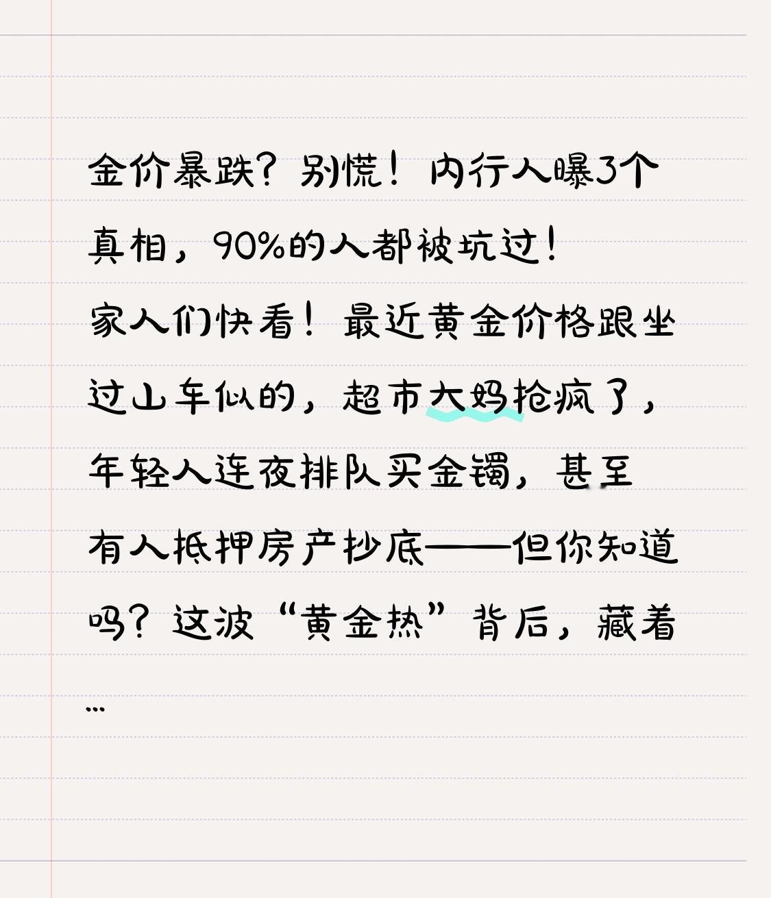金价暴跌?别慌!内行人曝3个真相,90%的人都被坑过! 家人们快看!最近黄金价格跟坐过山车似的,超市大妈抢疯了,年轻人连夜排队买金镯,甚至有人抵押房产抄底——但你知道吗?这波“黄金热”背后,藏着3个让你血本无归的陷阱,很多人已经亏惨了! 前几天小区张阿姨兴冲冲跟我说,她在某直播间抢了“399元一克的足金项链”,比金店便宜一半,结果拿去检测才发现,所谓的“足金”居然是镀金,里面全是铜合金,几千块钱打了水漂!其实不止张阿姨,最近后台收到好多粉丝吐槽,有人买的“投资金条”被收高额手续费,有人跟风买黄金基金,短短一周亏了20%,还有人以为买黄金稳赚不赔,结果套牢在高点。 你以为这就是最坑的?还有更离谱的!很多商家打着“金价暴跌”的幌子,把18K金当足金卖,用“一口价”黄金隐瞒克重,甚至用“免费以旧换新”吸引顾客,实则偷偷扣折旧费、工艺费,最后算下来比原价还贵!更让人想不到的是,现在连黄金回收都有套路,商家用“八两秤”“虚报纯度”压价,明明是足金,却被说成是K金,一克少给几十块钱。 其实黄金不是不能买,而是要避开这些坑!内行人教你3个实用技巧:第一,买黄金只看“足金999”或“Au999”标识,一口价黄金尽量别碰,按克买才划算;第二,投资黄金优先选银行金条,手续费低、变现方便,别跟风买黄金饰品,工艺费太高;第三,回收黄金一定要选正规门店,提前查好当天金价,现场称重、全程录像,避免被坑。 黄金自古以来就是硬通货,但不是所有人都能靠它赚钱。与其盲目跟风抄底,不如先摸清行业规则,理性消费才是王道。如果你也买过黄金,或者有过被坑的经历,欢迎在评论区分享你的故事,让更多人避开陷阱!觉得这条视频有用的,别忘了点赞转发给身边的家人朋友,一起做聪明的消费者!