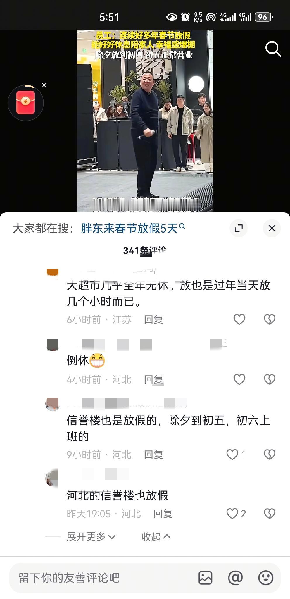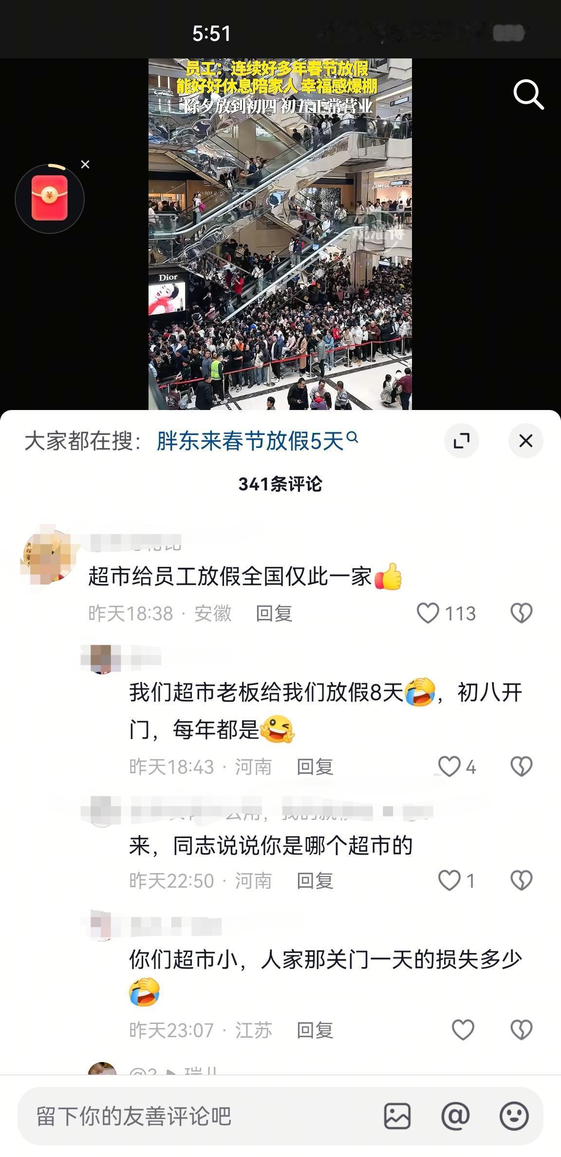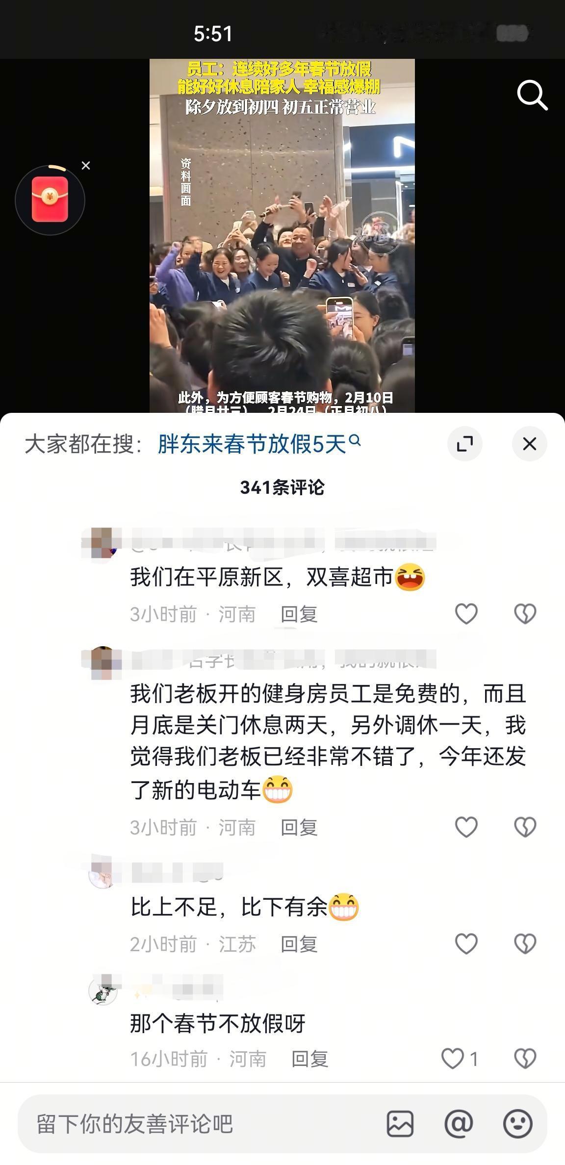 胖东来因为过年放假5天又上热搜了,我发现胖东来随便一个话题都可以上热搜,这个过年放假5天去年就已经上过。 胖东来真不愧是易上热搜体质,每隔一段时间都会因为有个话题冲上热搜,底下的评论也基本上都是清一色好评。 这次因为过年放假5天上了热搜,其实这已经是很多人都知道的视频,胖东来从2022年在全国火了后,基本上每年过年都有过相关热搜。 网友们评论超市给员工放假胖东来是独一份,这样的评论不下10条,从话语中听出了满满的自豪感。 然而有网友说自己所在的超市给员工放假8天,还有河北另一家超市过年也有假期,相信全国超市过年放假的绝对还有,只不过没有上热搜的机会。