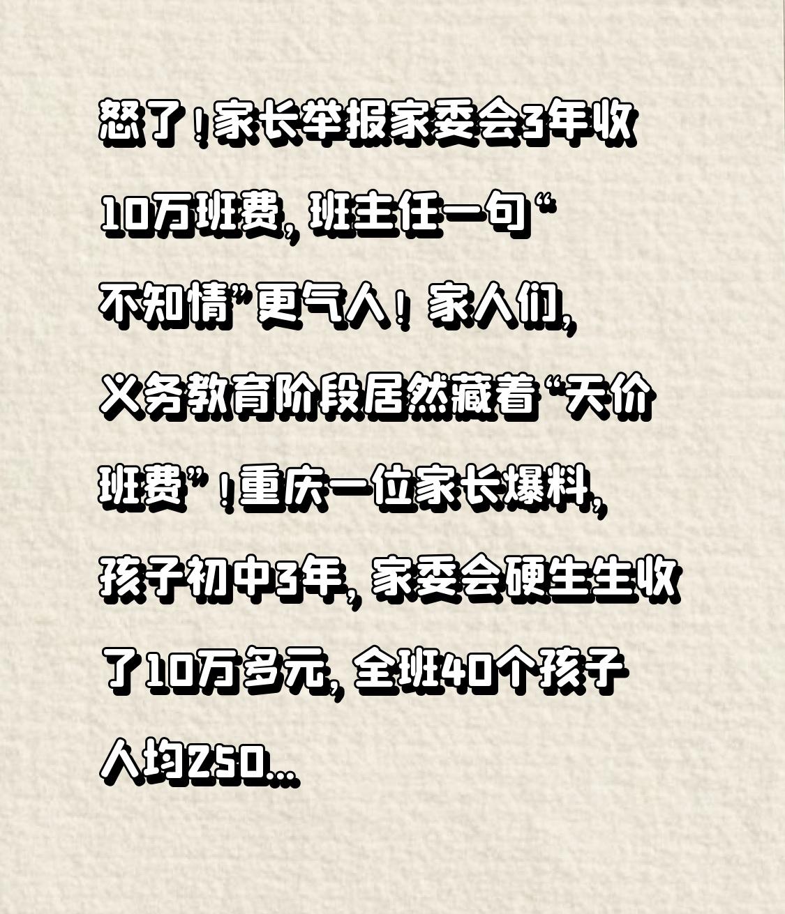 怒了!家长举报家委会3年收10万班费,班主任一句“不知情”更气人! 家人们,义务教育阶段居然藏着“天价班费”!重庆一位家长爆料,孩子初中3年,家委会硬生生收了10万多元,全班40个孩子人均2500多,这到底是服务班级还是变相敛财? 事情越扒越让人震惊!举报家长说,孩子刚上初一,家委会就开始收费,不是一次性缴清,而是“用完就收”,光2025年就收了4次,每次500块,理由全是“资料费超支”“打印费不够”。从曝光的明细来看,钱全花在了教辅资料和文印上:《高分突破》《星火英语》一本本买,单次打印费最高接近5000块,说是要印老师自编的复习资料。 可最让家长崩溃的是,自己家庭困难,实在扛不住频繁收费,在群里提了句质疑,却没人回应——其他家长要么怕得罪家委会,要么觉得几百块不算事,只能硬着头皮交。更讽刺的是,班主任面对质疑,一边否认“收了这么多”,一边甩锅“家委会管钱,我不知情”,这话谁听了能不气? 就在大家骂家委会“乱收费”时,反转来了!教育部早就明确规定:严禁通过家委会向家长收费,讲义、文印费本该由学校经费承担,根本不能额外收!重庆市也早就要求,家委会不能替代学校收费,就算自愿收,也得全体家长同意+公示票据。可涉事家委会既没投票,也没正规票据,所谓的“公开透明”只是一张模糊的表格,完全踩在了政策红线上。 更让人揪心的是,这不是个例!半个多月前,重庆另一所中学也被曝家委会乱收费,还让家长交现金、不公示明细,最后被认定违规退费。为啥家委会敢这么嚣张?说白了就是学校监管缺位,班主任“睁一只眼闭一只眼”,把教学该承担的成本,转嫁给了家长。 现在渝中区教委已经介入调查,但网友的怒火没消:“义务教育是减负,不是让家委会变着法收钱”“家境不同,怎能一刀切收费?”“班主任一句不知情,就想推卸责任?” 其实家长要的不是零收费,而是明明白白的规矩——收费合不合规?钱花得值不值?能不能照顾困难家庭? 家委会本该是家校沟通的桥梁,不是“收费代理”;班费可以有,但不能成为家长的负担、学校的甩锅工具。教育的公平,不该被模糊的账单打破。如果你也遇到过家委会乱收费,欢迎在评论区吐槽,点赞转发让更多人关注,一起守住义务教育的底线!