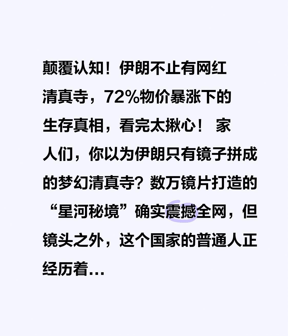 颠覆认知!伊朗不止有网红清真寺,72%物价暴涨下的生存真相,看完太揪心! 家人们,你以为伊朗只有镜子拼成的梦幻清真寺?数万镜片打造的“星河秘境”确实震撼全网,但镜头之外,这个国家的普通人正经历着前所未有的生存考验,72%的物价涨幅,让一顿饱饭都成了奢望! 前段时间,设拉子绿镜清真寺的视频刷爆社交平台:数万块镜片拼接成几何迷宫,绿色穹顶折射出璀璨星河,走进去仿佛闯入科幻大片,关键还免费开放,工作人员会送祈福小饼干,堪称波斯美学的天花板。无数网友留言“列入人生必去清单”,却没人知道,离这座梦幻清真寺不远的街头,面包价格已经翻倍,普通家庭连鸡蛋都快吃不起了。 你敢相信吗?伊朗里亚尔十年贬值超95%,现在1美元能换147万里亚尔,2015年能买一套房的积蓄,如今连一袋面粉都买不起。2025年食品价格暴涨72%,牛肉涨到17美元一公斤,普通工人月薪才70美元,辛苦一个月只能买4公斤肉。更让人揪心的是,40%的进口药品断供,抗癌药价格翻倍,慢性病患者只能用鸡蛋、手工艺品换药,医院连基本的抗生素都短缺。 可就在民生如此艰难时,却藏着让人愤怒的反差:伊朗革命卫队控制着57%的GDP,垄断石油、电信等核心产业,还享受免税特权,而政府给民众的每月补贴只有48元人民币,连两公斤面粉都买不到,被网友嘲讽为“用汽油灭火”。2025年底,德黑兰大巴扎商户集体闭店抗议,数百万人走上街头,诉求从“要面包”升级为对治理的质疑,可美国的军事威胁又让民族主义情绪迅速抬头,民众一边骂物价飞涨,一边又团结起来抵御外部干涉,这种矛盾让人心疼又无奈。 但即便在绝境中,伊朗人也没丢了骨子里的韧性。他们搞“以物易物”,用鸡蛋换药、地毯换燃油;多户人家挤在一起共享取暖,焚烧废旧轮胎抵御寒冬;1900万人靠加密货币保值,边境居民冒着风险从邻国走私面粉。而绿镜清真寺里,信徒依然在光影中虔诚祈祷,工作人员依旧会给游客递上暖心饼干,这种在苦难中坚守信仰与善意的模样,让人瞬间破防。 伊朗就像一面双面镜,一面是镜片拼接的璀璨星河,一面是物价飞涨的生存困境。我们羡慕它的极致美学,更该看见它背后的挣扎与坚韧。每个国家都有不为人知的艰难,每个普通人都在为生活拼尽全力。如果你被伊朗人的韧性打动,就点赞转发,让更多人看见这个国家的真实模样。你心中的伊朗是什么样子?欢迎在评论区留言讨论!