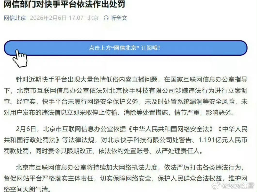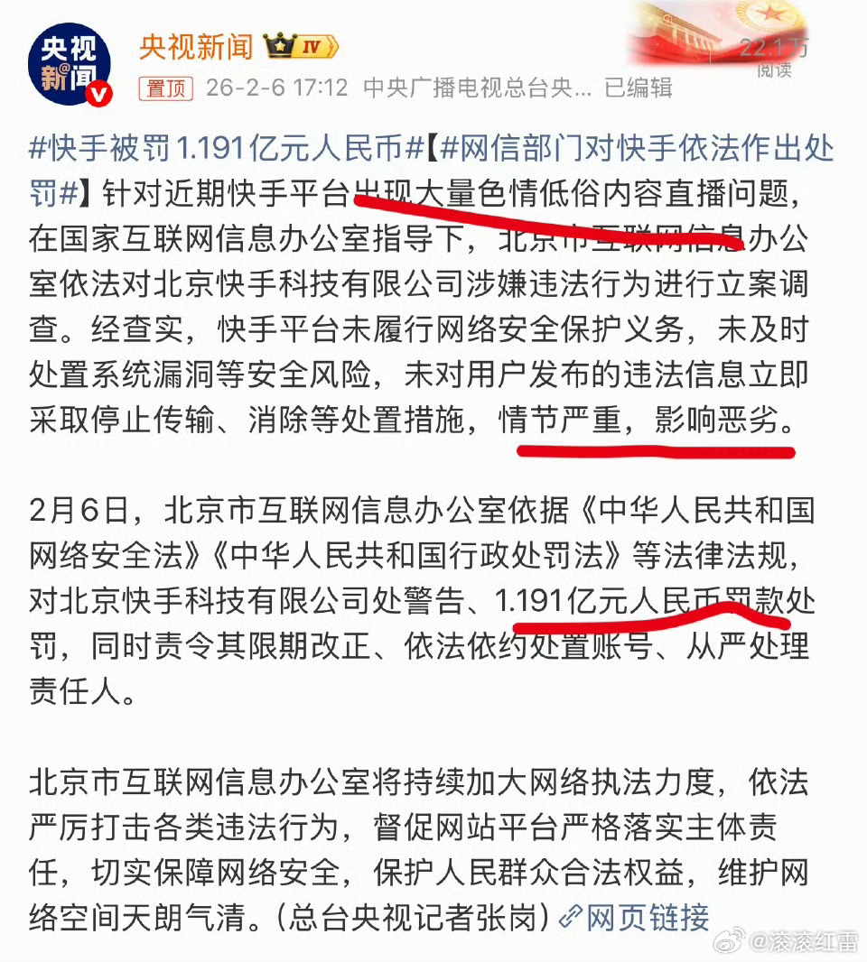 快手被罚1.191亿元人民币终于出手了,直播全是色Q低俗内容,快手情节严重,影响恶劣,已对快手立案调查,被罚款1.191亿! 重拳出击