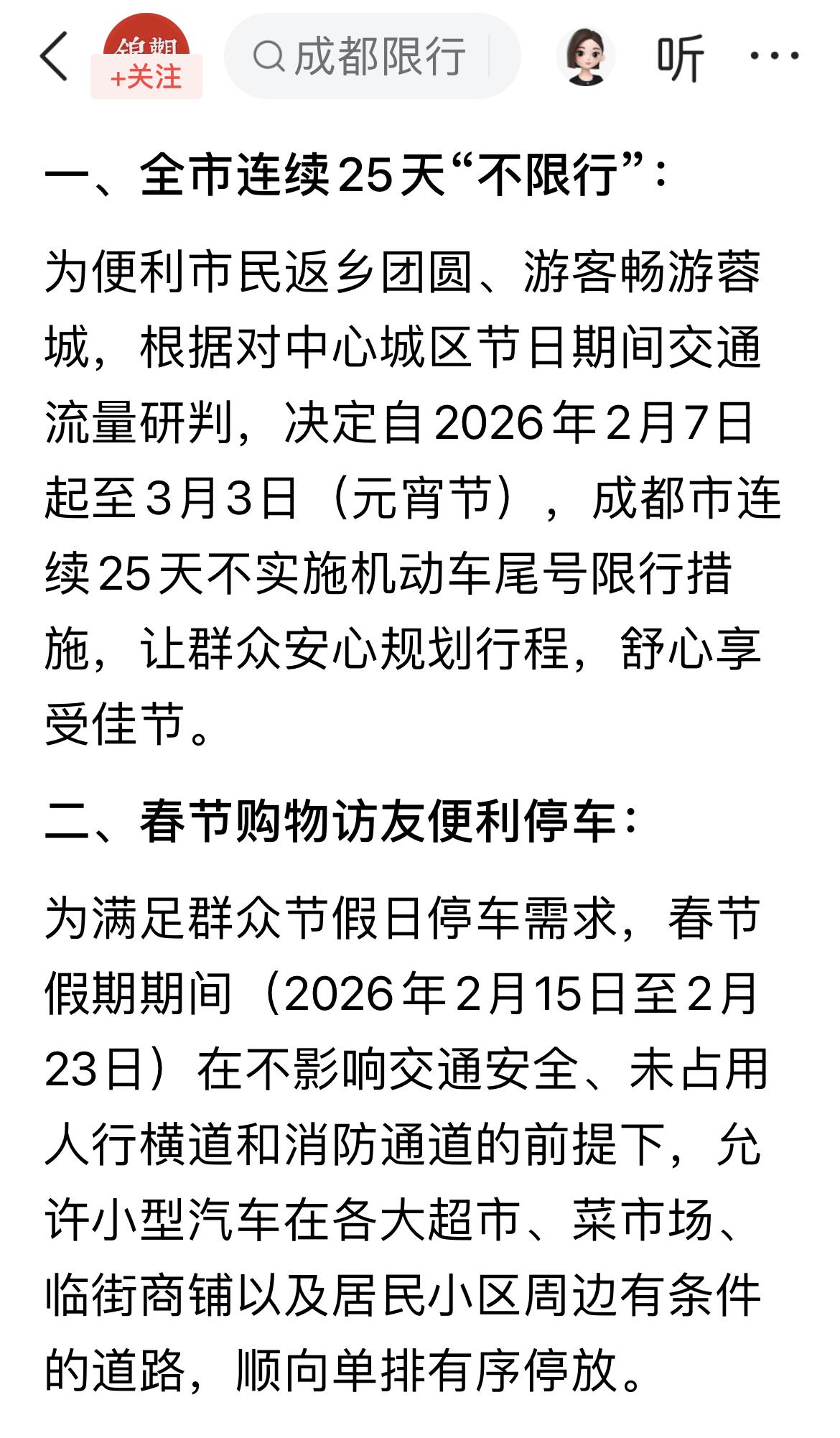 好消息,成都过年大礼包:明日起25天不限行,过节9天有序靠边停车不开罚单! 今天,成都交管局发布多项春节期间的交通便利政策。 1、2月7日(腊月二十)到3月3日(正月十五),不尾号限行。 2、国家法定春节假期2月15(腊月二十八)到2月23(正月初七),路边有序靠边停车不开罚单。 3、轻微违法以批评教育为主。 同时还有多项便民措施,让你过一个更加愉快的春节!