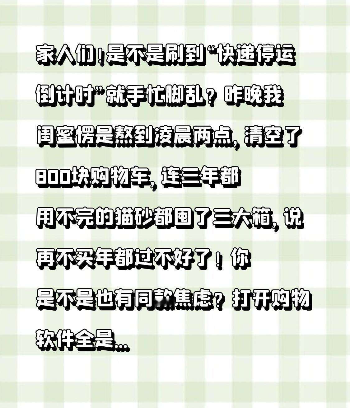 家人们!是不是刷到“快递停运倒计时”就手忙脚乱?昨晚我闺蜜愣是熬到凌晨两点,清空了800块购物车,连三年都用不完的猫砂都囤了三大箱,说再不买年都过不好了! 你是不是也有同款焦虑?打开购物软件全是“最后3天发货”“停运不等人”,刷朋友圈有人囤半年纸尿裤,有人抢二十件非必需品,连洗衣液都按箱搬,生怕春节断供。快递站点更是忙到疯,分拣员说“女性当男性用,男性当机器用”,东北、新疆不少网点都被逼得主动拦截订单,这阵仗比双十一只吓人。 但我今天必须拆穿这个骗局!国家邮政局早就明确说了:严禁快递“一刀切”停运,2026马年春节主流快递全是“不打烊”模式!那些喊着“2月1日全网停收”的,全是商家的饥饿营销套路,转头就在店铺角落标着“全年无休”。 真正的情况是:顺丰、京东、邮政这些巨头,除夕都正常派件,中通、圆通等通达系也只是偏远乡镇网点弹性休息,主城区照样收发。至于加价,也不是坐地起价,国家允许明码标价,顺丰首重最多加6块,邮政EMS才加3块,比你乱囤货浪费的钱少多了。 想想那些冲动消费的后果:同款保温杯买仨,围巾囤四条,猫砂堆到阳台落灰,过期货品只能扔。咱们总被“怕断供”的焦虑牵着走,却忘了超市春节不关门,外卖随叫随到,快递就算停几天,日子照样过。 春节的意义,从来不是快递箱堆成山,而是一家人围坐的团圆饭,是走亲戚时的真心问候。那些靠囤货找的安全感,不如陪爸妈逛次菜市场来得实在。 今年春节,别再被商家套路了!刚需慢慢买,年货早规划,认准官方通知就够了。评论区说说,你为“快递停运”做过最离谱的囤货是什么?有没有刷物流刷到失眠的经历?点赞转发,告诉身边人别再傻囤了,让这个年过得从容又舒心!