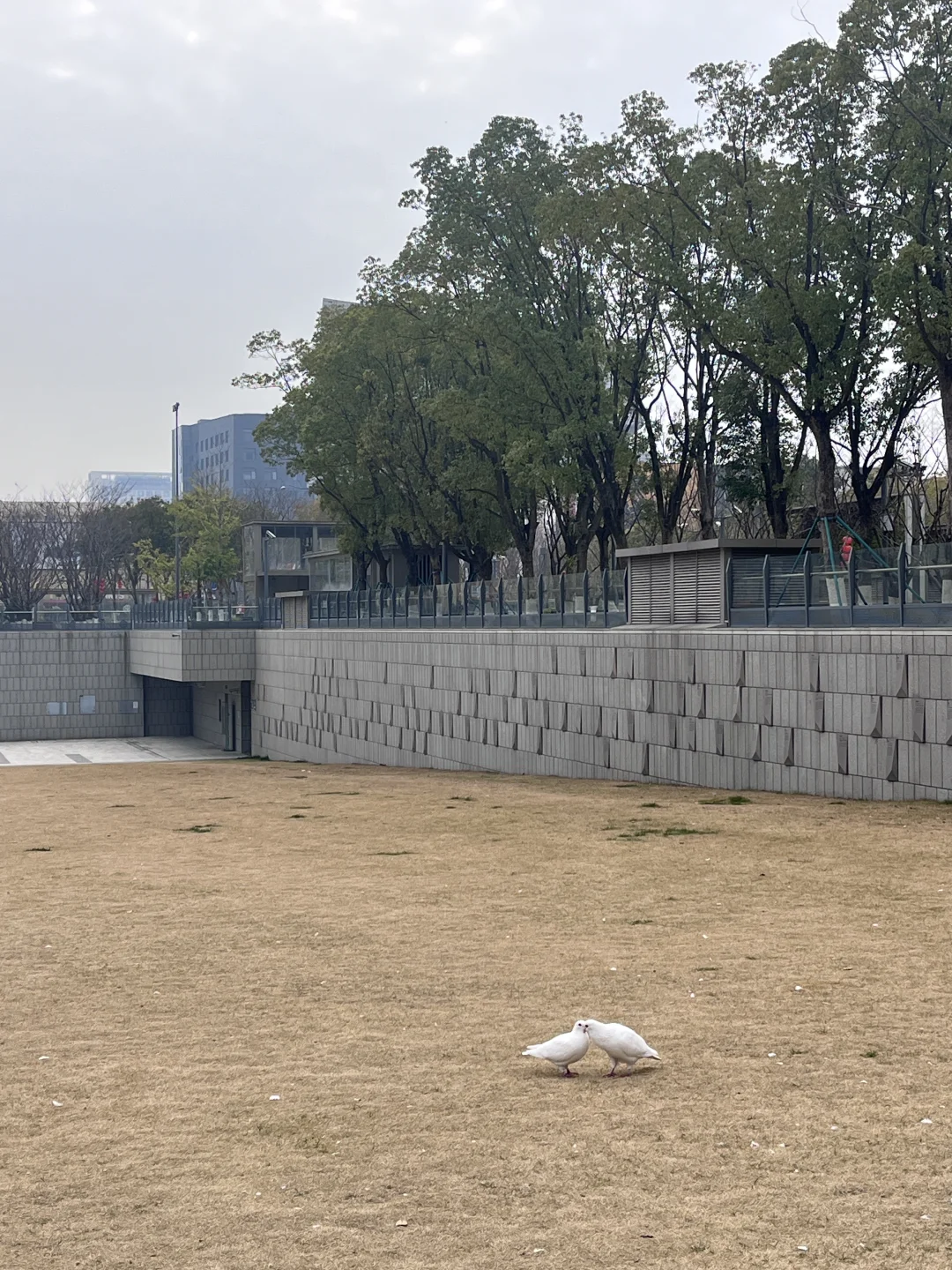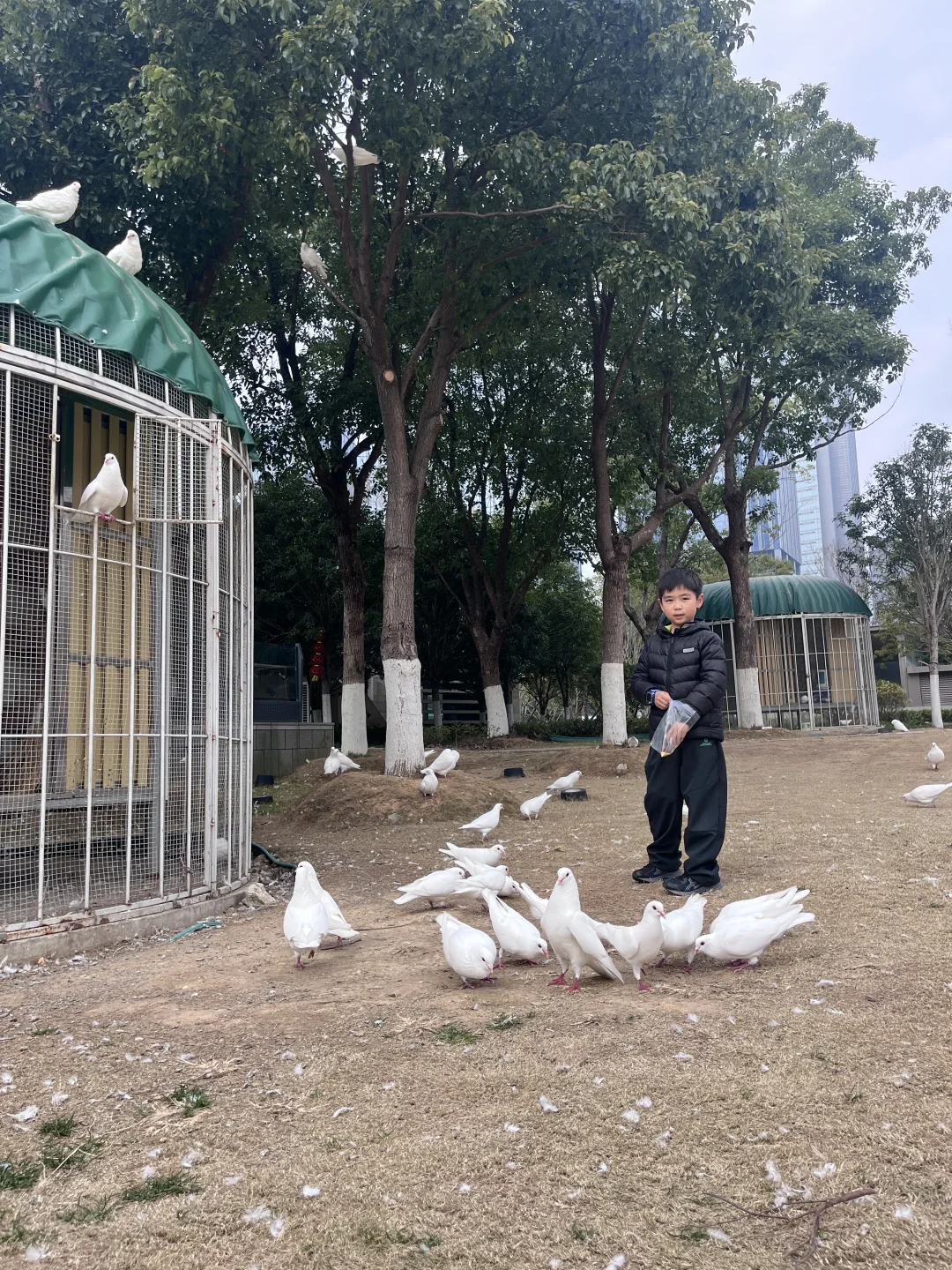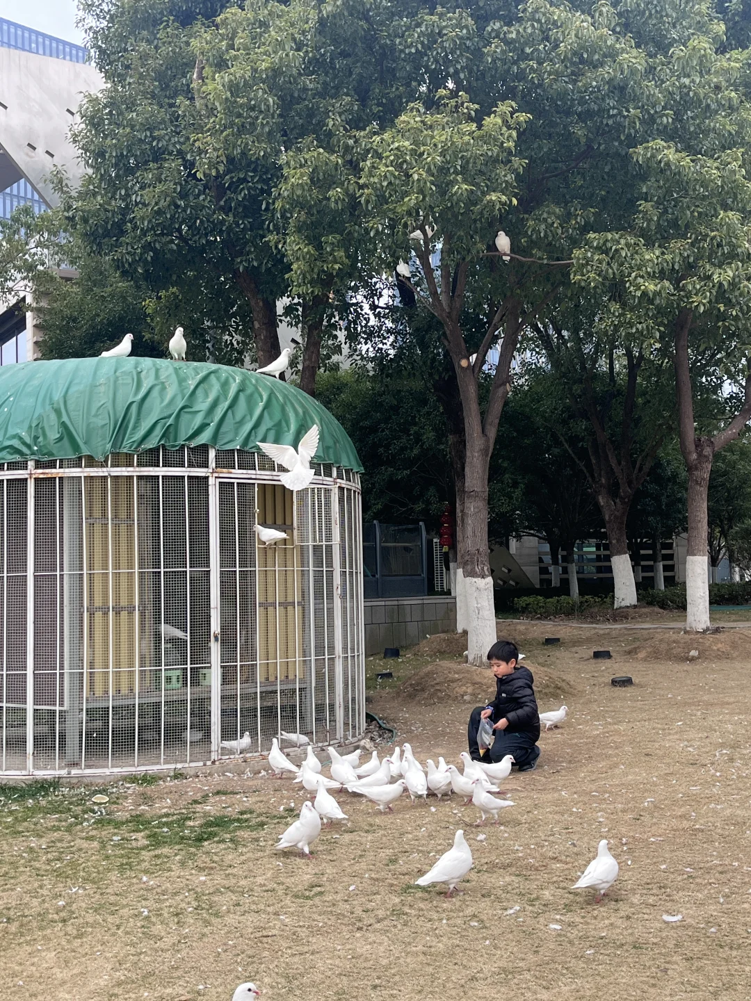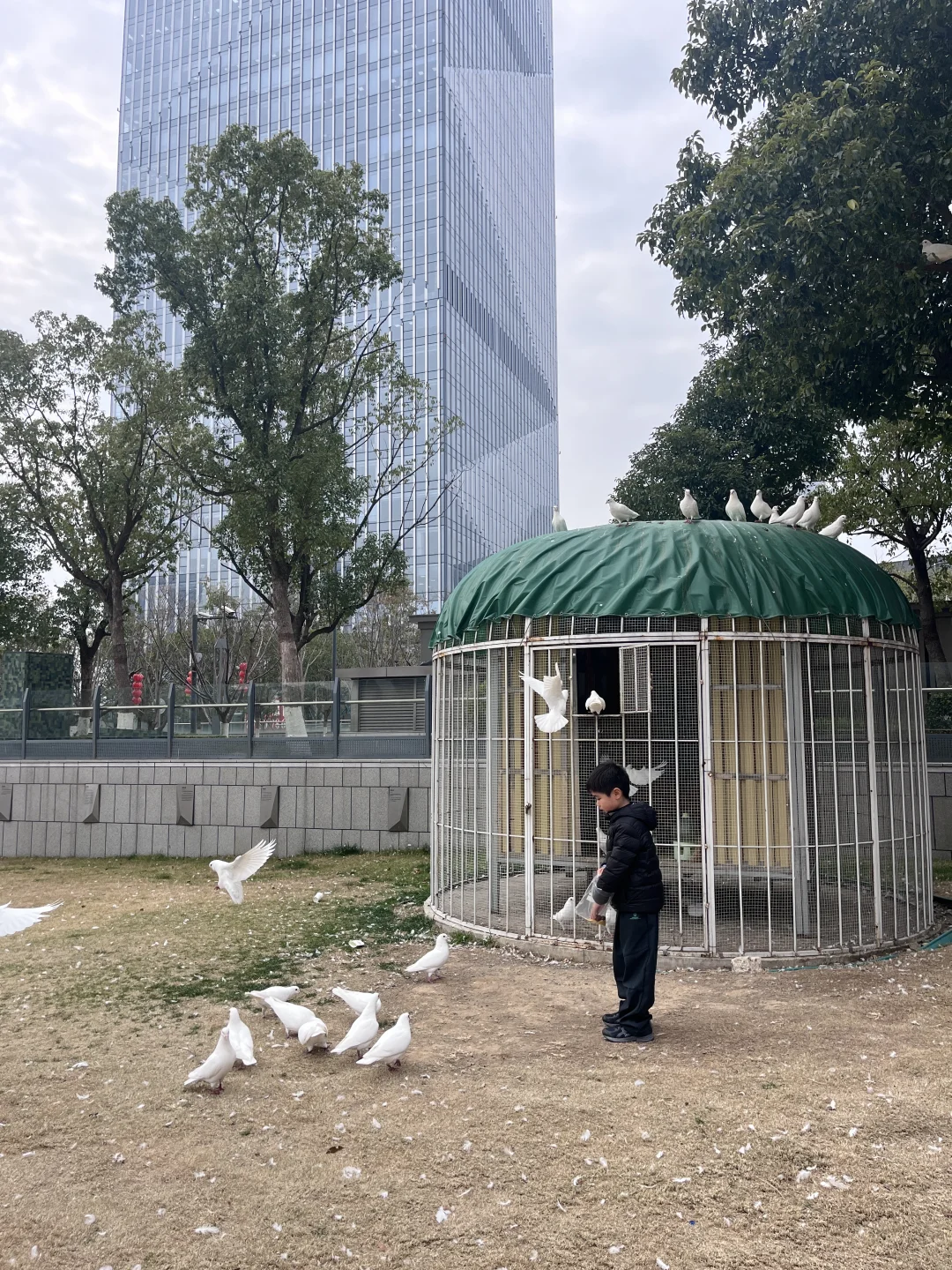 一个会反复去的小公园⛲️ 下沉广场有两个超大鸽子笼 胖乎乎的鸽子飞来飞去也太治愈了吧🐦 今天带儿子来喂鸽子 特意从家里带了山姆有机小米 鸽子们吃得超香 娃也玩疯了 我就负责在长椅上摆烂旁观 抬头撞见一对鸽子在亲热 还把“第三者”无情赶走 又好笑又有点现实是怎么回事😂 阳光、微风、小可爱 简单的快乐最治愈✨