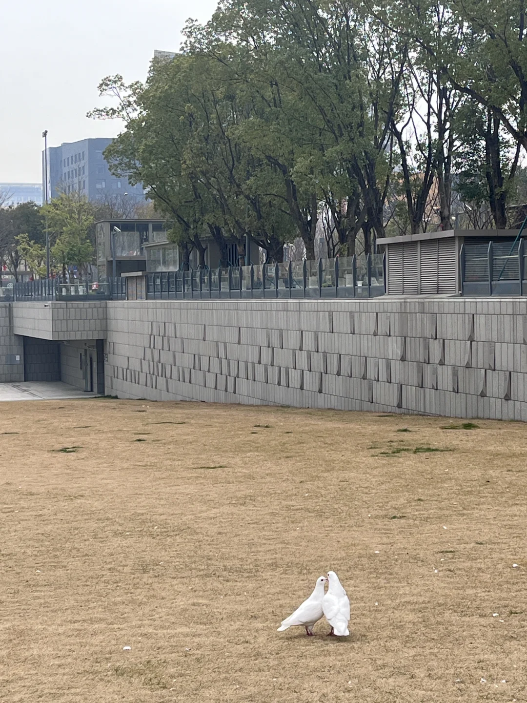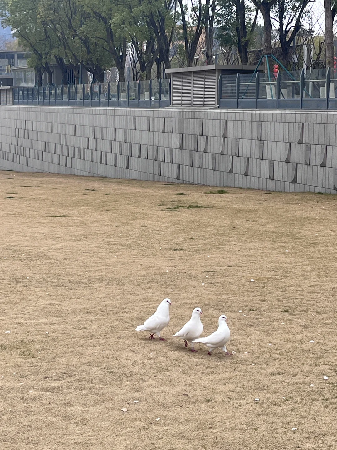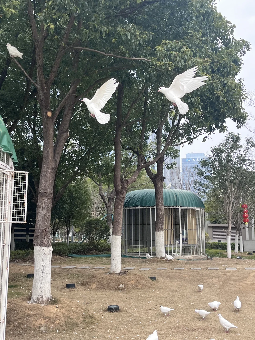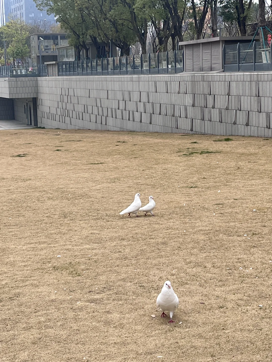 一个会反复去的小公园⛲️ 下沉广场有两个超大鸽子笼 胖乎乎的鸽子飞来飞去也太治愈了吧🐦 今天带儿子来喂鸽子 特意从家里带了山姆有机小米 鸽子们吃得超香 娃也玩疯了 我就负责在长椅上摆烂旁观 抬头撞见一对鸽子在亲热 还把“第三者”无情赶走 又好笑又有点现实是怎么回事😂 阳光、微风、小可爱 简单的快乐最治愈✨