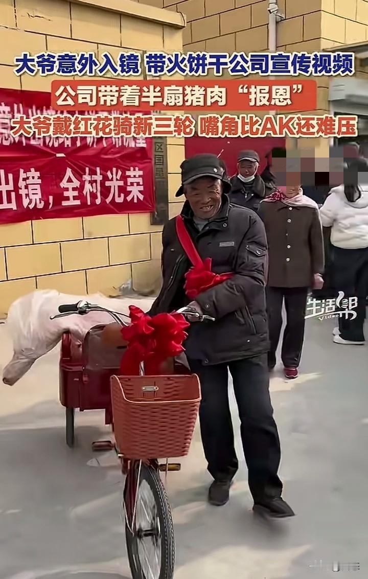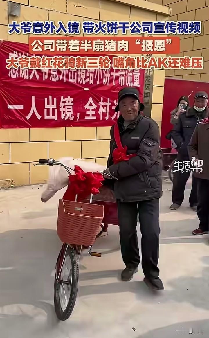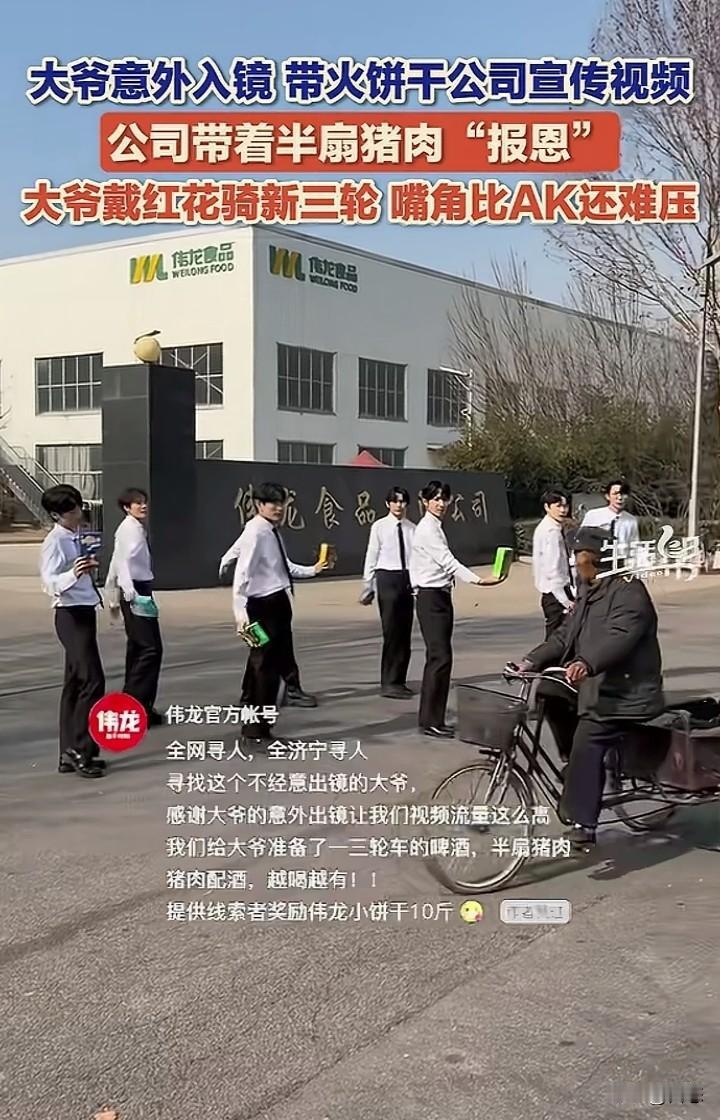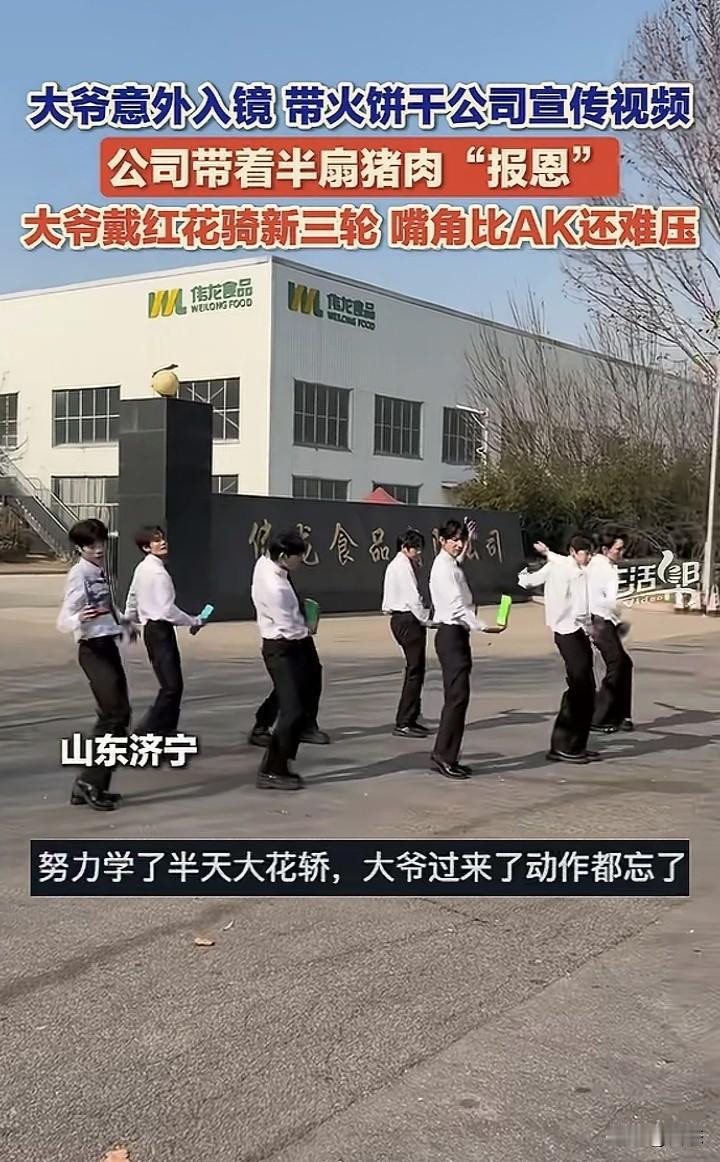 大爷路过拍视频宣传食品公司的镜头,没想这家食品公司被大爷带火了。 一饼干公司在公司门口拍宣传片,一群年轻人在跳大花轿,一大爷骑着三轮单车路过,意外进入镜头。没想到一经发布引起广大网友热议。 视频火了后,食品公司寻找大爷,找到大爷后,还送了半边猪肉,还有一三轮车啤酒。大爷也很开心,没想到无心之举居然帮助了这家公司。 说实话有时候就是机缘巧合,想不火都难。你大爷还是你大爷! 你们怎么看呢?为什么大爷会带火这公司呢?
