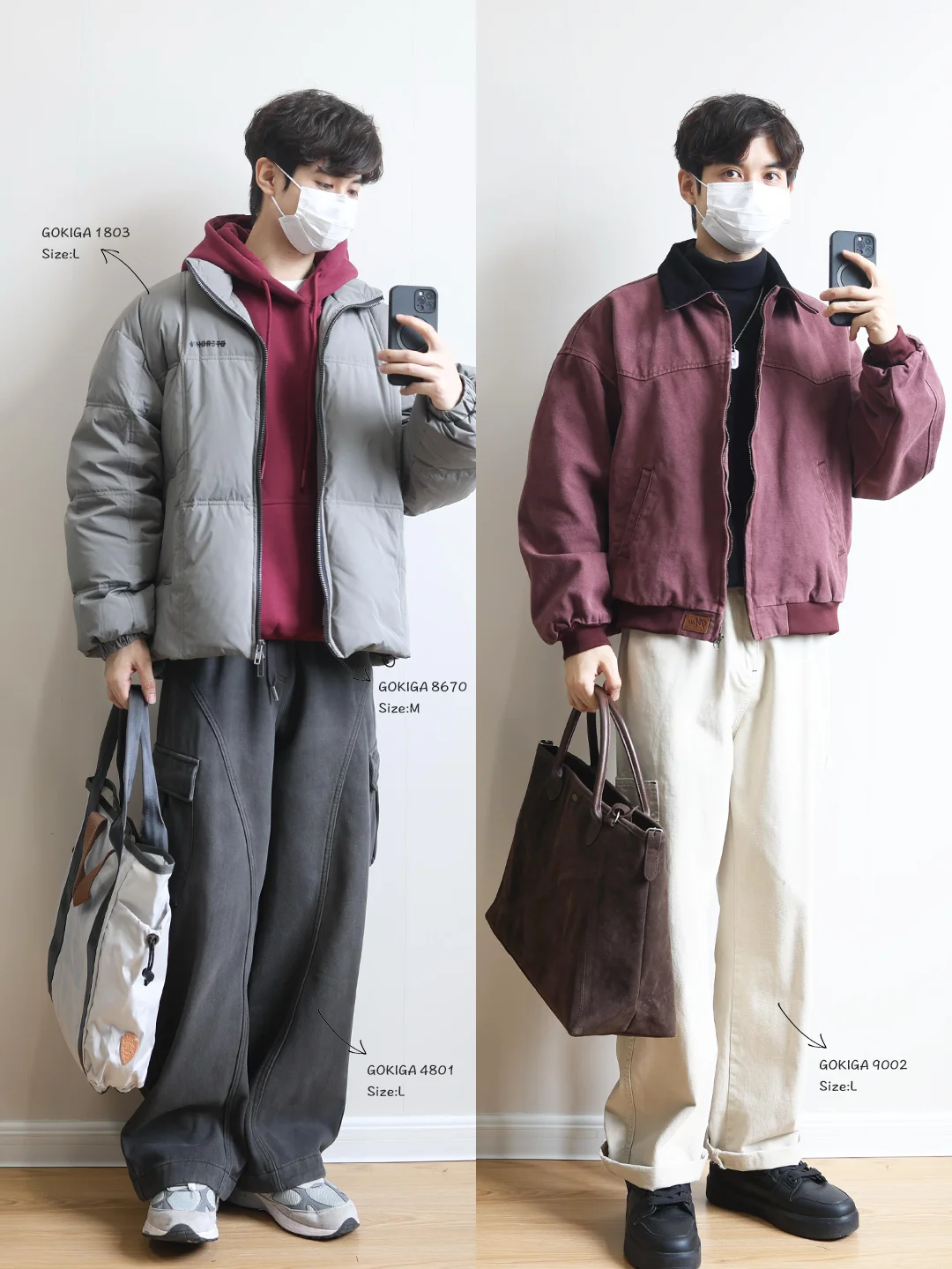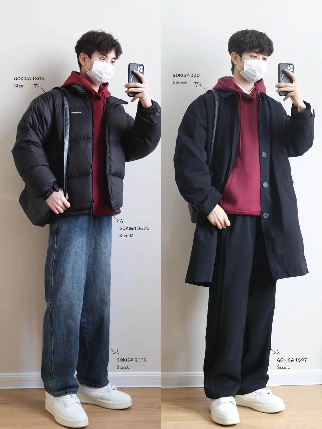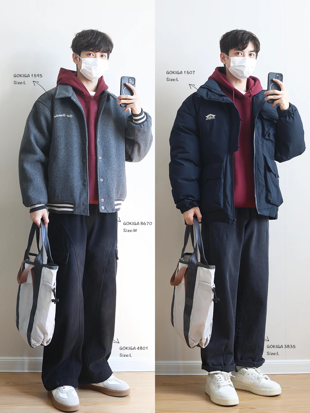 藏青棉服➕红色连帽卫衣➕深灰工装裤