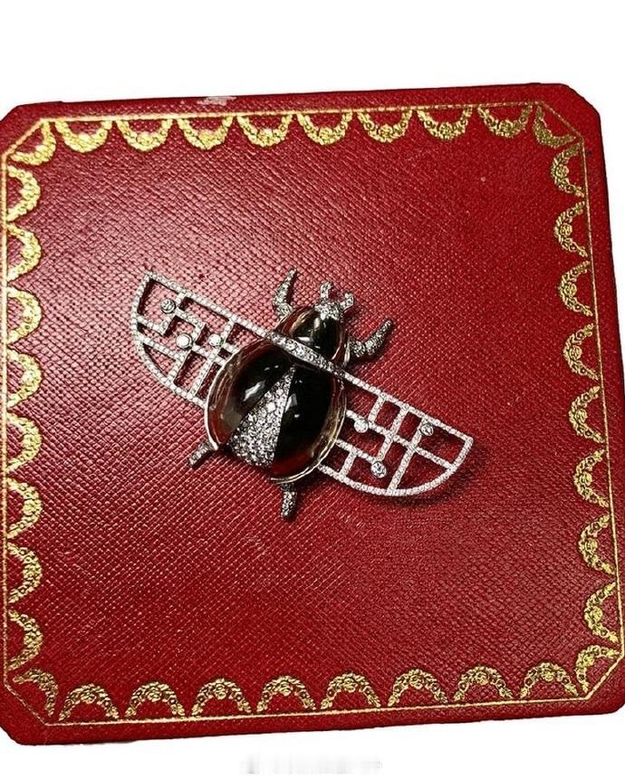 卡塔尔王妃莫扎(现任埃米尔塔明的亲妈)的圣甲虫胸针,由卡地亚的洛伦兹·鲍默在1999年为新千年到来而设计,体现了古代象征意义与现代科技的对话(?),全球限量30枚 虫子外壳材质说似乎有差,其他就是碎钻了。莫扎起码有俩烟晶的,看着相当大,她早年见过用两只来装饰头巾,前两天又戴了一只 佳士得2016年曾以12.5w港币的价格卖过一枚,说逼格很高还限量但价格也没想象中高。个人是get不到这种设计,怕虫子的同学不要细看