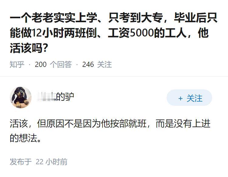 一个老老实实上学、只考到大专,毕业后只能做12小时两班倒、工资5000的工人,他活该吗?